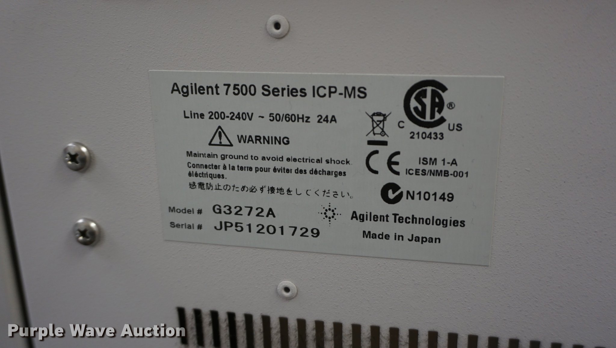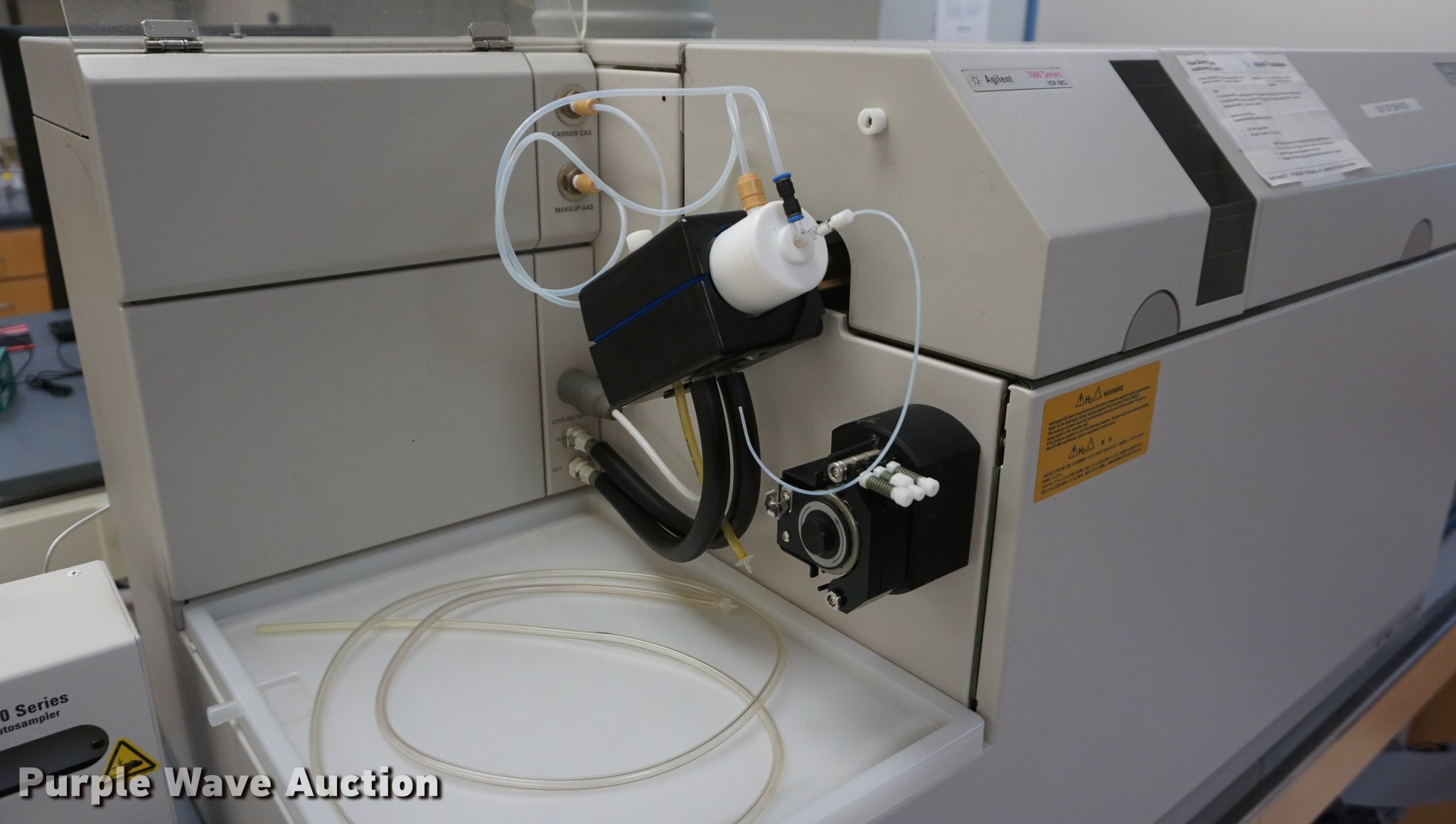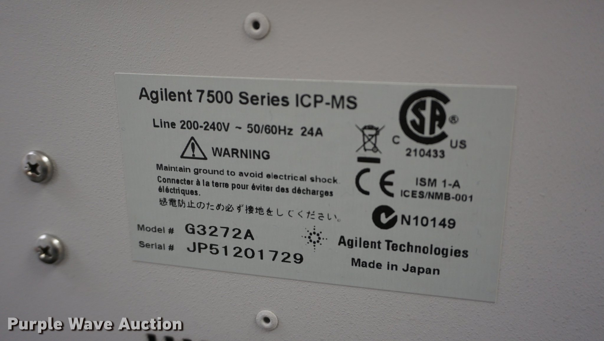 Purple Wave is selling a used Office Supplies and Equip. in Kansas. This item is a Agilent 7500 Series ICP-MS lab testing machine with the following: Model G3272A, Agilent ASX-500 seriesl ICP-MS auto sampler, HP computer, Printer, Edwards vacuum pump, Machine tools and supplies, Printing supplies, Serial JP51201729, Unit# JCW1