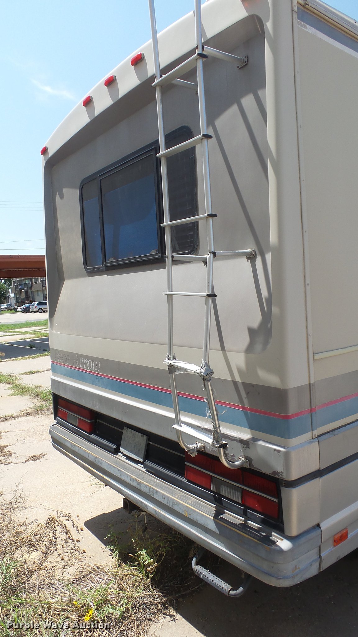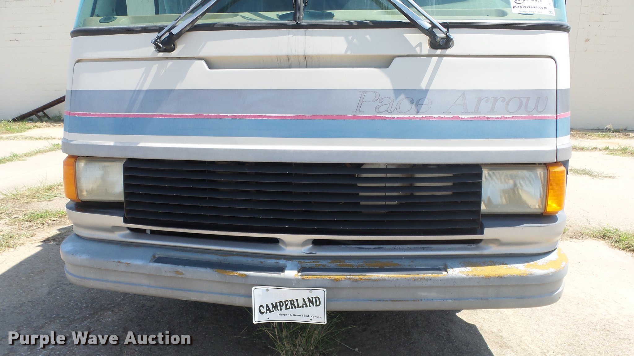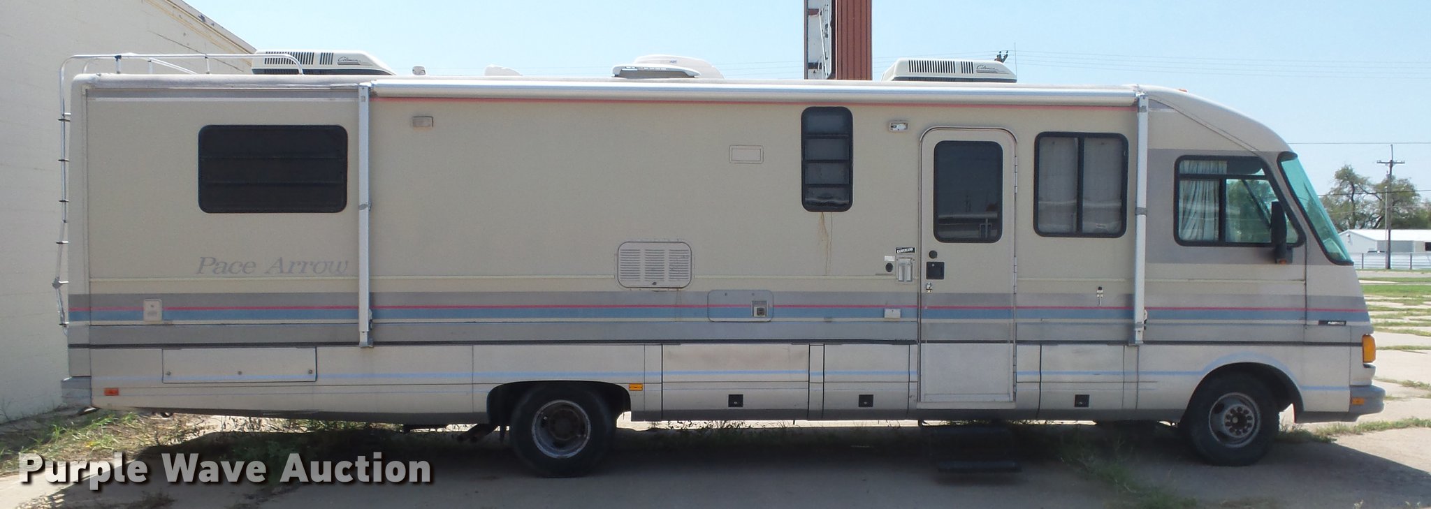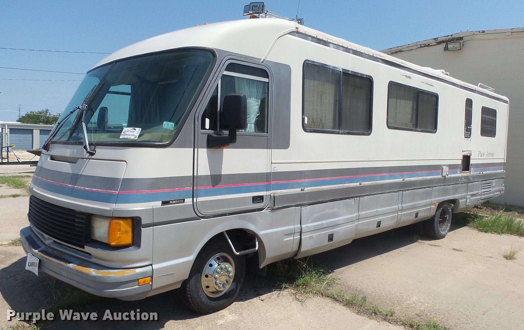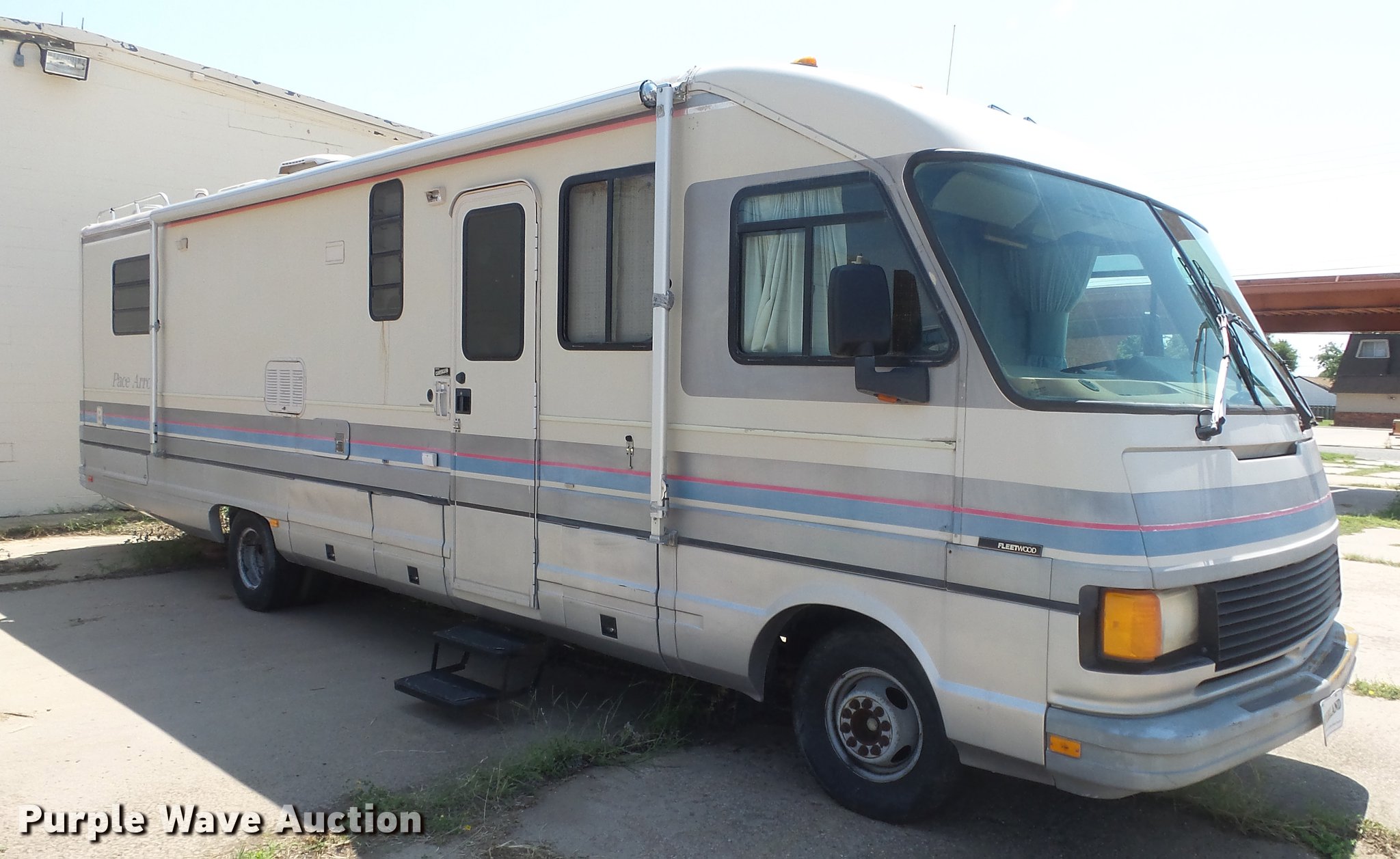 Purple Wave is selling a used RV in Kansas. This item is a 1990 Ford Fleetwood Pacer RV with the following: 43,790 miles on odometer, Gas engine, Automatic transmission, AC and heat, Power windows, locks, and mirrors, Kitchen, Sink, Oven, Stovetop, Microwave, Refrigerator/freezer, Bathroom, Shower, Table, Television, Onan 6500 generator, Gas engine, Awning, Receiver hitch, Trailer wiring, 235/85R16 tires, Dead battery