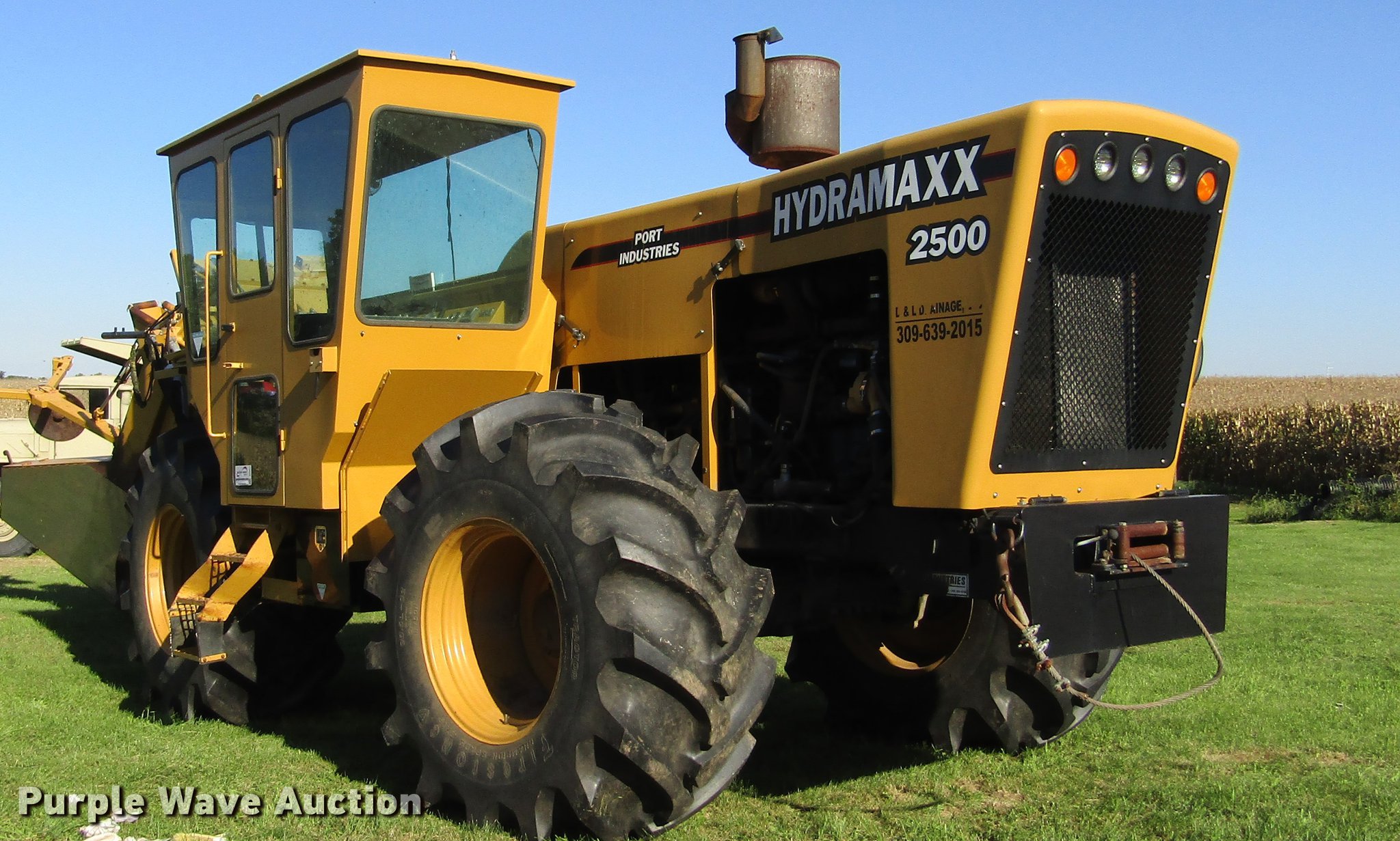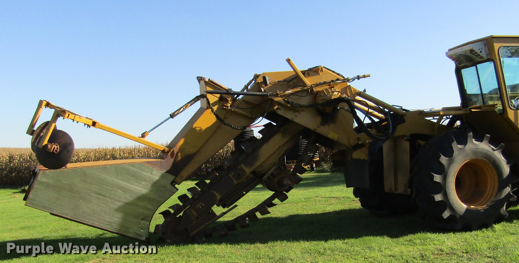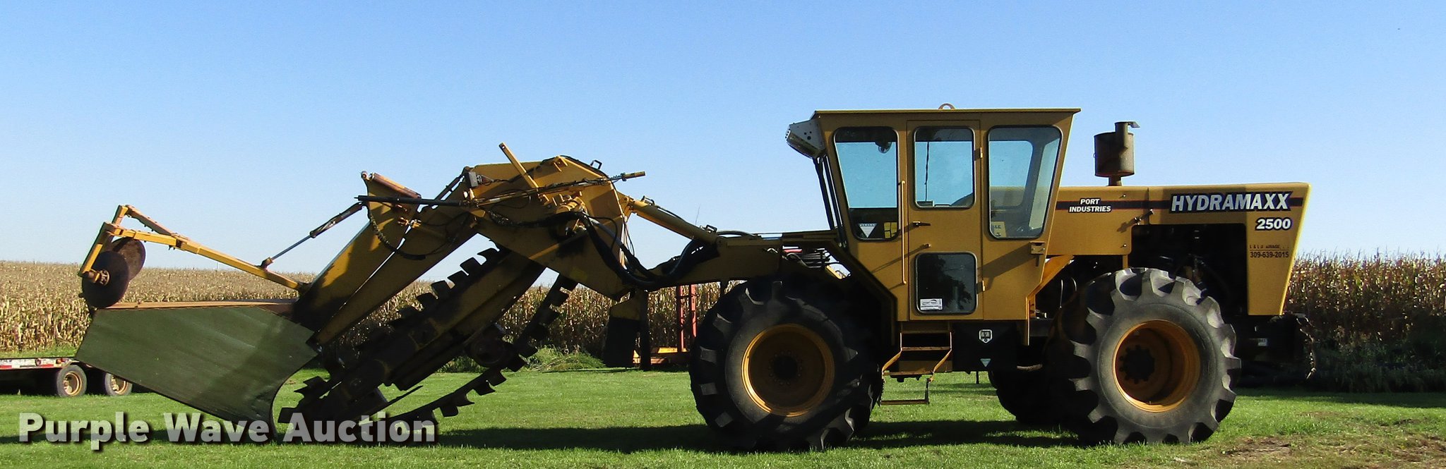 Purple Wave is selling a used Trencher or Rock Saw in Illinois. This item is a 2009 Hydramaxx 2500 trencher with the following: 2,334 hours on meter, John Deere 12.5L six cylinder turbo diesel engine, 425 HP, Serial RG6125H059724, Hydrostatic transmission, 2F-2R gears, Enclosed cab, AC and heat, Rotating suspension seat, Front and rear work lights, Cab camera, 7' digging depth, 19" end idler diameter, (3) HDS 100mm chains, 9" cutting width, 16" cutting width, 24" cutting width, 4", 8", and 12" tile boots, Tulsa H18G-SLRFX winch, 1" cable, 20,000 lbs capacity, Serial 00000024, Wired for GPS, Firestone 30.5L-32 tires, Tire chains, Serial 15