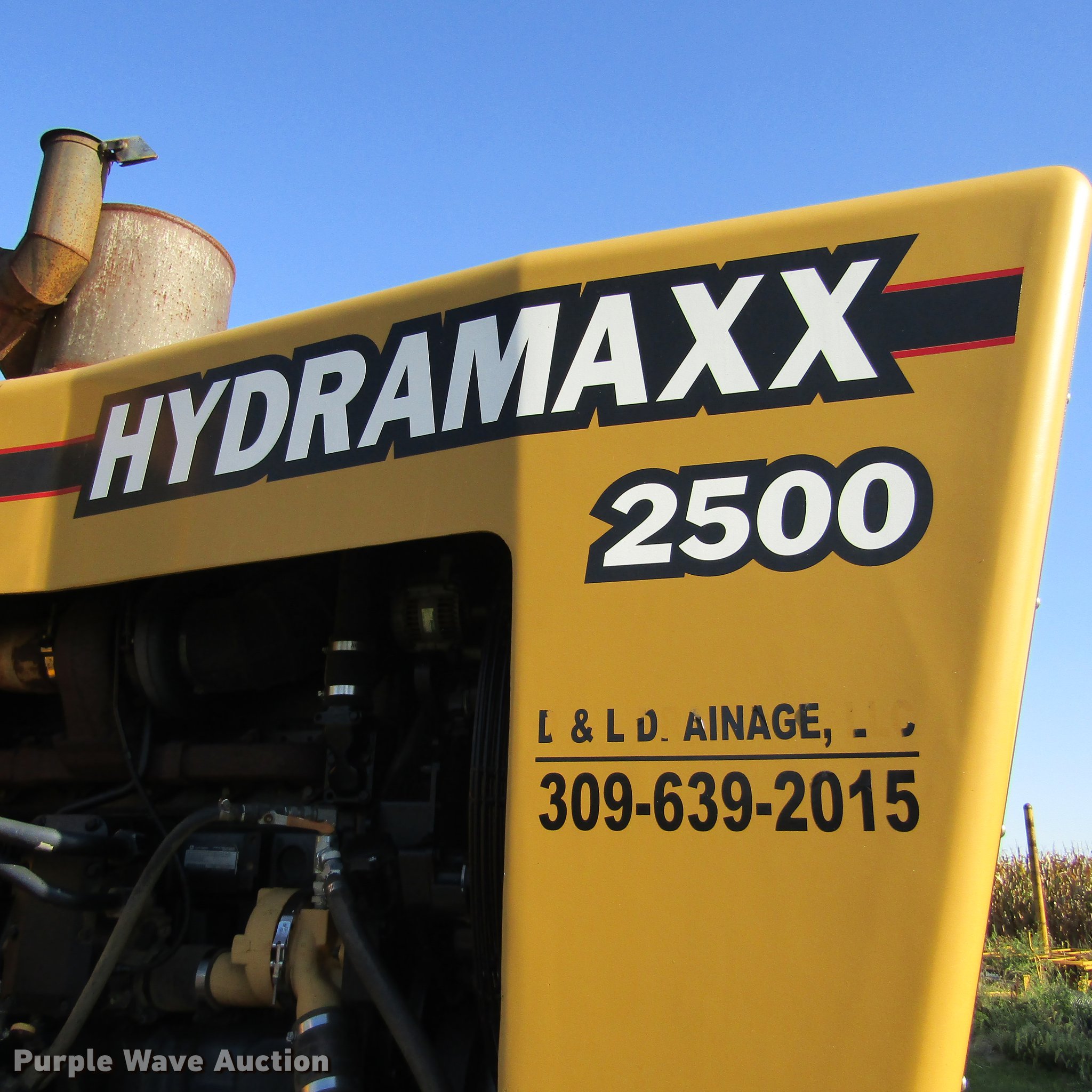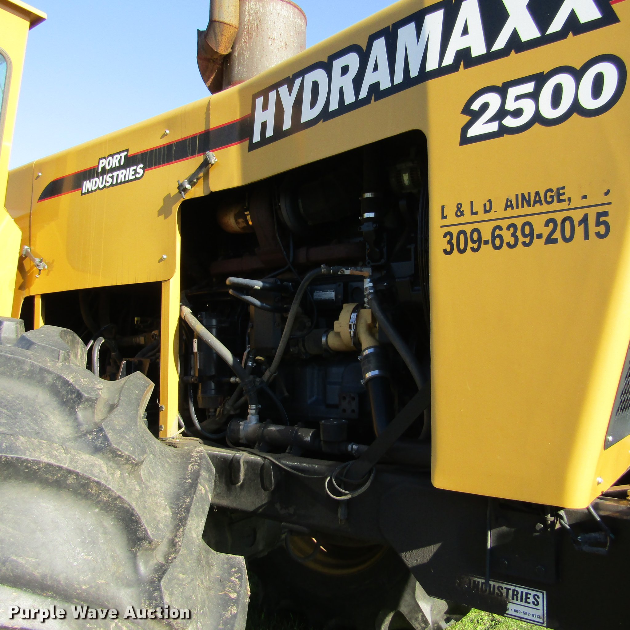 2009 Hydramaxx 2500 trencher. 2,334 hours on meter, John Deere 12.5L six cylinder turbo diesel engine 425 HP, Serial RG6125H059724, Hydrostatic transmission 2F-2R gears, Enclosed cab, AC and heat, Rotating suspension seat, Front and rear work lights, Cab camera, 7' digging depth 19" end idler diameter, (3) HDS 100mm chains 9" cutting width, 16" cutting width, 24" cutting width, 4", 8", and 12" tile boots, Tulsa H18G-SLRFX winch 1" cable, 20,000 lbs capacity, Serial 00000024, Wired for GPS, Firestone 30.5L-32 tires Tire chains, Serial 15. D&L Drainage. Williamsfield, IL 61489