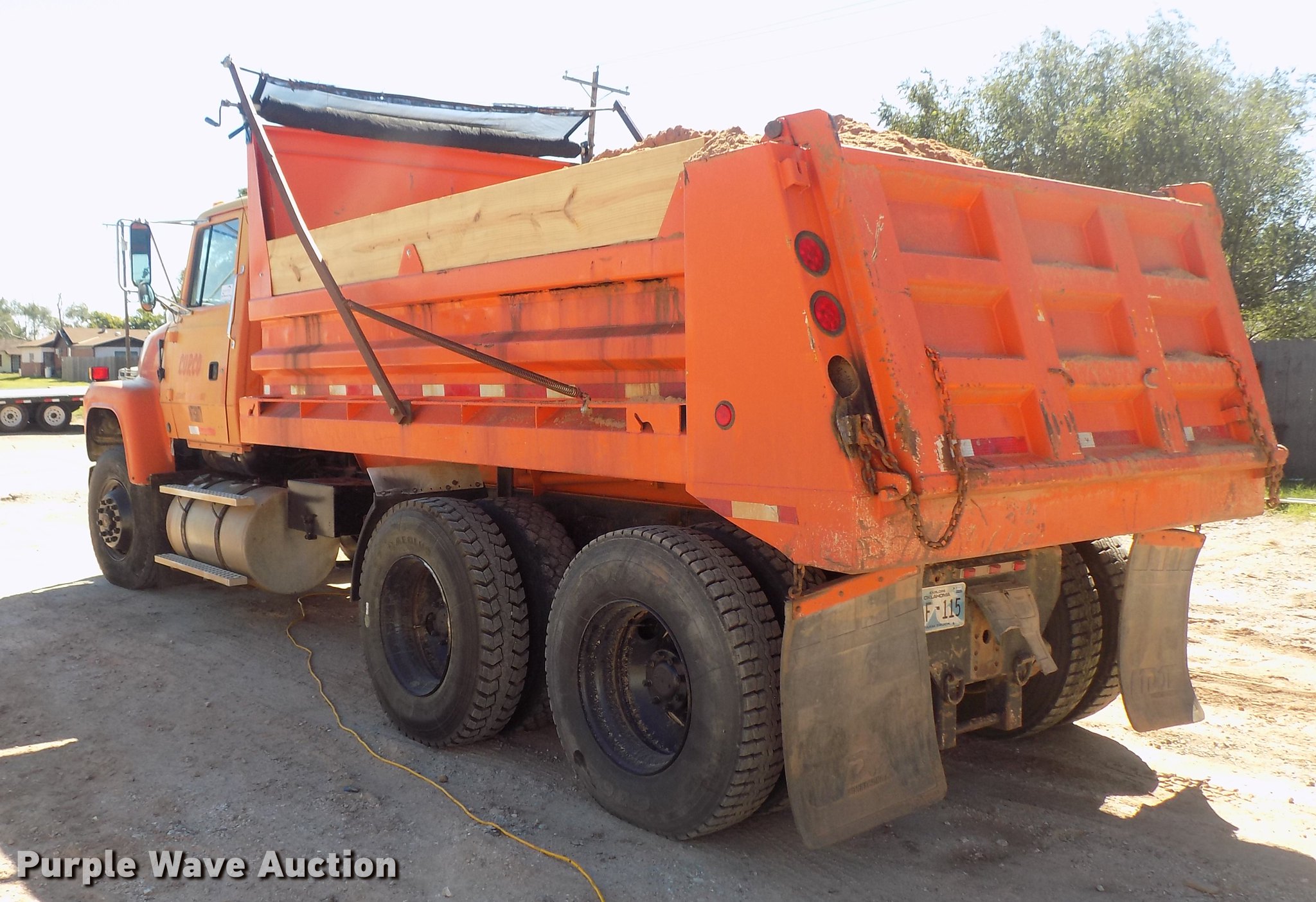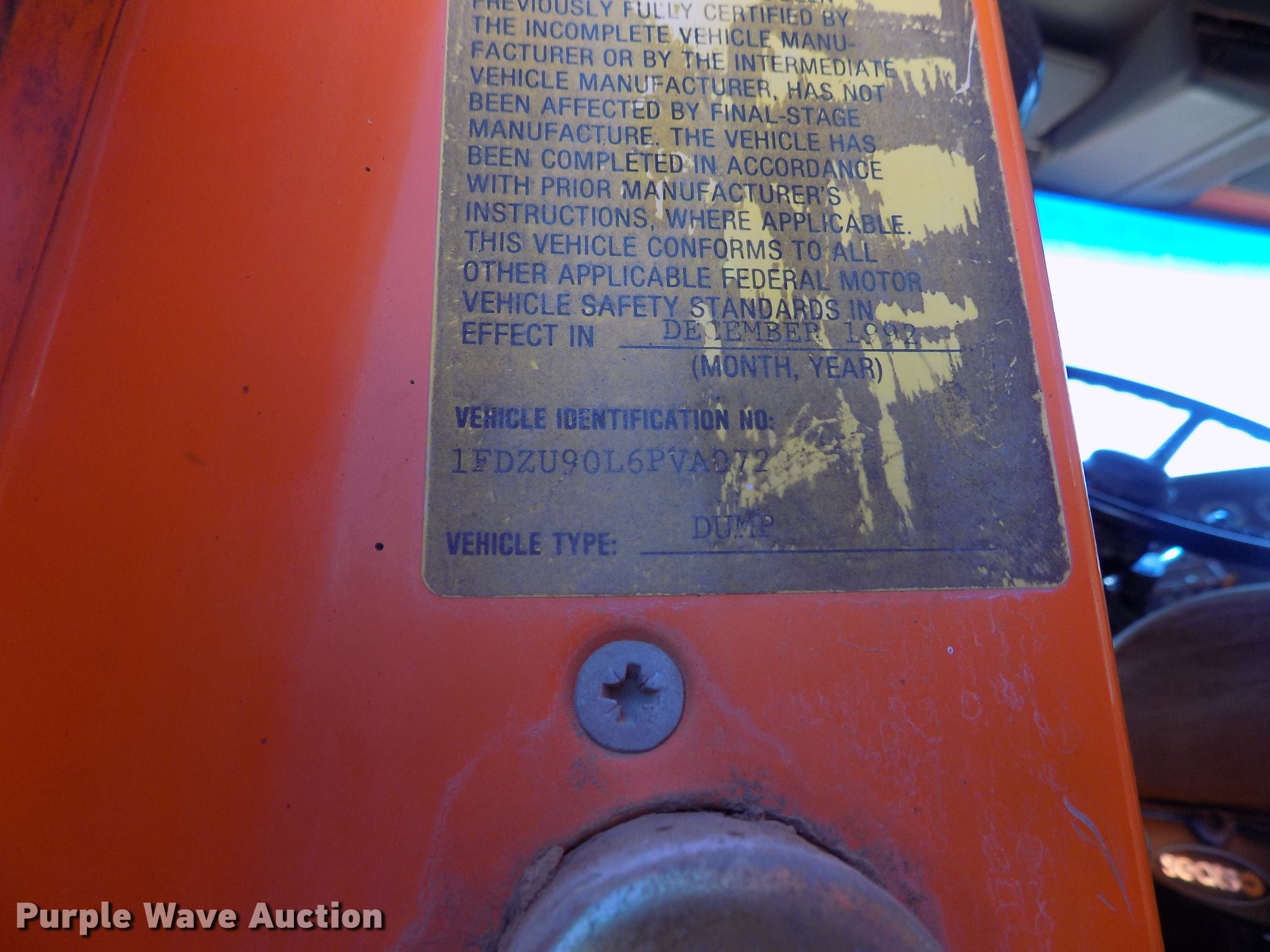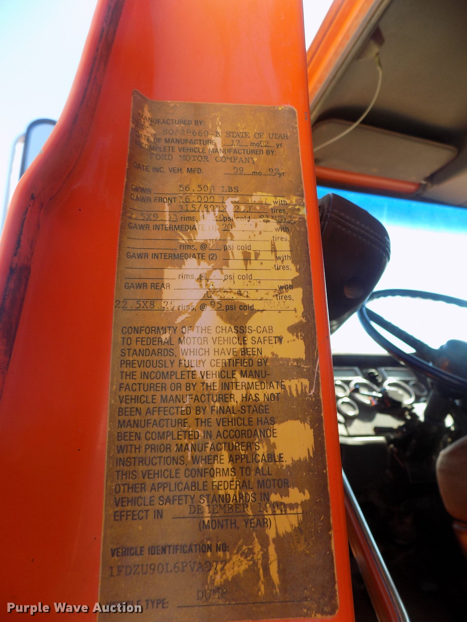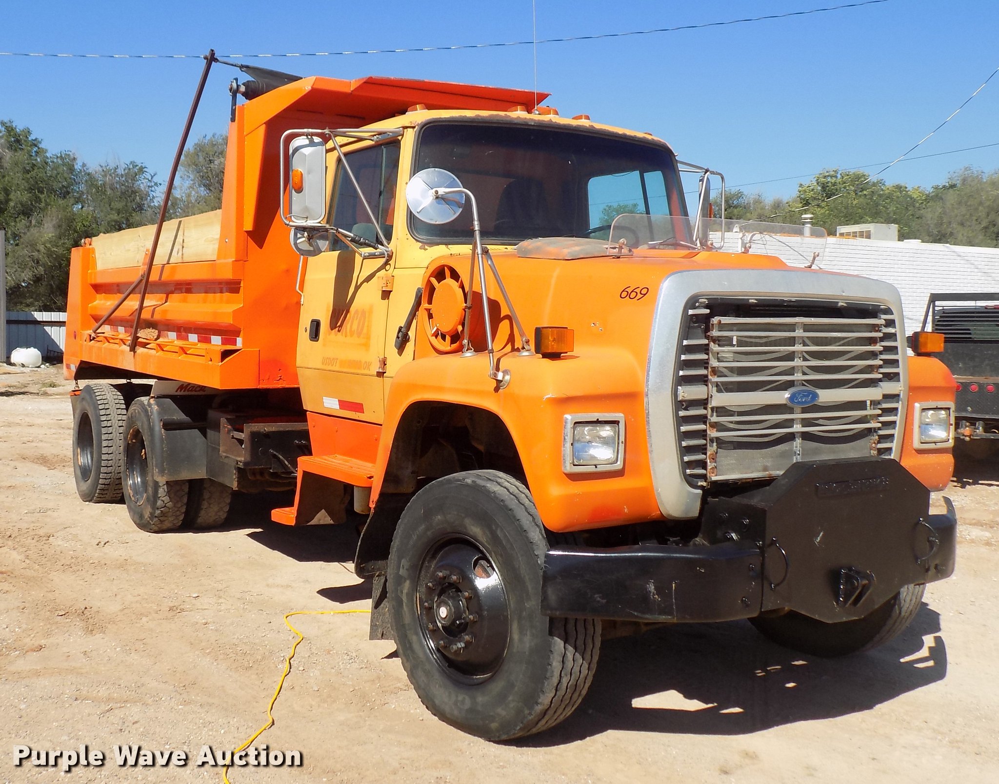 Purple Wave is selling a used Construction Dump Truck in Oklahoma. This item is a 1993 Ford LT9000 dump truck with the following: 156,675 miles on odometer, 7,227 hours on meter, Cummins L10 10.0L L6 diesel engine, Serial 34672987, Eight speed manual transmission, Tandem axle, AC and heat, Suspension seat, 13.5'L x 96"W steel dump bed, 30" side height, 12" side board height, Manual operated end gate, Roll tarp, 234" wheelbase, Hydraulic brakes, 315/80R22.5 front tires, 11R22.5 rear tires, GVWR 56,500 lbs