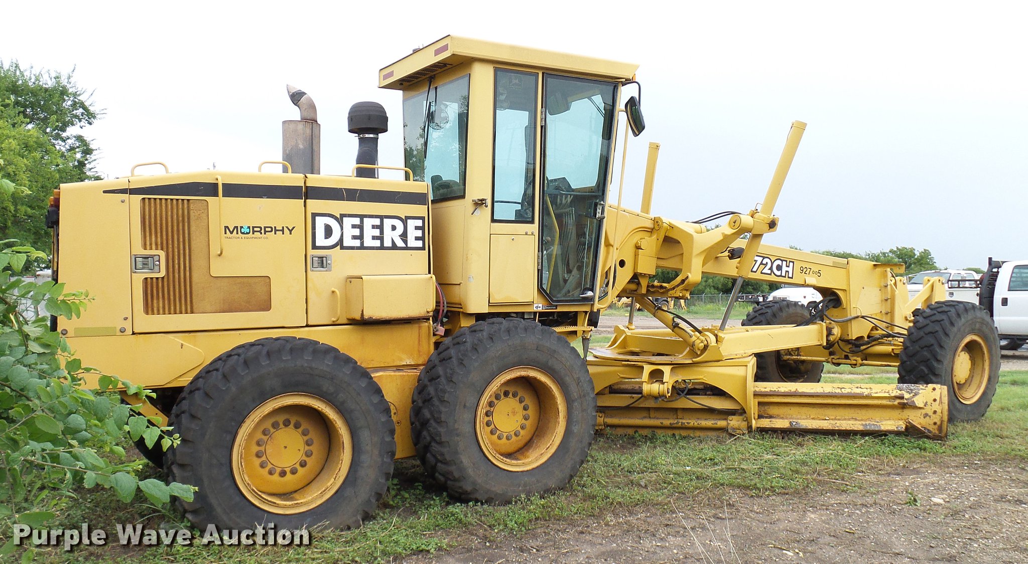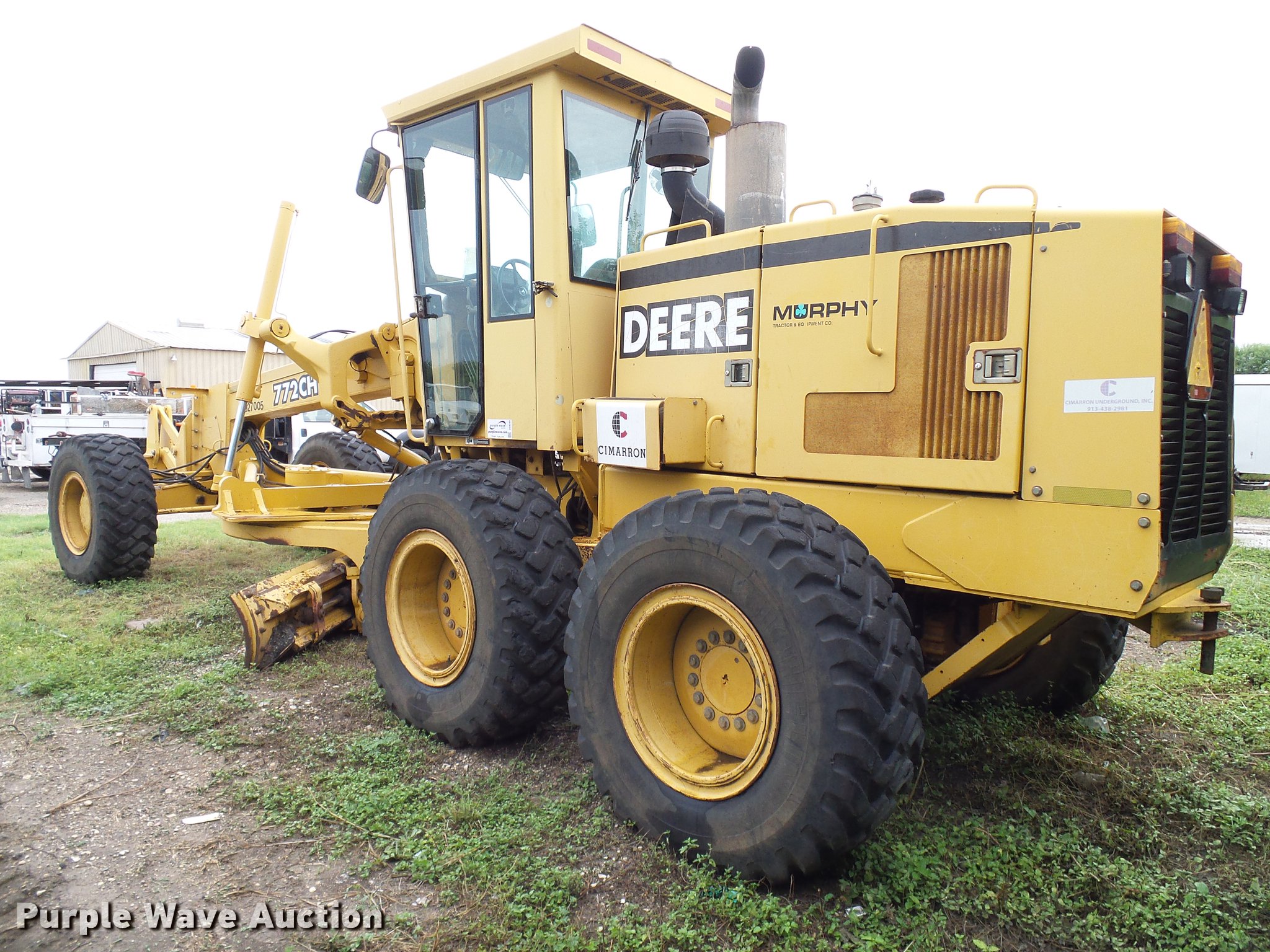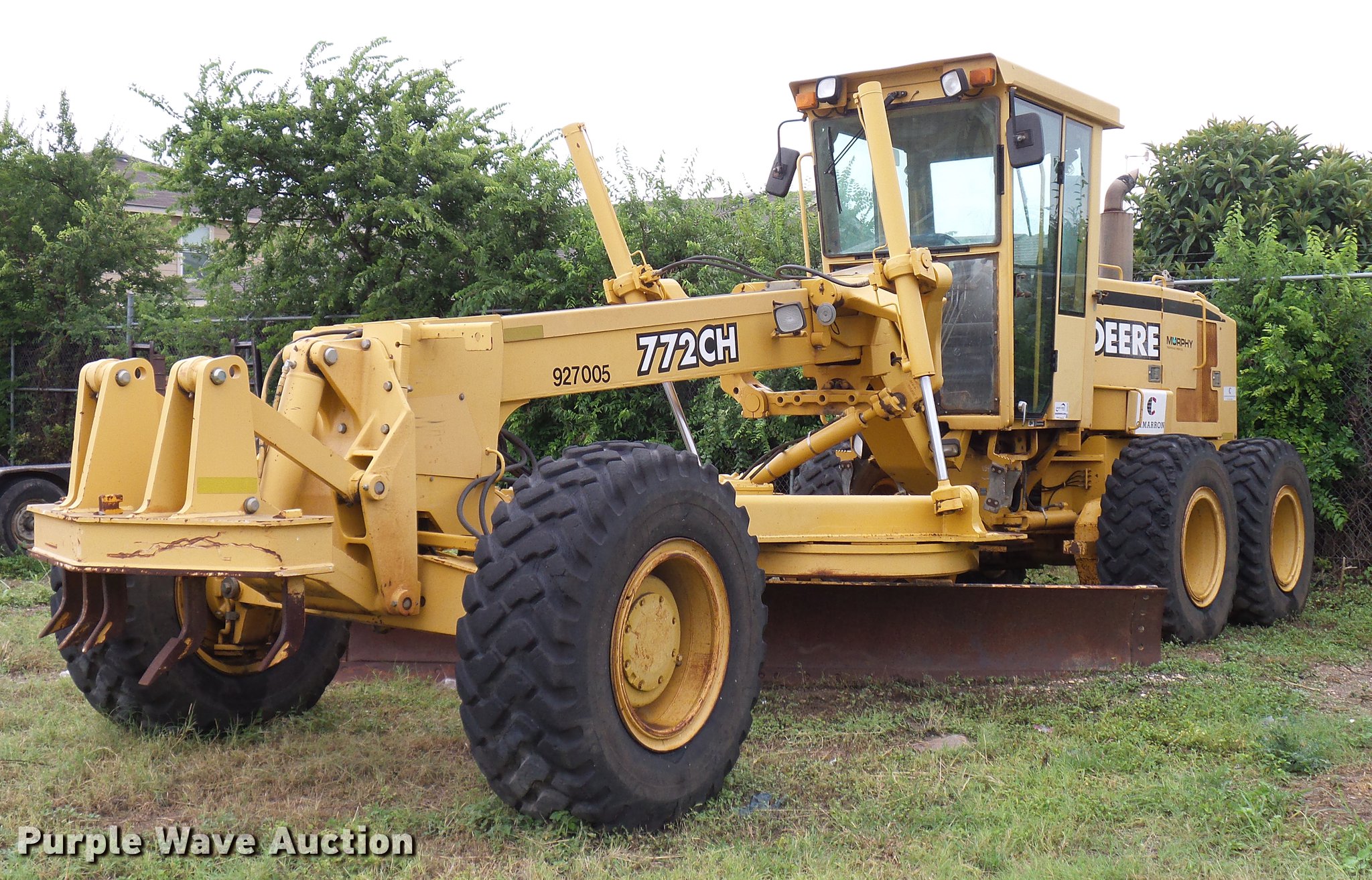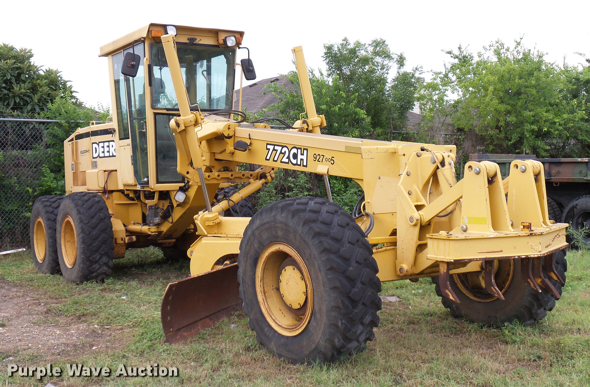 Purple Wave is selling a used Motor Grader in Texas. This item is a 2000 John Deere 772CH motor grader with the following: 5,416 hours on meter, John Deere Powertech 8.1L six cylinder turbo diesel engine, Powershift transmission, 8F-8R gears, Differential lock, Enclosed cab, AC and heat, Air suspension seat, Nine control valves, Front work lights, 14'W moldboard, Left and right blade extensions, Tip control, Side shift, Circle slip clutch, Front mounted scarifier, (5) teeth, 17.5R25 tires, Water in fuel, No batteries, Cab glass cracked, Engine cranks but will not start, Serial DW772CH577913, Unit# 927005