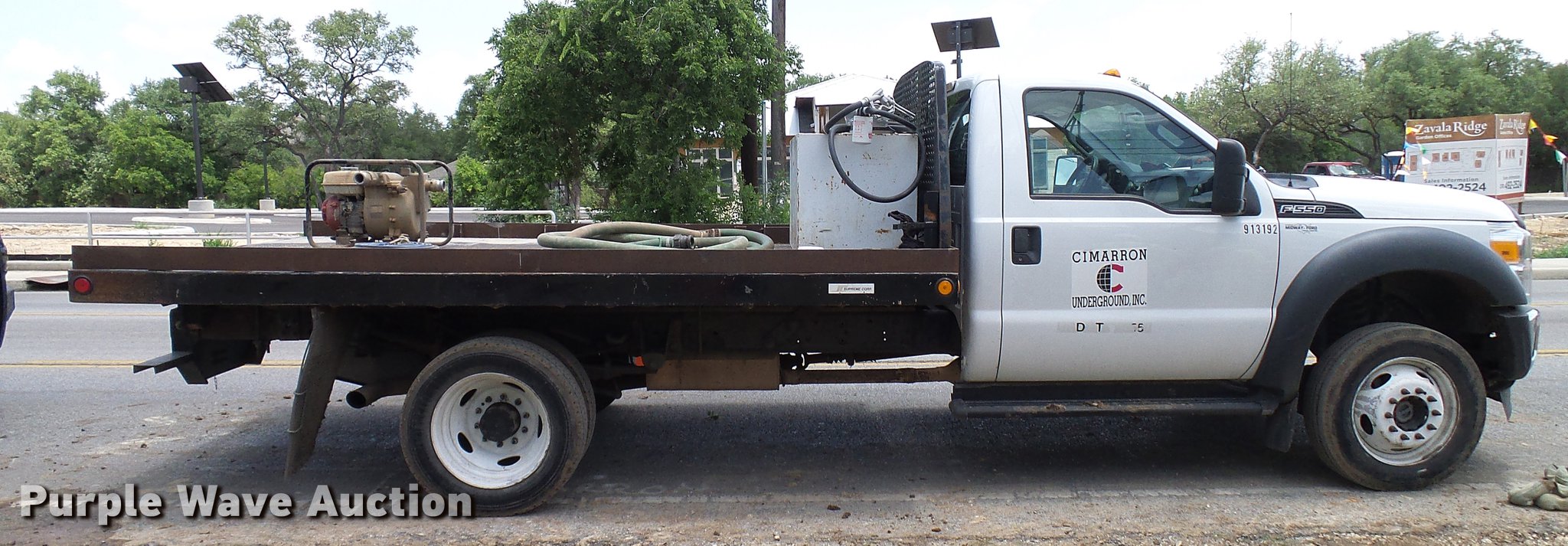 2014 Ford F550 Super Duty flat bed truck. 88,095 miles on odometer, 6.8L V10 SOHC 30V gas engine, Automatic transmission, Four wheel drive, AC and heat, Tilt, Cruise, AM/FM/CD, Vinyl interior, Front tow hook, Running boards, 12.5'L x 96"W flatbed, Gooseneck hitch, Pintle hitch, Trailer wiring, 225/70R19.5 tires, Windshield cracked, Unit# 913192. Kansas title. 1FDUF5HY6EEA55775. Cimarron Underground Inc. - Open inspection Oct. 24. 9795 Kriewald Rd. San Antonio, TX 78245