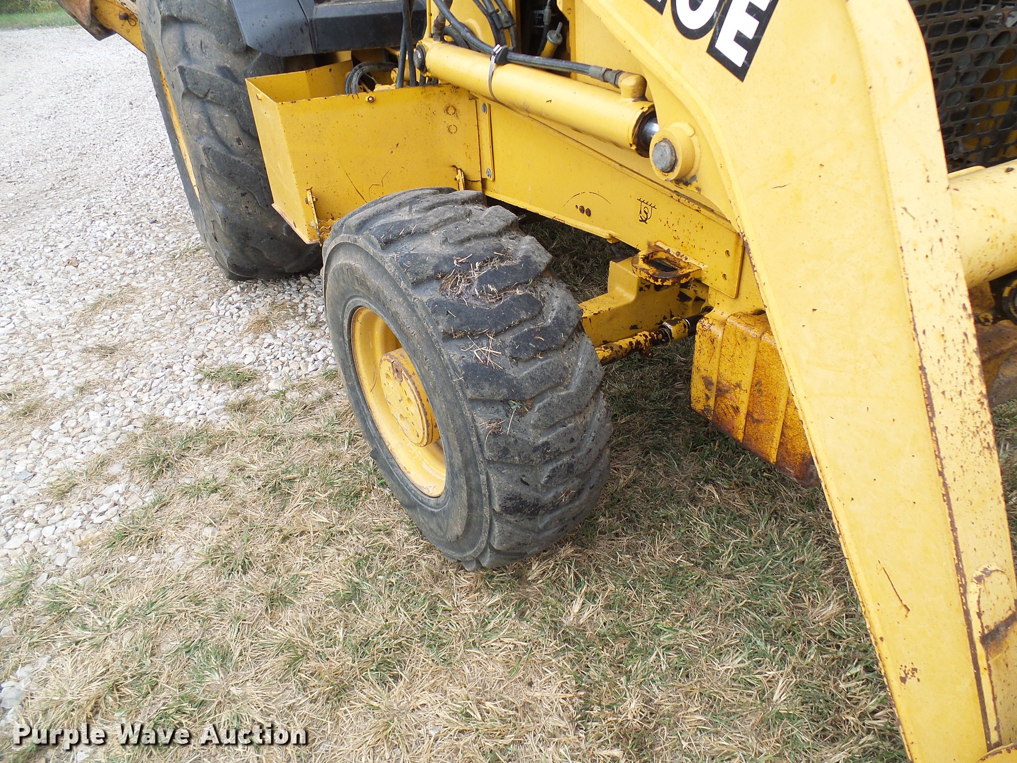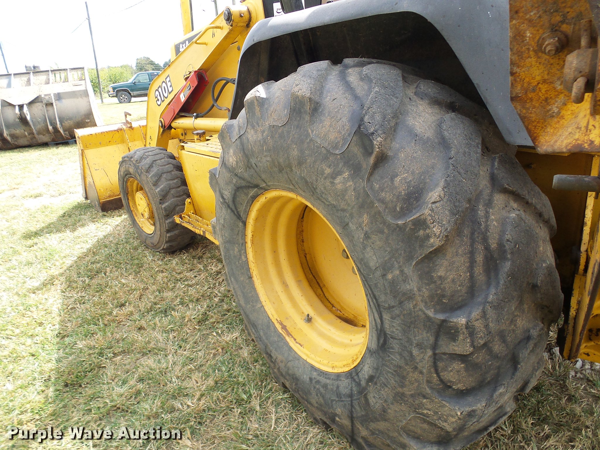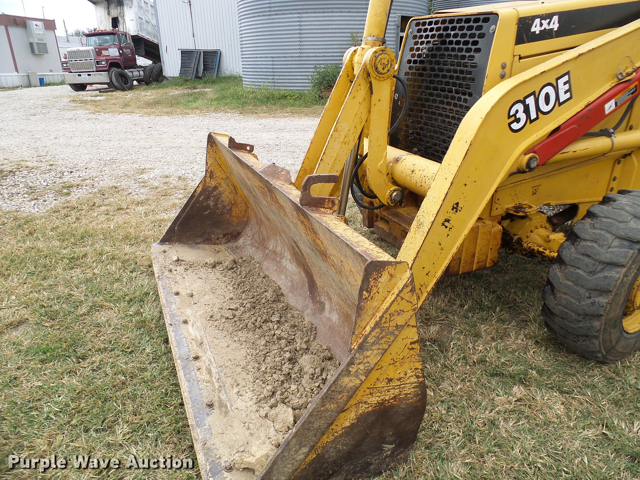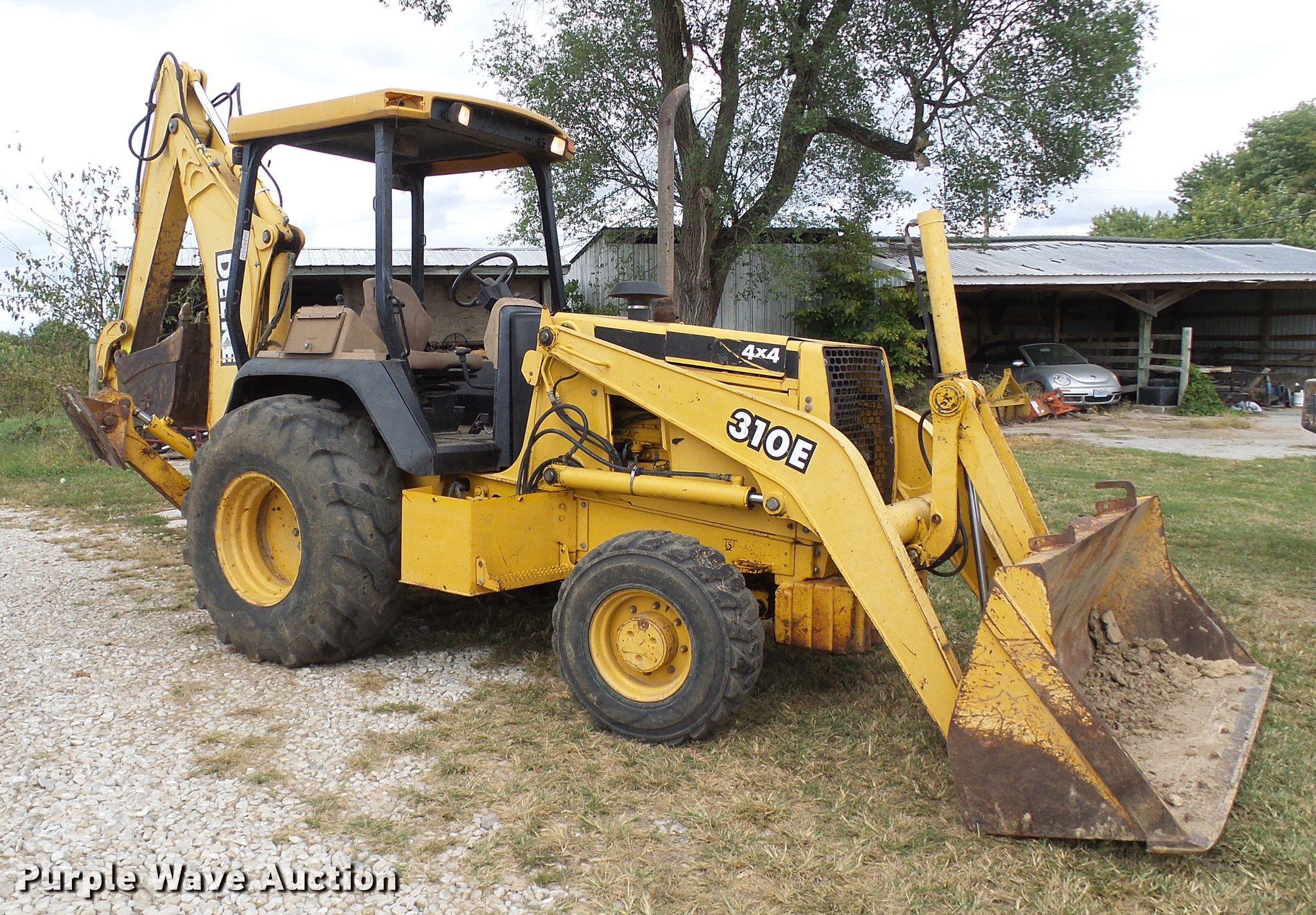 Purple Wave is selling a used Tractor Loader Backhoe in Missouri. This item is a 1999 John Deere 310E backhoe with the following: 2,450 hours on meter, John Deere four cylinder diesel engine, Shuttle shift transmission, 4F-4R gears, Four wheel drive, OROPS, Suspension seat, Wobble stick backhoe controls, Front and rear work lights, 86"W loader bucket, Bolt-on cutting edge, 18"W backhoe bucket, (4) teeth, Manual quick coupler, Auxiliary hydraulics, Front counter weights, (3) teeth missing, Outrigger cylinder leaks, Repair parts included, Serial T0310EX871184