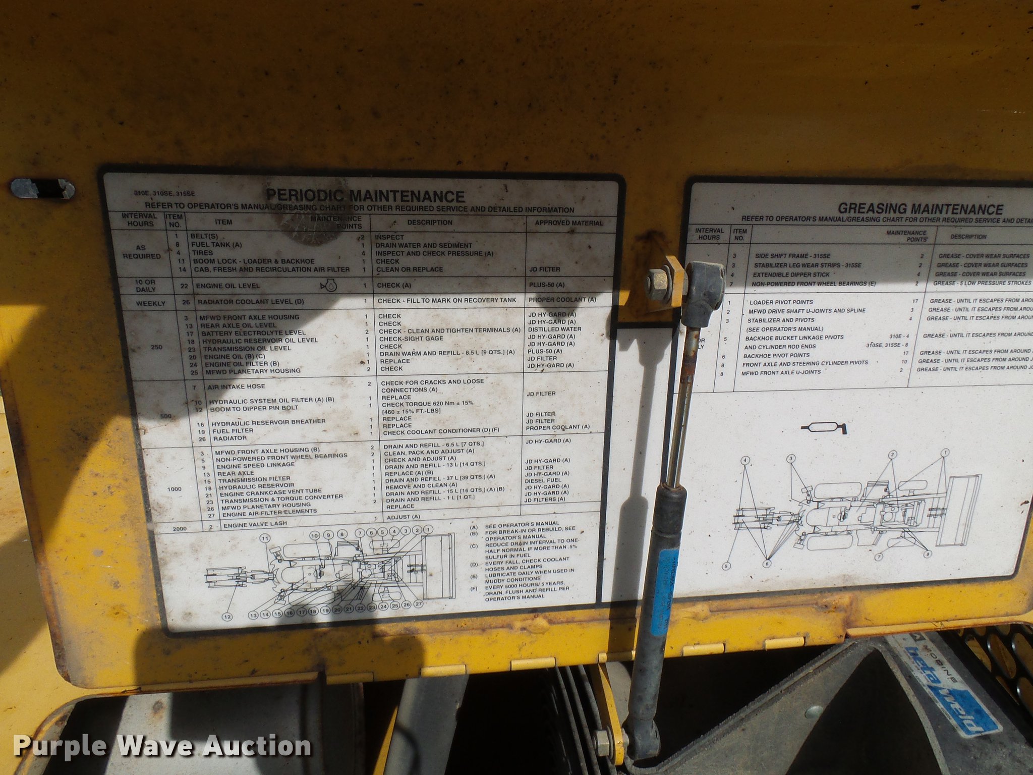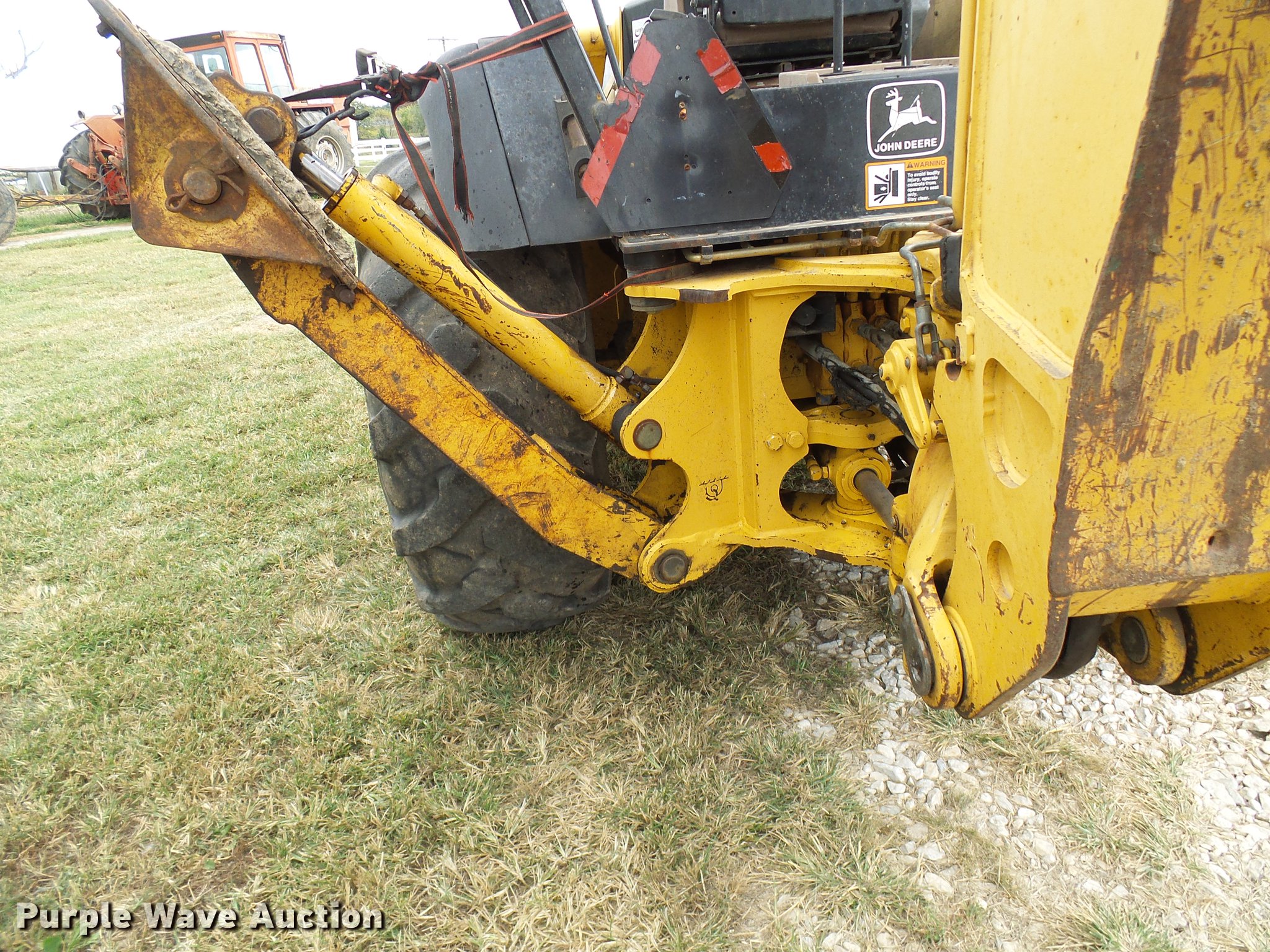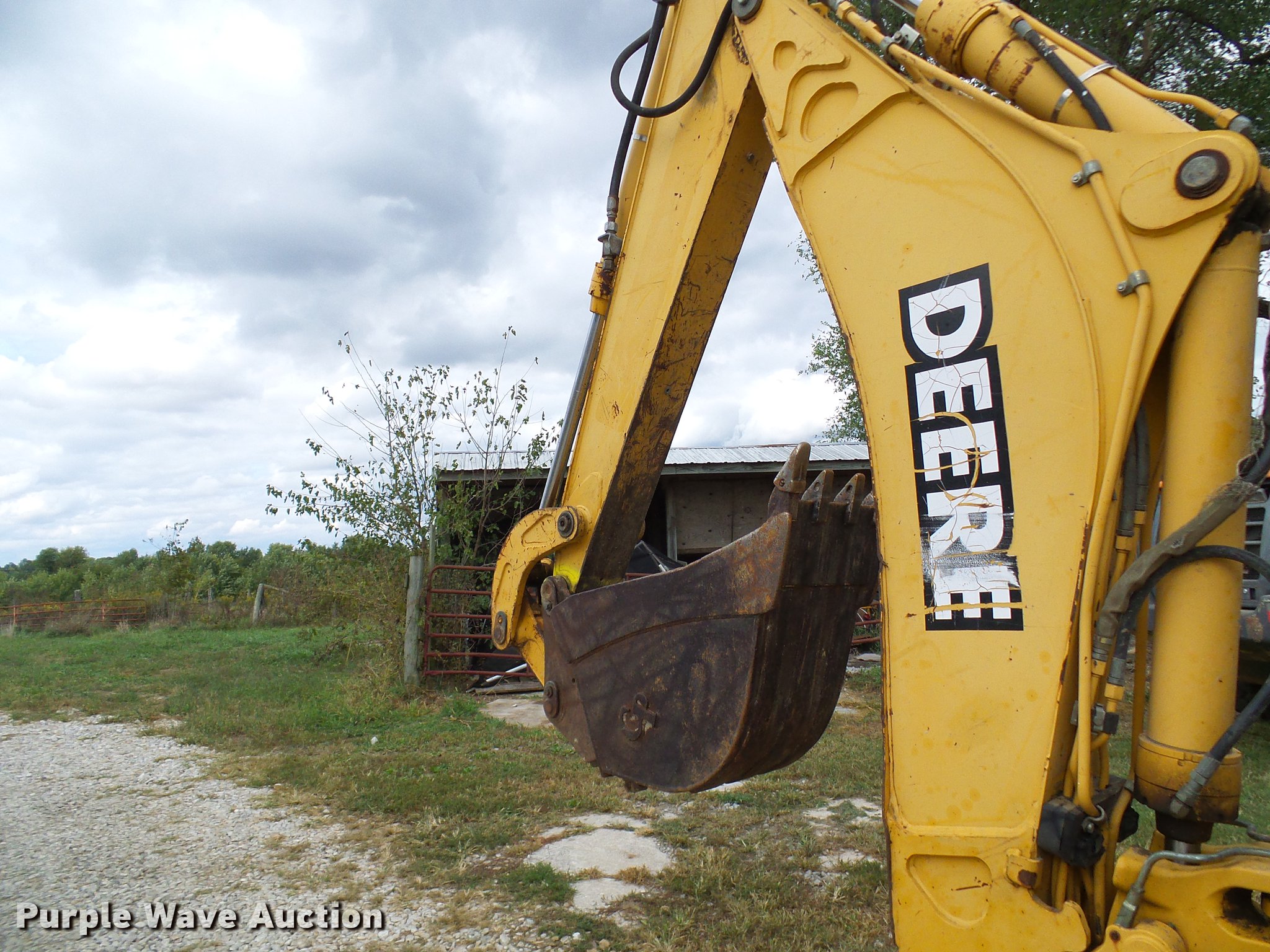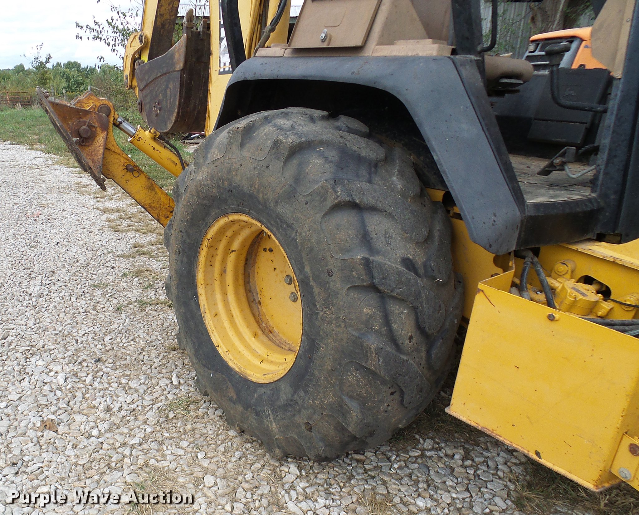 Purple Wave is selling a used Tractor Loader Backhoe in Missouri. This item is a 1999 John Deere 310E backhoe with the following: 2,450 hours on meter, John Deere four cylinder diesel engine, Shuttle shift transmission, 4F-4R gears, Four wheel drive, OROPS, Suspension seat, Wobble stick backhoe controls, Front and rear work lights, 86"W loader bucket, Bolt-on cutting edge, 18"W backhoe bucket, (4) teeth, Manual quick coupler, Auxiliary hydraulics, Front counter weights, (3) teeth missing, Outrigger cylinder leaks, Repair parts included, Serial T0310EX871184