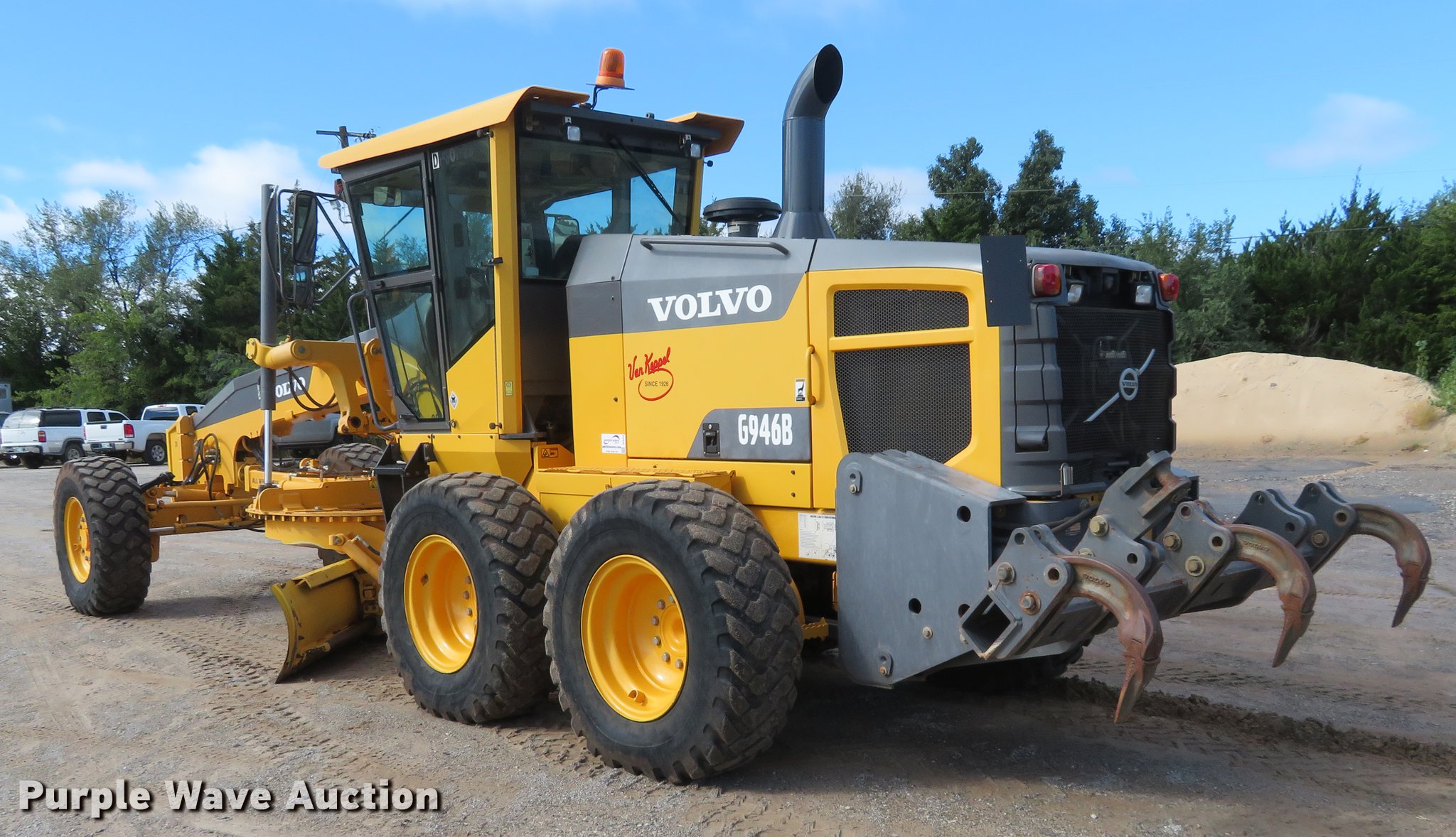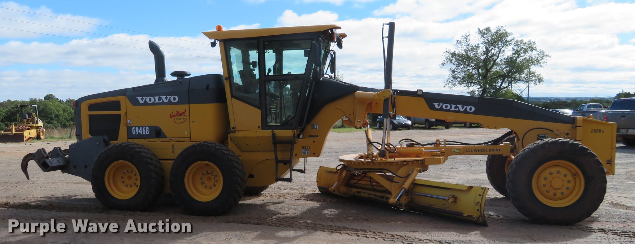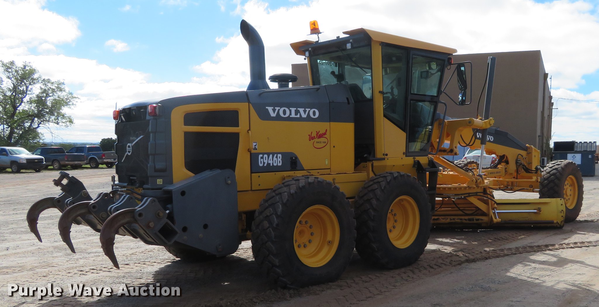 Purple Wave is selling a used Motor Grader in Oklahoma. This item is a 2014 Volvo G946B motor grader with the following: 3,199 hours on meter, Six cylinder turbo diesel engine, Powershift transmission, 11F-6R gears, All wheel drive, EROPS, AC and heat, Suspension seat, Backup camera, Joystick controls, Front and rear work lights, 14'W moldboard, Tip control, Side shift, Rear ripper, (3) shanks, 17.5-25 tires, Serial VCEG946BJ05578076