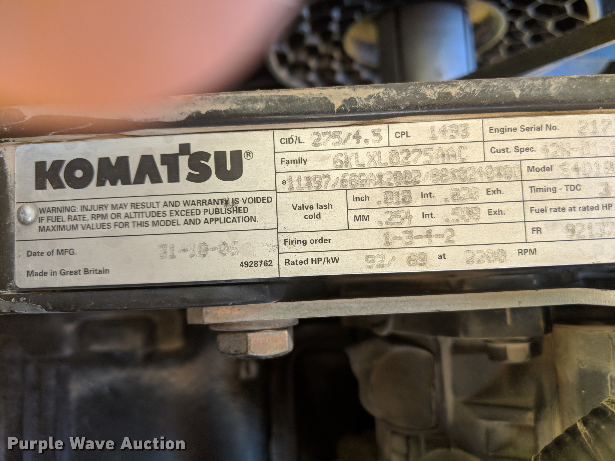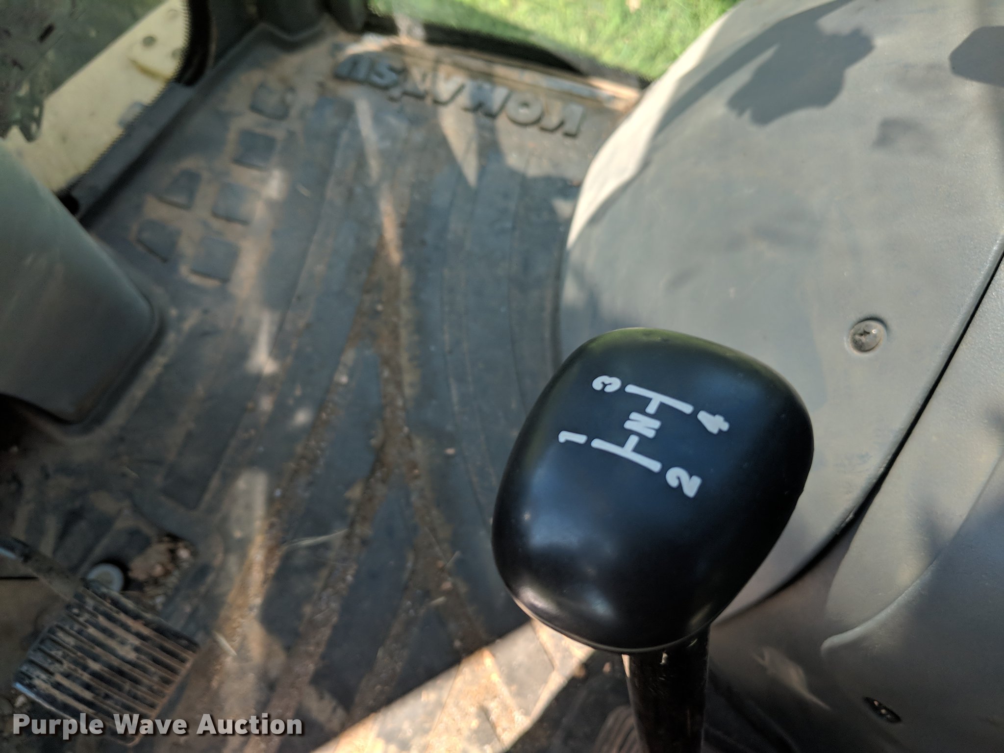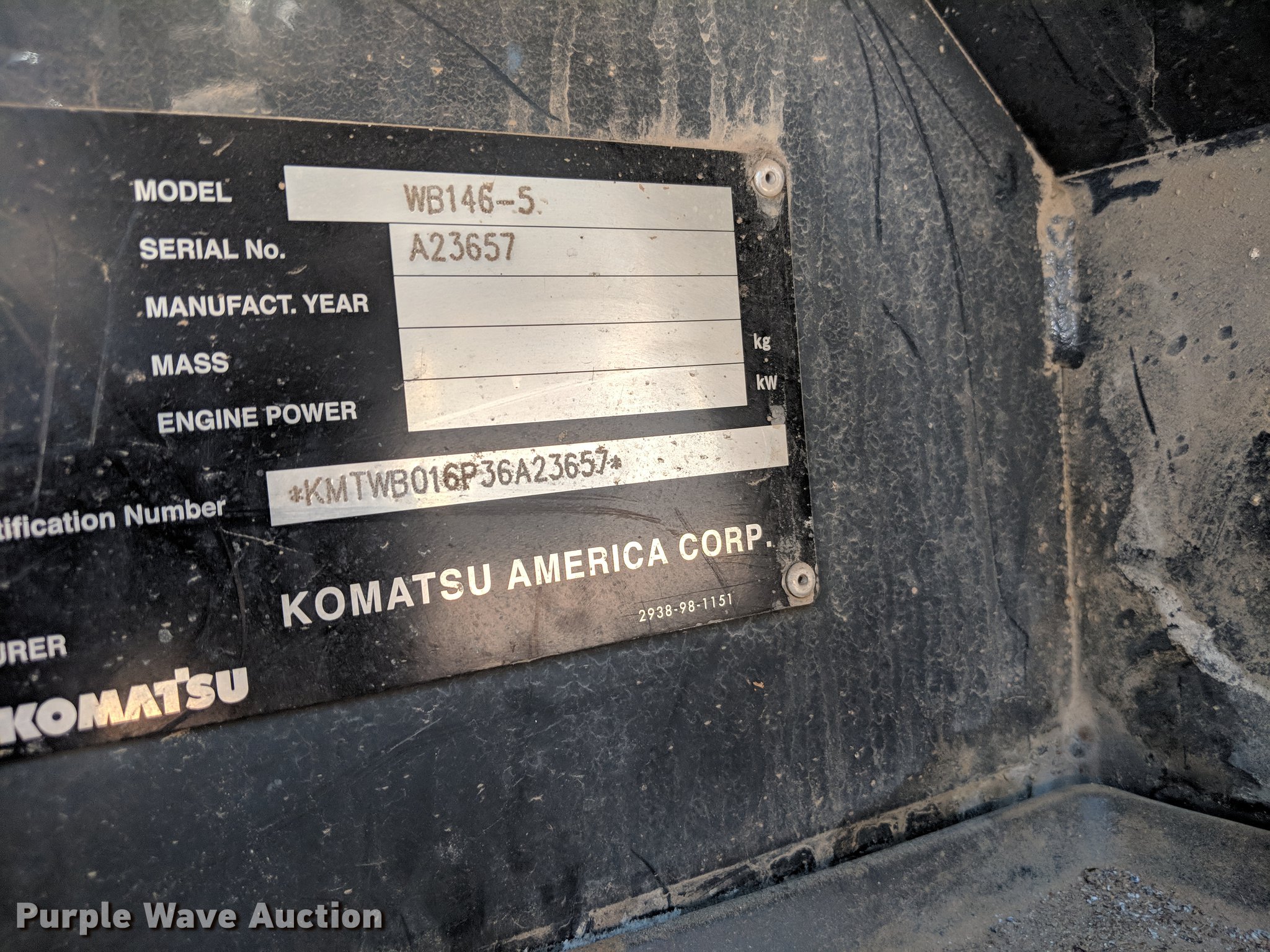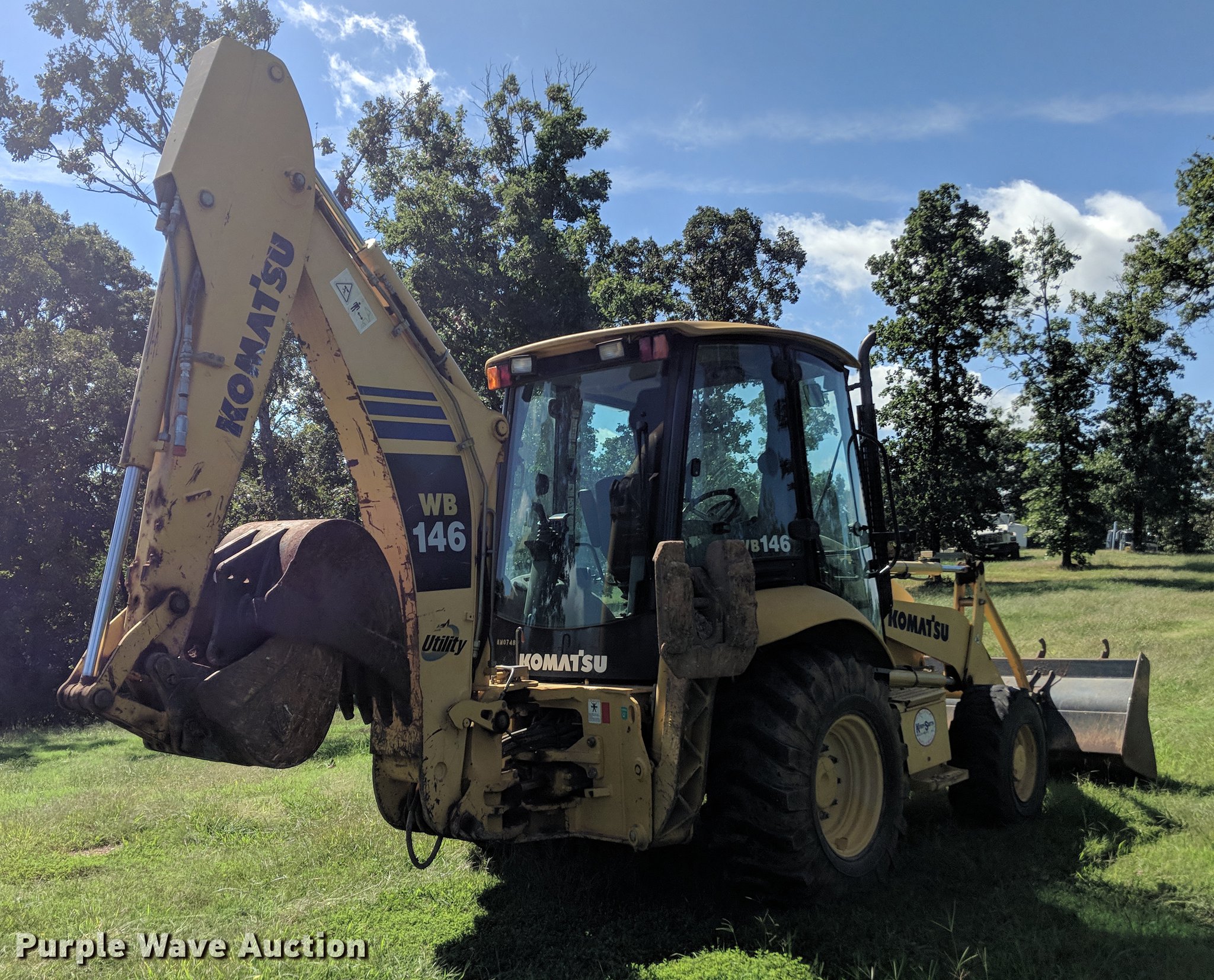 Purple Wave is selling a used Tractor Loader Backhoe in Oklahoma. This item is a 2007 Komatsu WB146-5 backhoe with the following: 4,089 hours on meter, Komatsu turbo diesel engine, 92 HP, Shuttle shift transmission, 4F-4R gears, Four wheel drive, Differential lock, EROPS, AC and heat, Pilot control, Front and rear work lights, Loader bucket, Backhoe bucket, Windshield cracked, Serial A23657