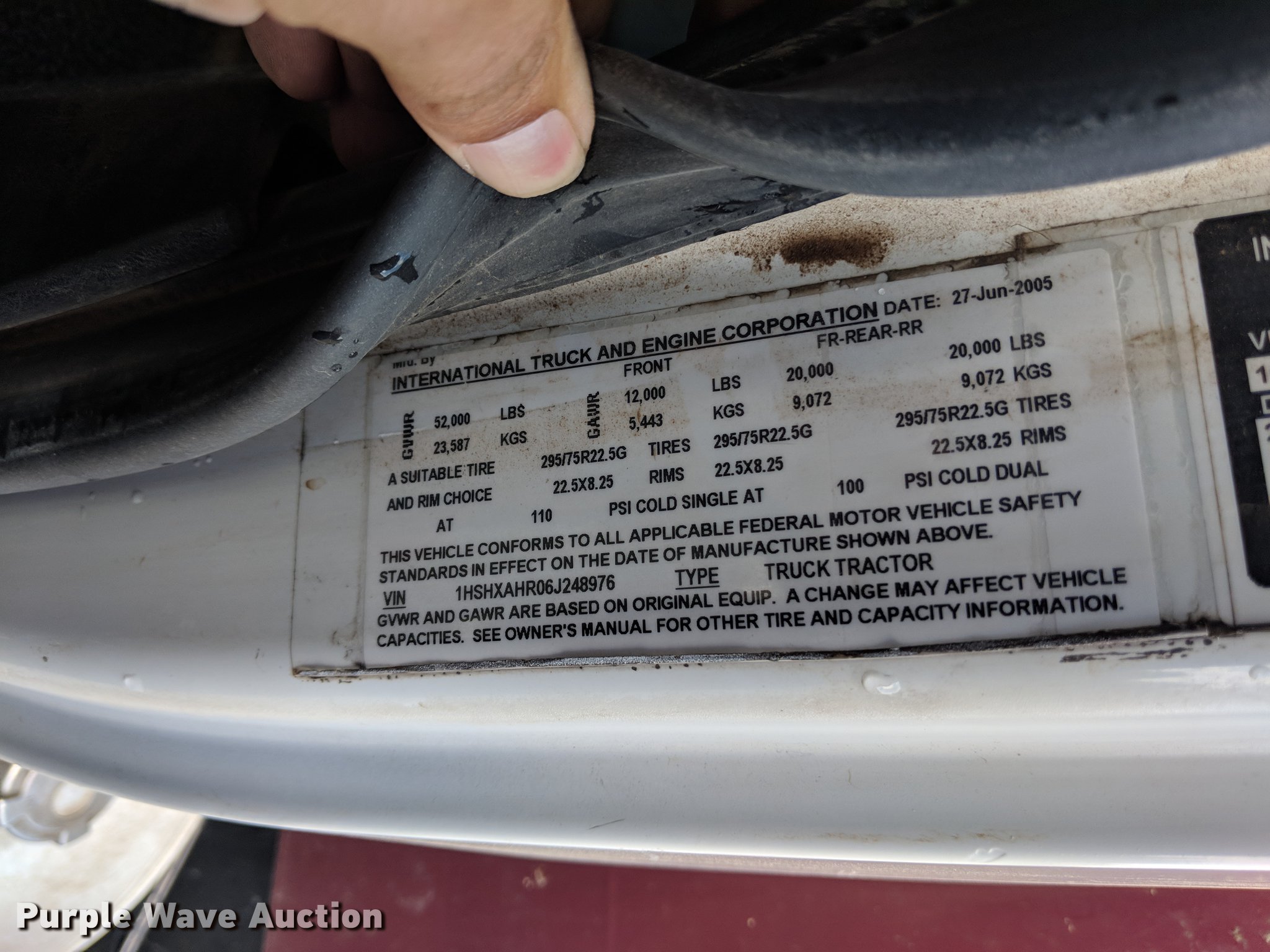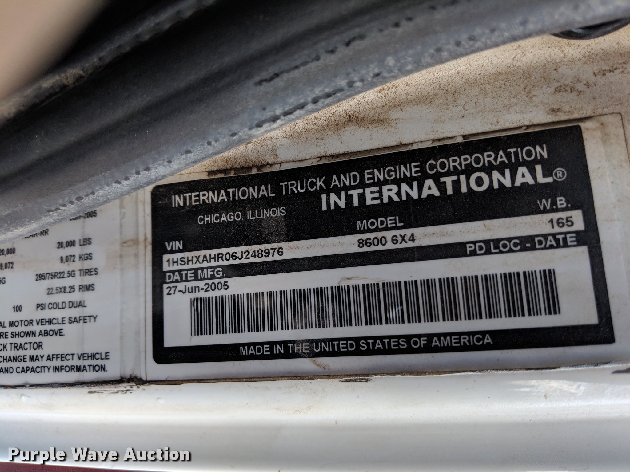 Purple Wave is selling a used Construction Dump Truck in Kansas. This item is a 2006 International 8600 dump truck with the following: 466,406 miles on odometer, 13,382 hours on meter, Cummins ISM 8.6L L6 turbo diesel engine, Eaton Fuller 10 speed manual transmission, Inter-axle differential lock, Tandem axle, AC and heat, AM/FM/CD, Tilt, Cruise, Heated mirrors, Air suspension seat, Trailer brake controller, PTO, Crown Beds Gravel Star steel dump bed, 13'L x 8'W, 36" side height, 8" side board height, Single ram hoist, Air operated end gate, Dual fuel tanks, Pintle hitch, Double frame, Air brakes, Engine brakes, 11R22.5 tires, GVWR 52,000 lbs, FAWR 12,000 lbs, IAWR 20,000 lbs, RAWR 20,000 lbs