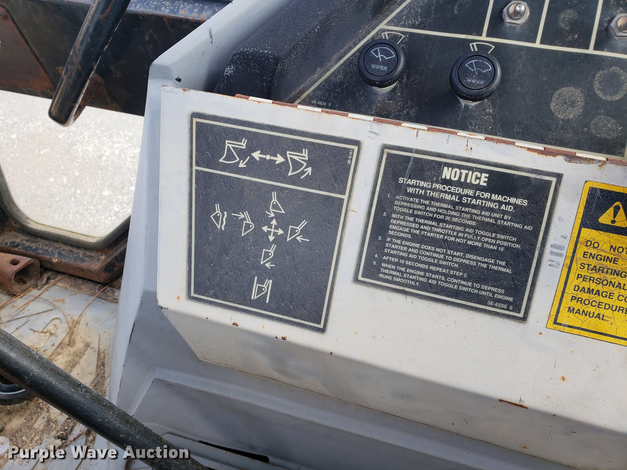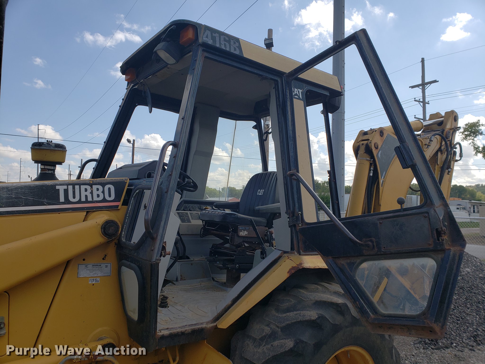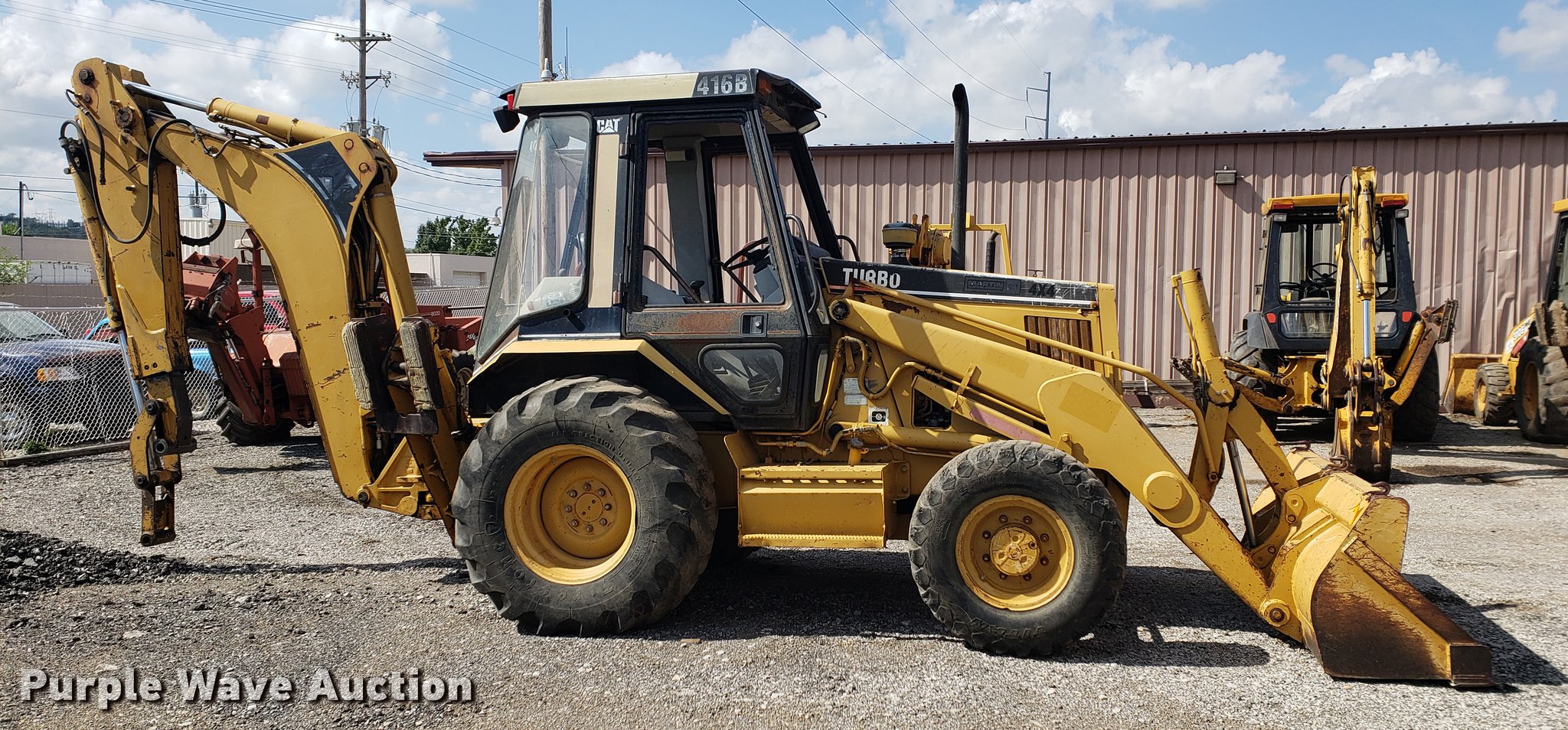 Purple Wave is selling a used Tractor Loader Backhoe in Kansas. This item is a 1994 Caterpillar 416B backhoe with the following: 6,794 hours on meter, Caterpillar 3054D four cylinder diesel engine, Serial 5HK11338, Shuttle shift transmission, 4F-4R gears, Four wheel drive, EROPS, Suspension seat, Wobble stick backhoe controls, Front and rear work lights, 87"W loader bucket, Bolt-on cutting edge, Extendable stick, Auxiliary hydraulics, 12.5/80-18 front tires, 19.5-24 rear tires, Cab glass missing, Serial 8ZK01854