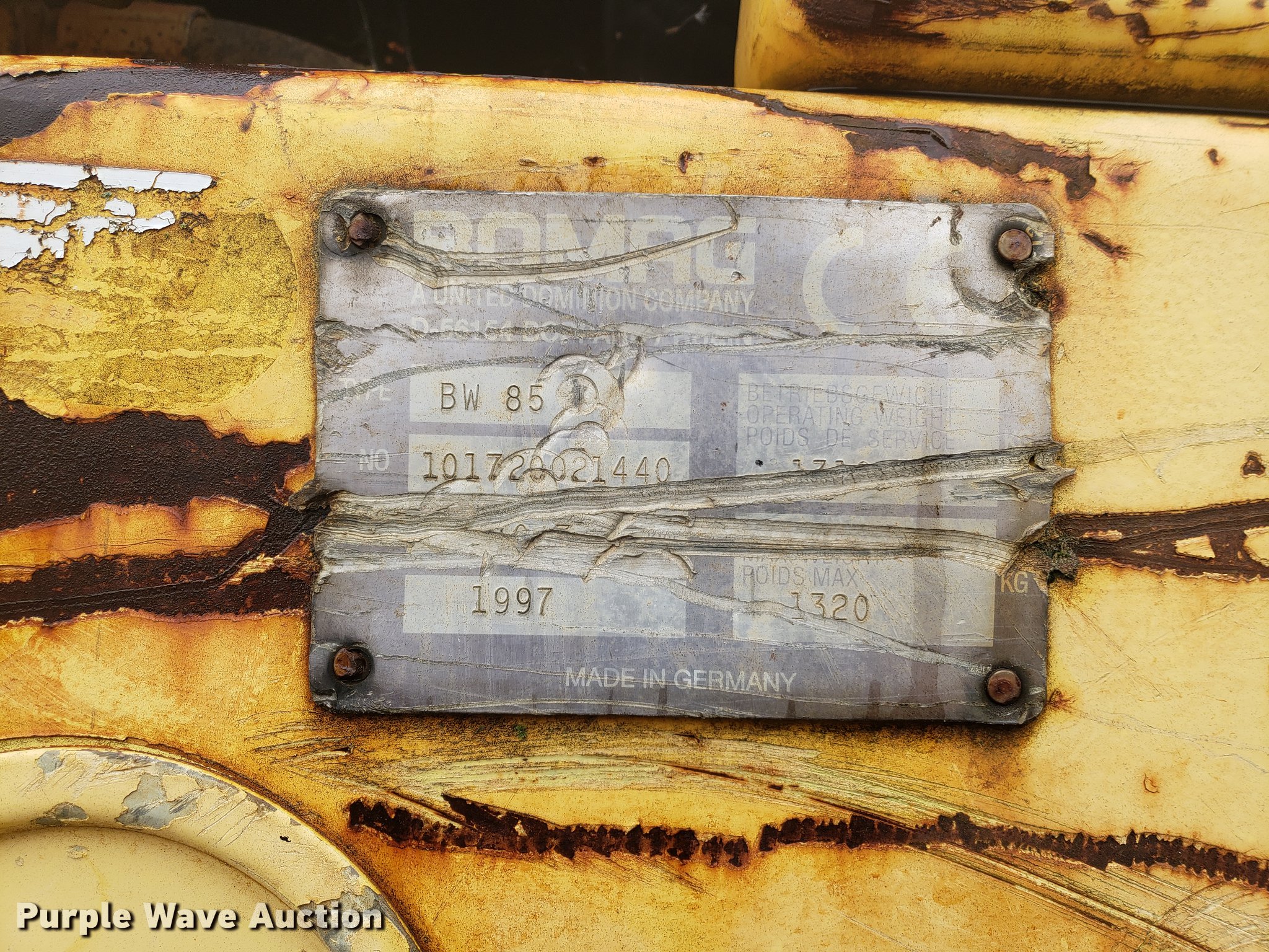 Purple Wave is selling a used Walk Behind Compactor in Missouri. This item is a 1997 Bomag BW85T trench compactor with the following: Single cylinder diesel engine, Hydrostatic transmission, 16"W padfoot drums, Drum scrapers, Serial 101720021440