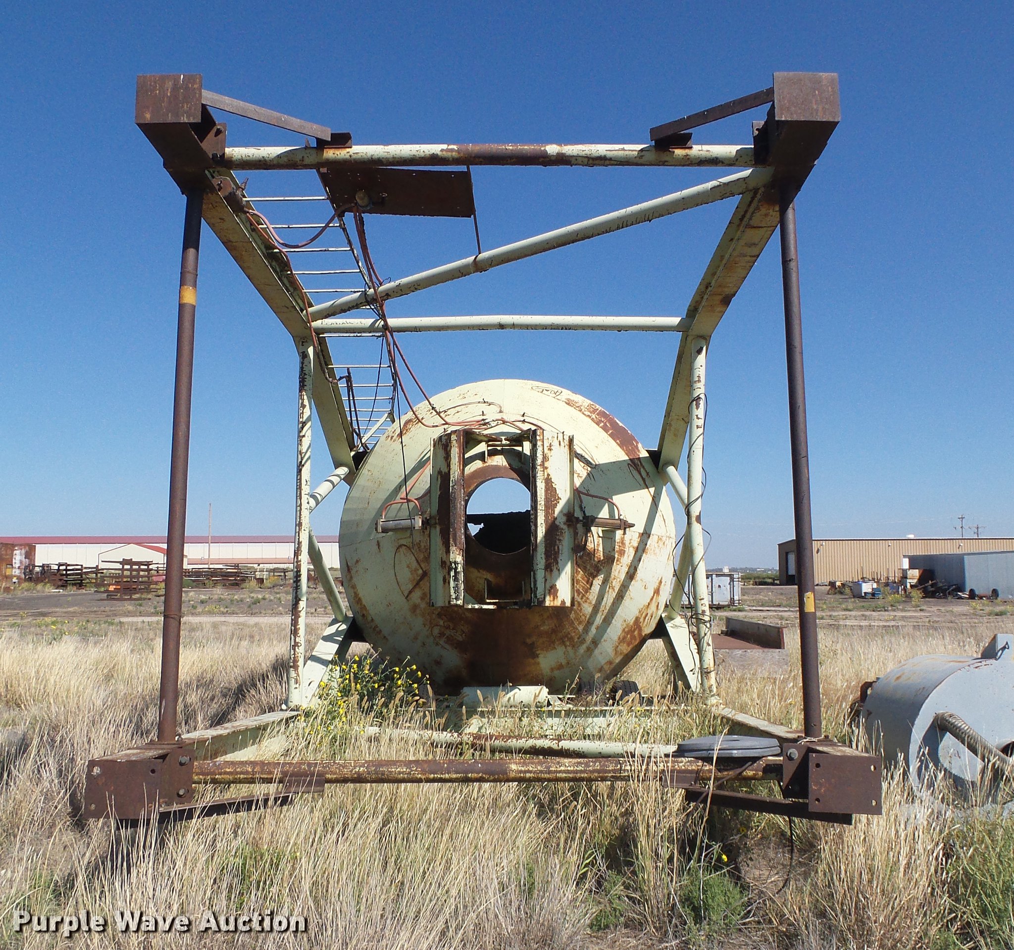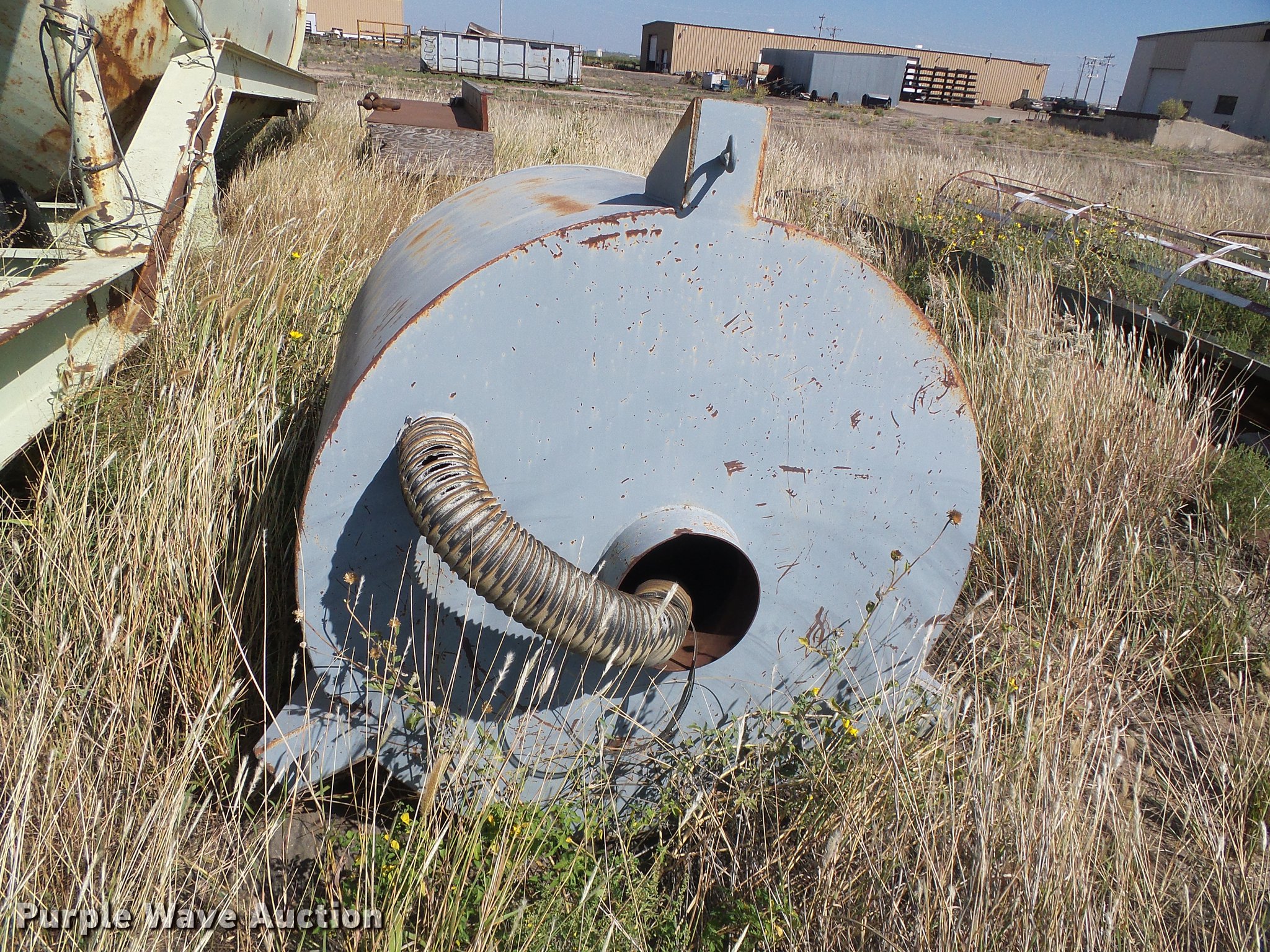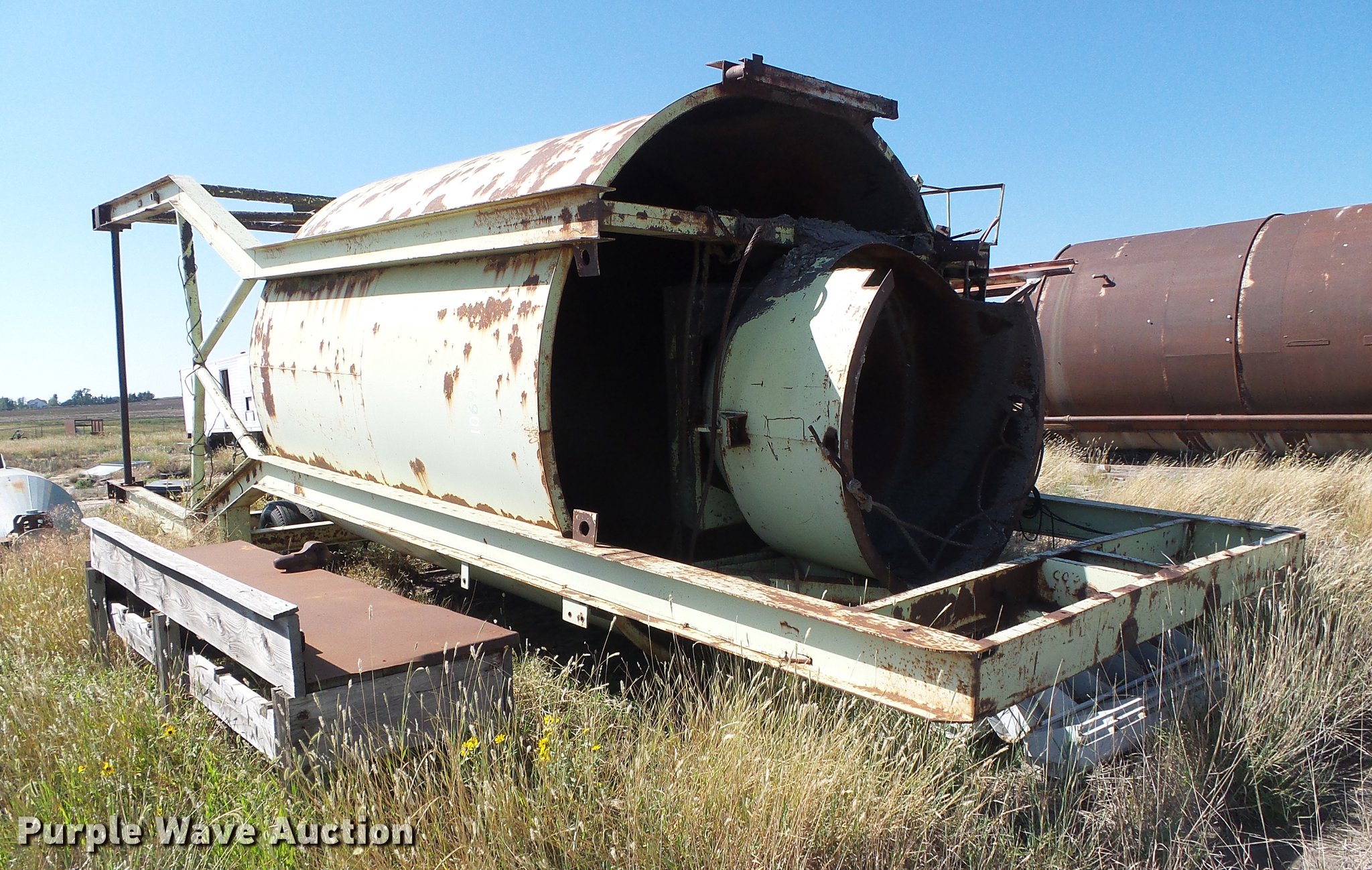 Purple Wave is selling a used Batch Plant or Surge Bin in Kansas. This item is a Asphalt batch plant with the following: 40'8"L x 11'9"W x 11'9"H, 22'L x 11'9" diameter tank, 15' cone, 7" cone, 6'L x 77" diameter top cone batch tank, Ladder, Hydraulic bottom trap gate, 24' x 16" screw conveyor, Electric motor, Air brakes, Single axle, 9.00 x 15TR tires, Unknown operating condition