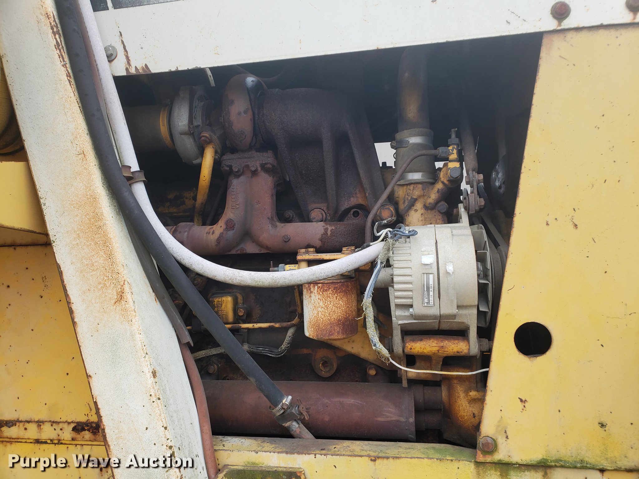 International 412 elevating scraper. 1,765 hours on meter, International six cylinder turbo diesel engine, Powershift transmission 4F-1R gears, Enclosed cab, 8' bowl width, Rear push block, 23.5-25 tires, Cab glass missing. 18017 S State Rte Y. Belton, MO 64012