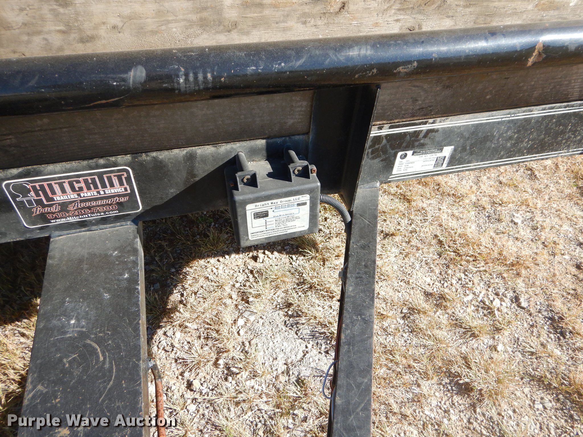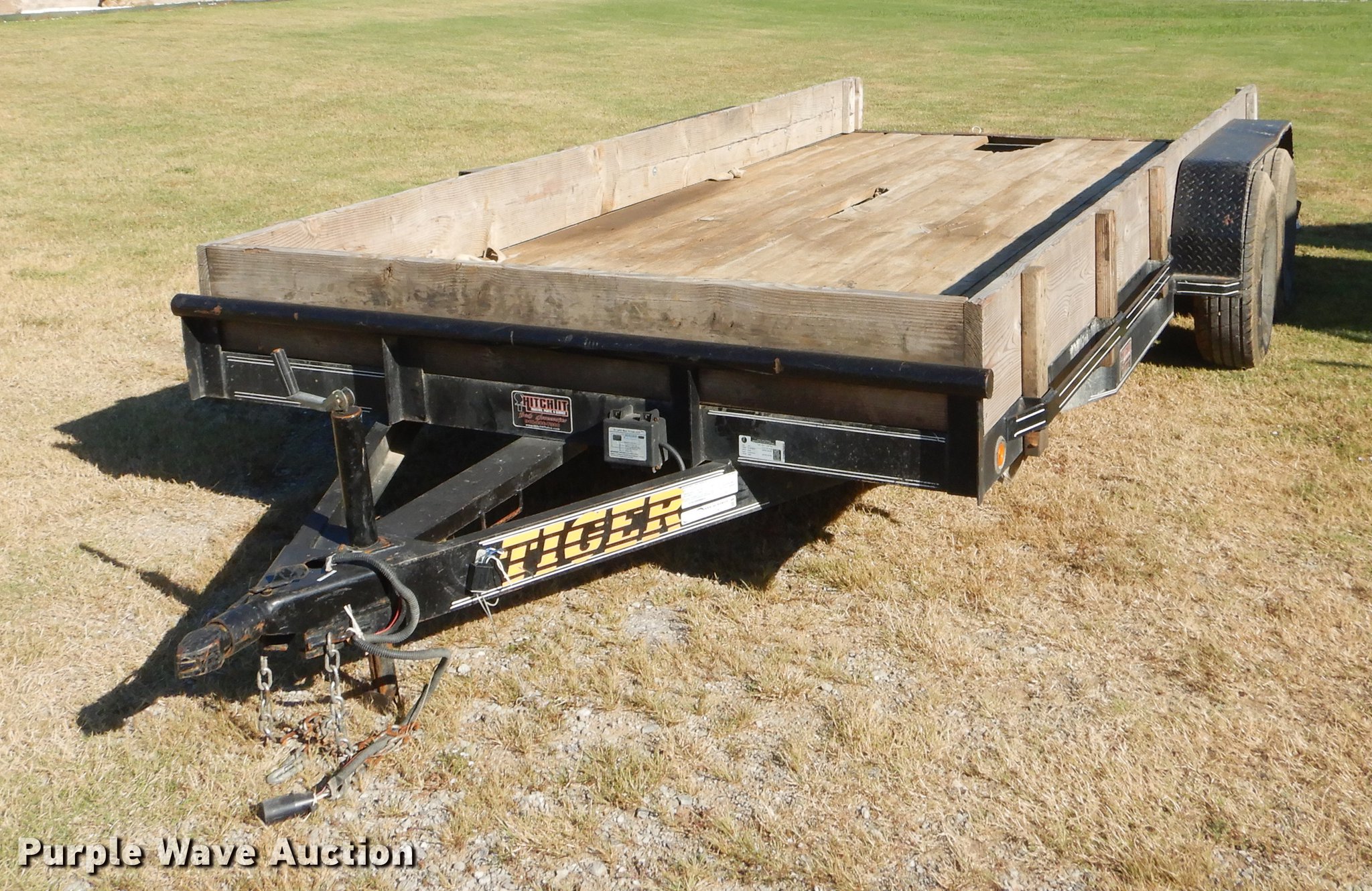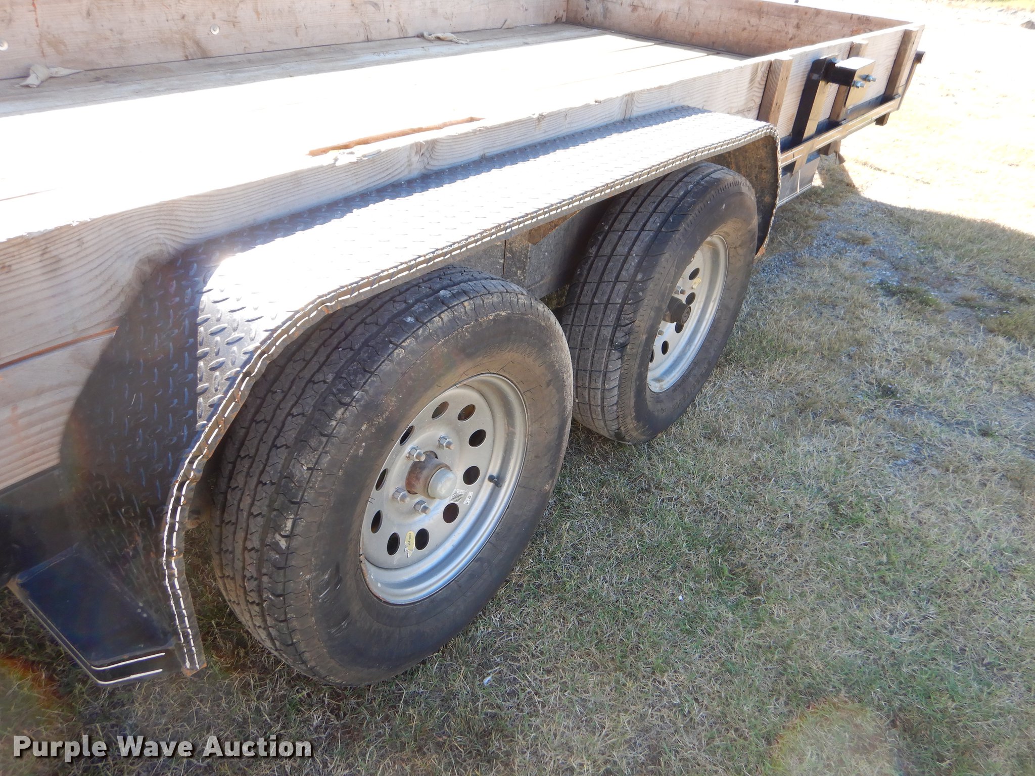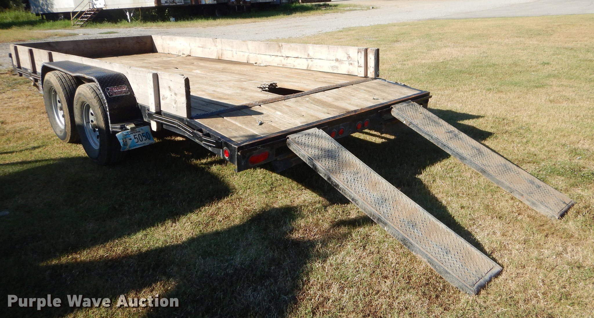 Purple Wave is selling a used Car or Utility Trailer in Oklahoma. This item is a 2017 Tiger utility trailer with the following: 22'L x 86"W overall, 16'L wood deck, 2'L dovetail, 55"L ramps, 11" side height, 25" floor height, Stake pockets, 2" ball hitch, Single leg landing gear, Spring suspension, Electric brakes, Tandem axle, Steel wheels, 225/75R15 tires, GVWR 7,000 lbs, Unit# 191