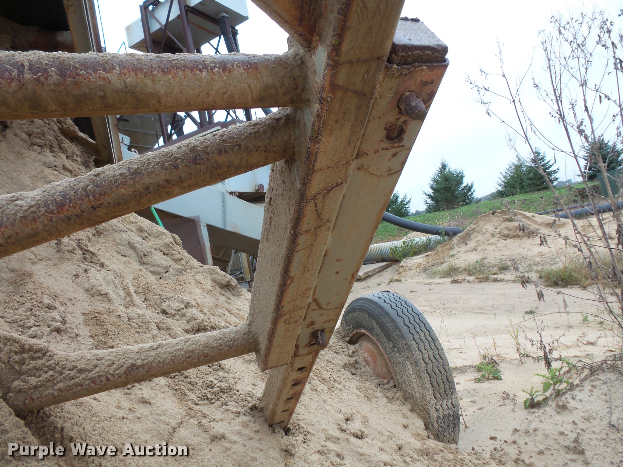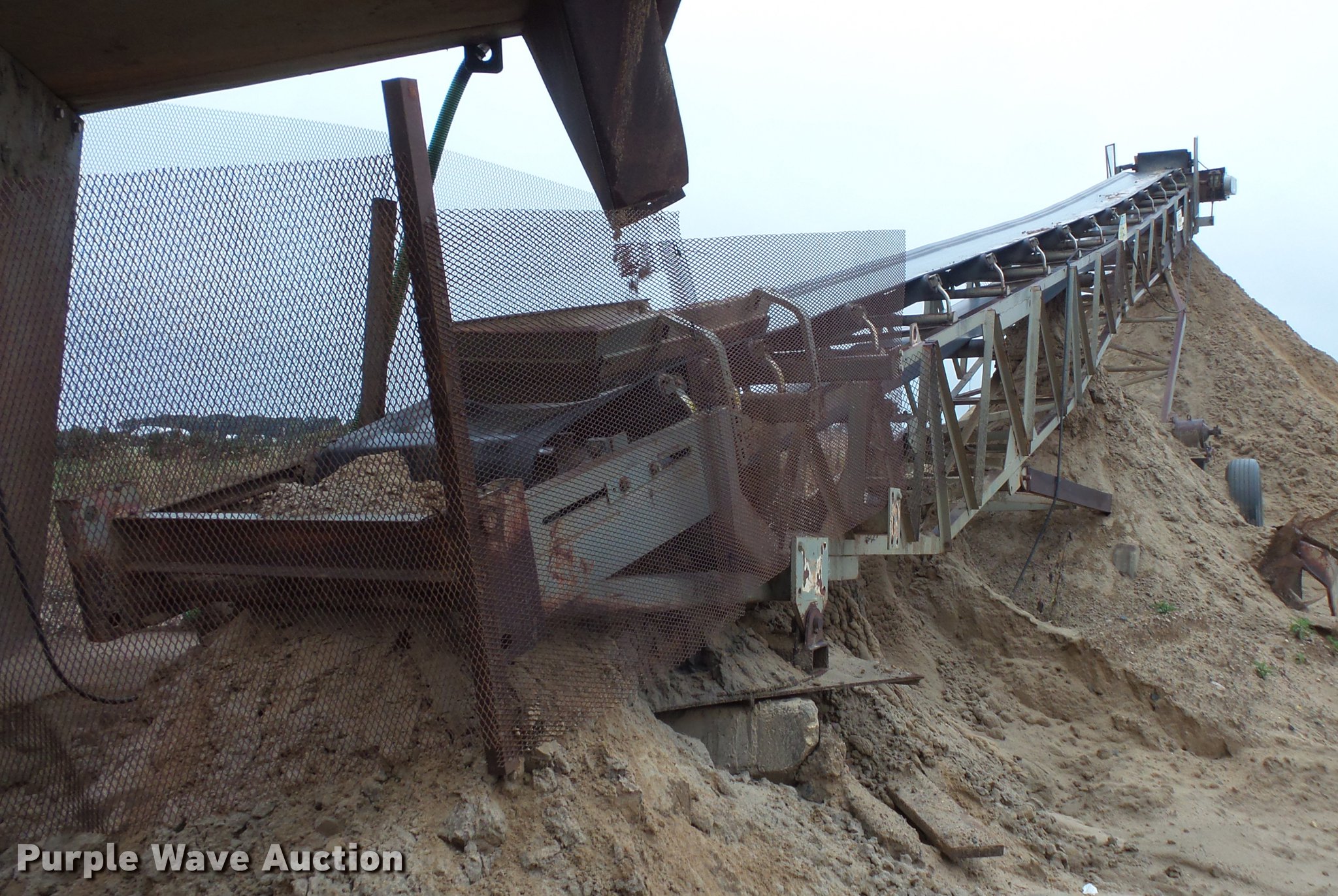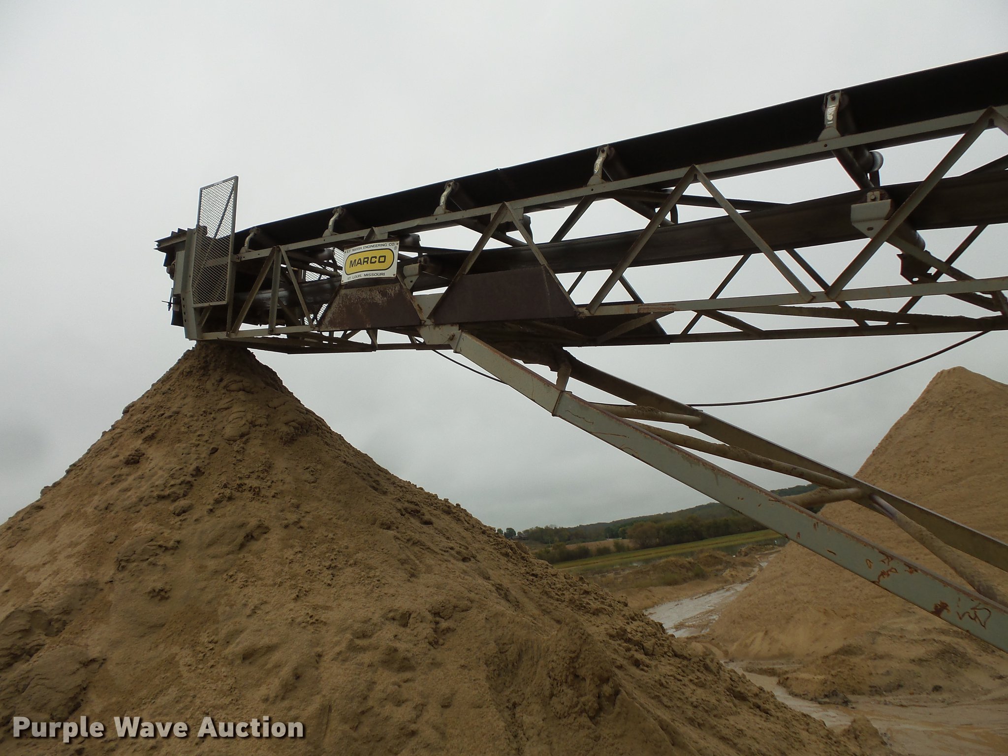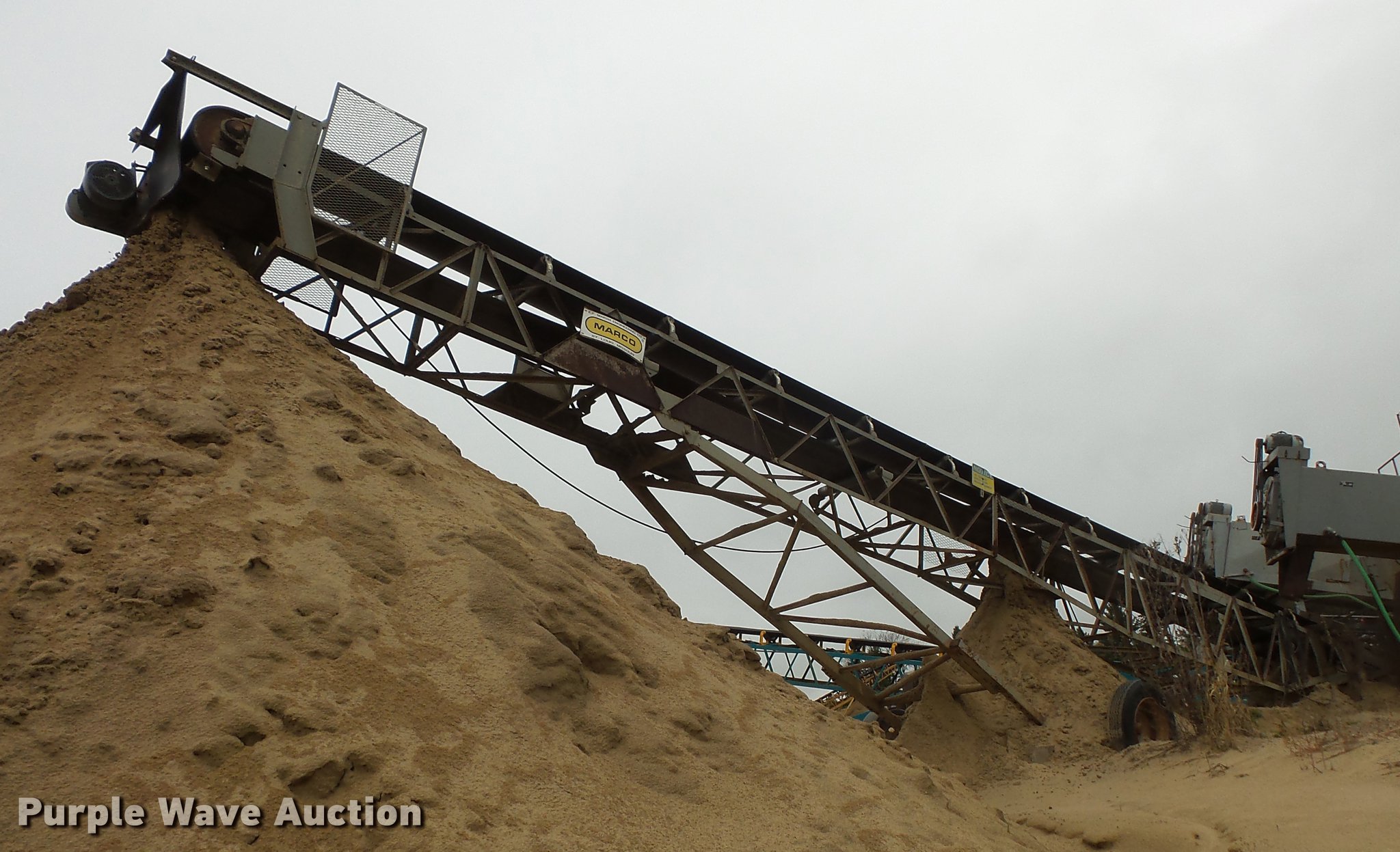 Purple Wave is selling a used Conveyor in Minnesota. This item is a Marko truss frame conveyor with the following: 60'L x 30"W, Manual adjustable height, Electric motor, 295/75R22.5 tires