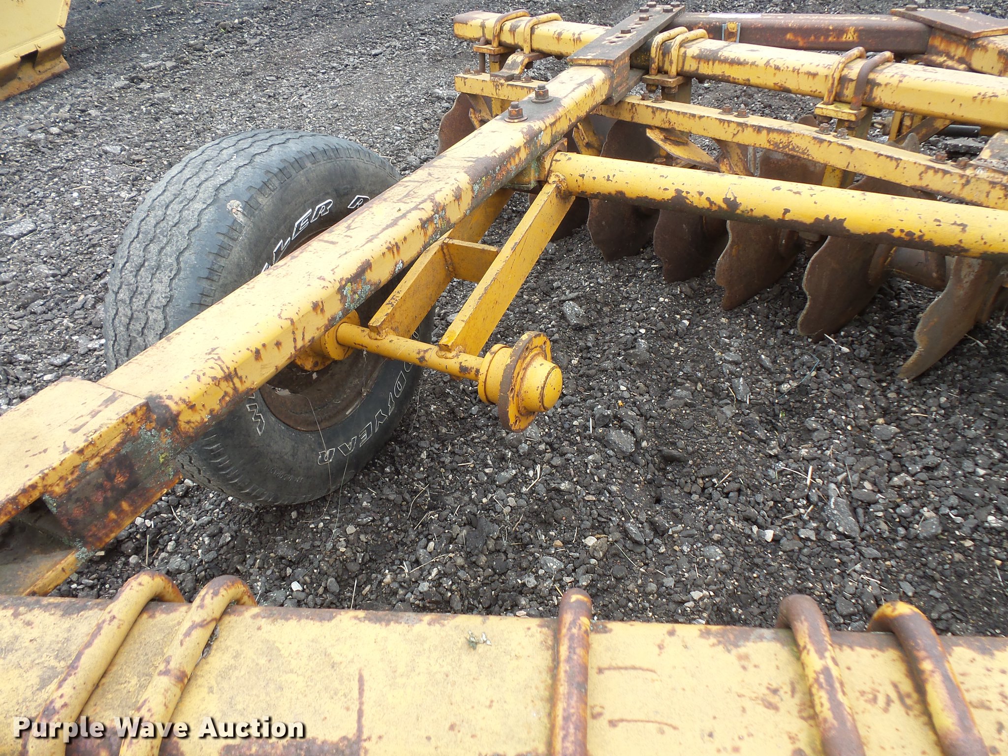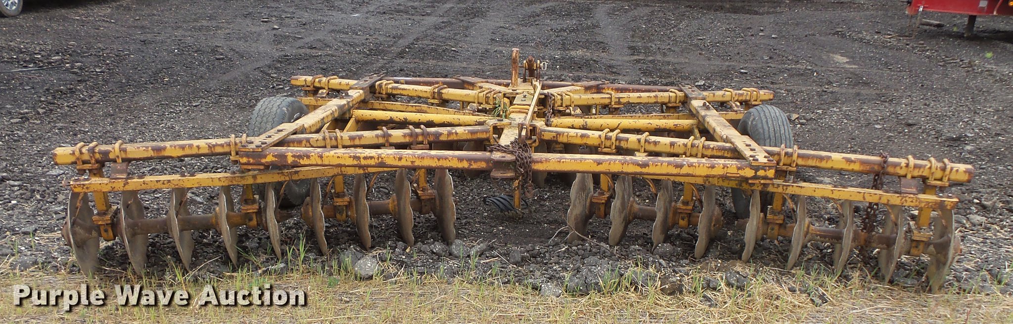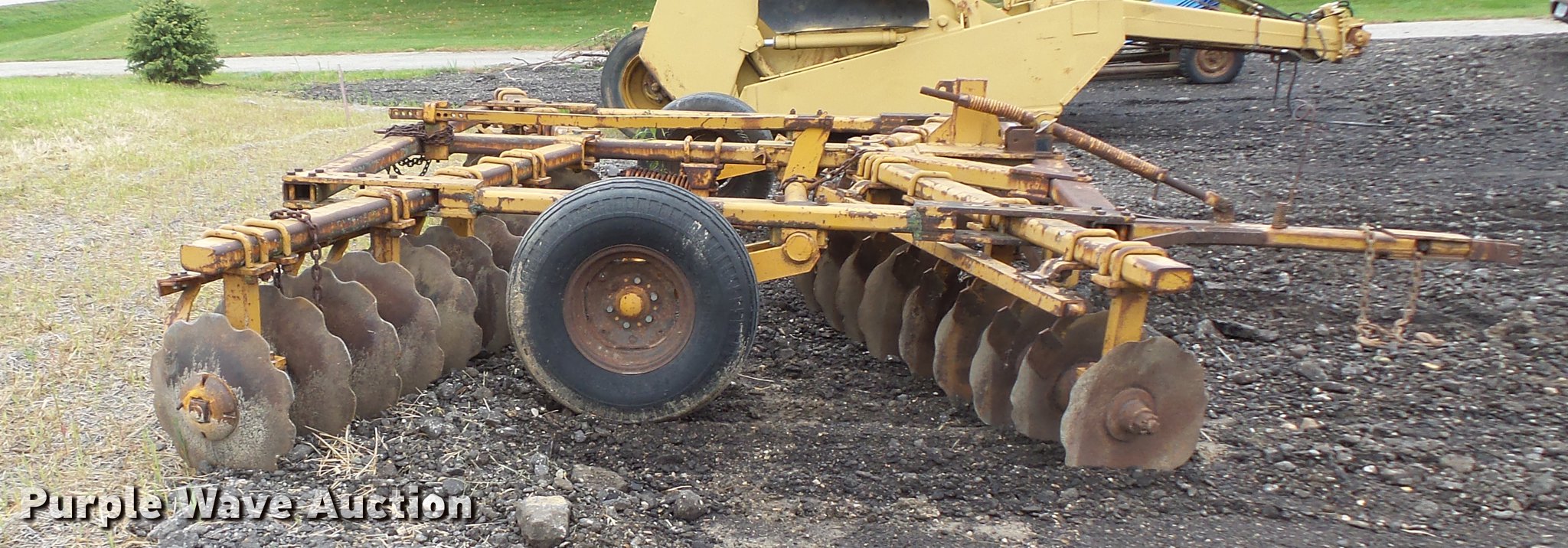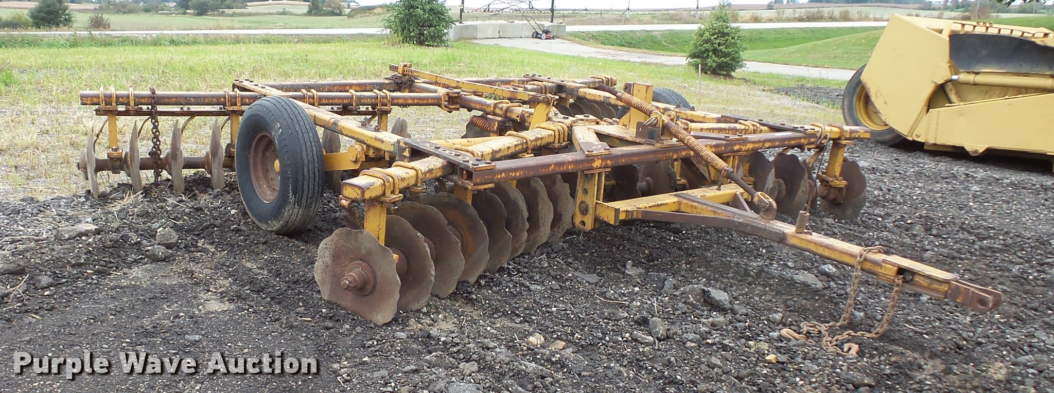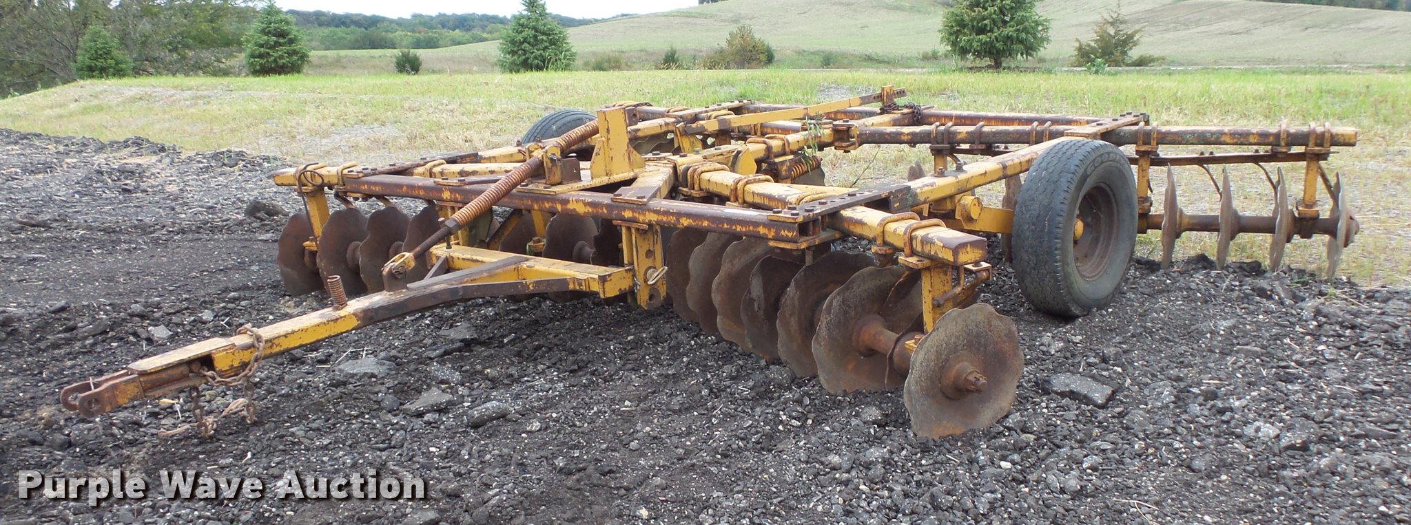 Purple Wave is selling a used Disk in Minnesota. This item is a Tandem disk with the following: 15'8" overall width, 22" diameter blades, 9" spacing, Hydraulic lift, Manual leveler, Rear hitch, Pin hitch, 10.00-15 tires, No hydraulic cylinder