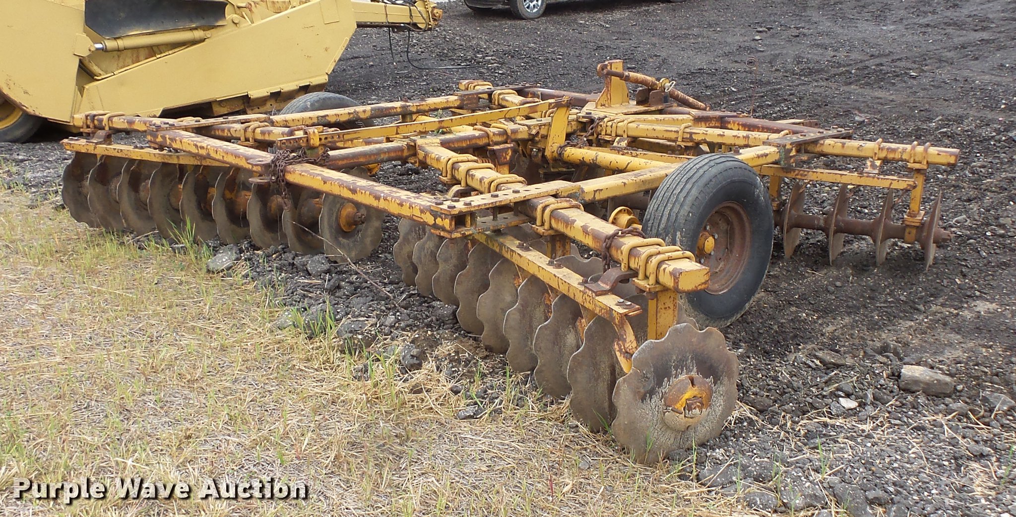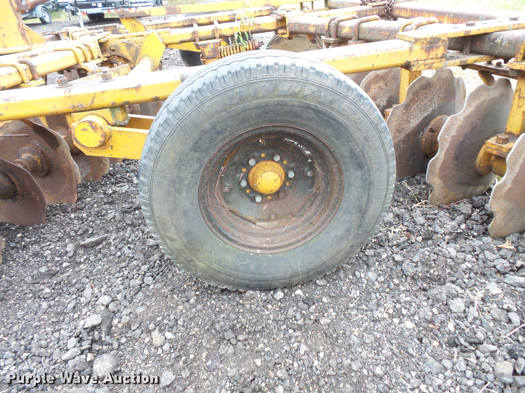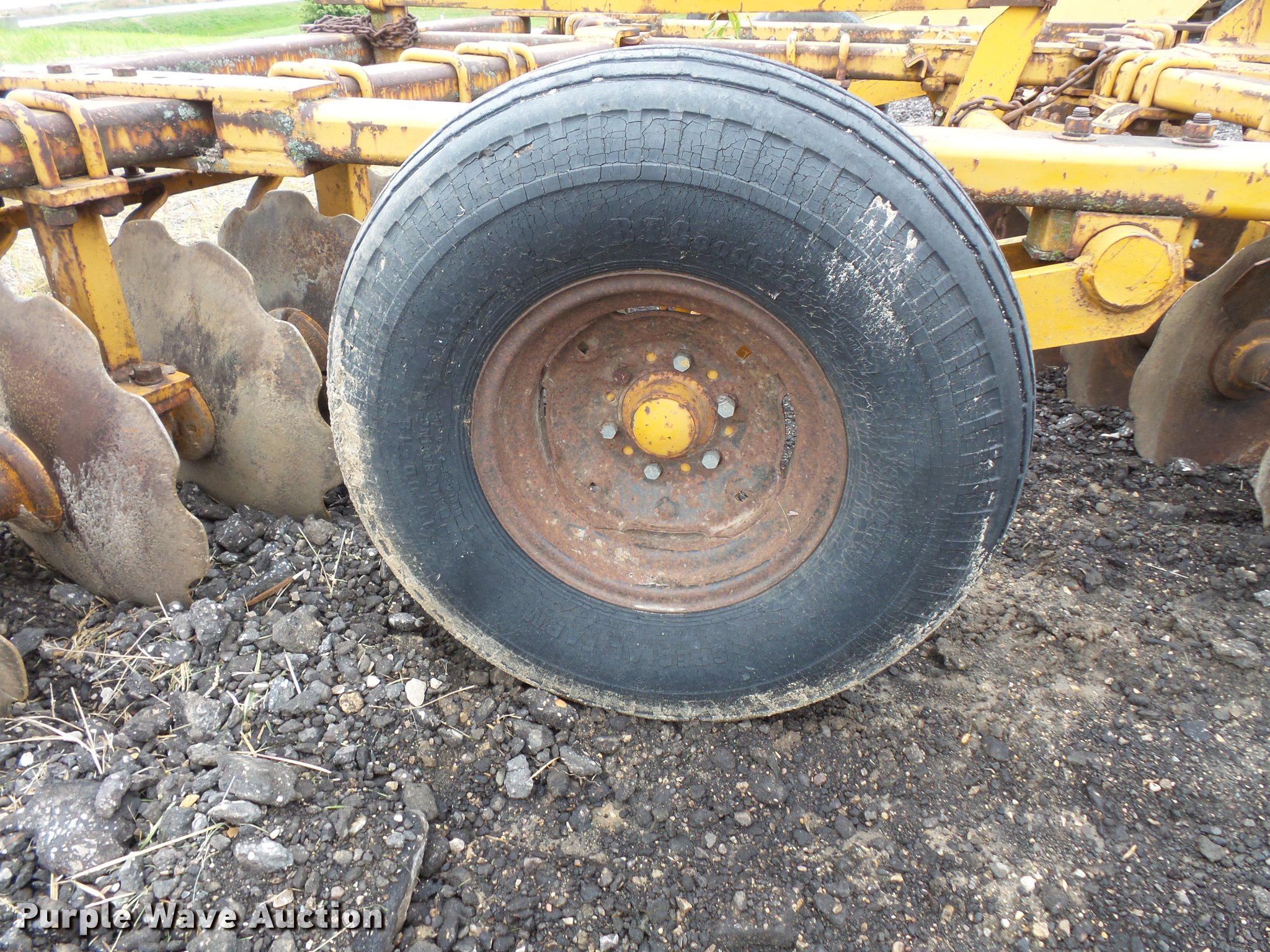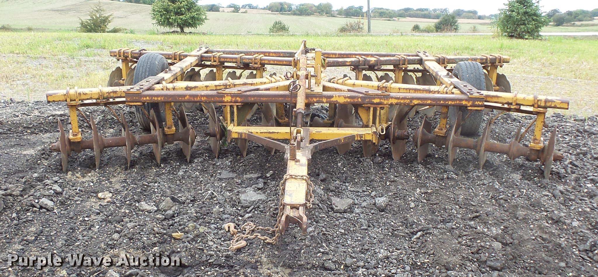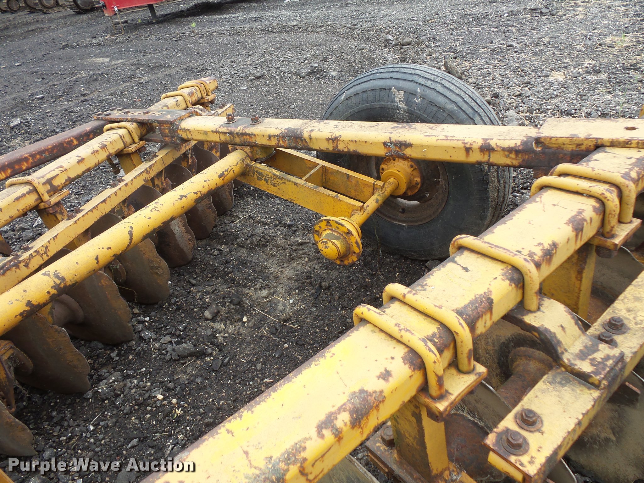 Purple Wave is selling a used Disk in Minnesota. This item is a Tandem disk with the following: 15'8" overall width, 22" diameter blades, 9" spacing, Hydraulic lift, Manual leveler, Rear hitch, Pin hitch, 10.00-15 tires, No hydraulic cylinder