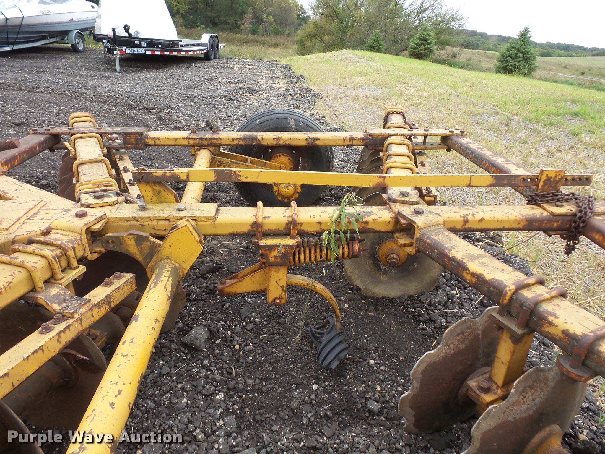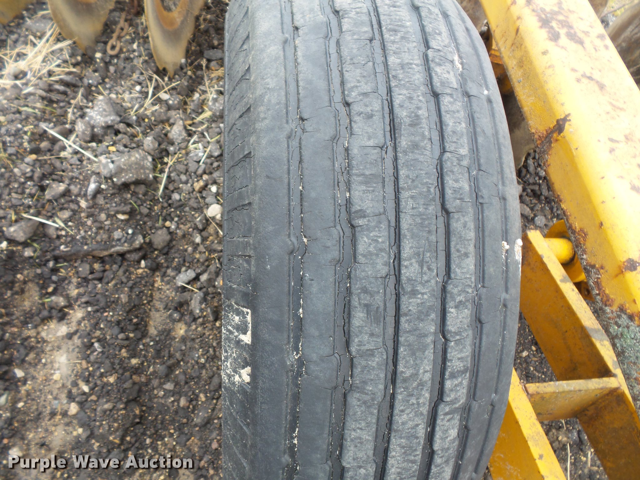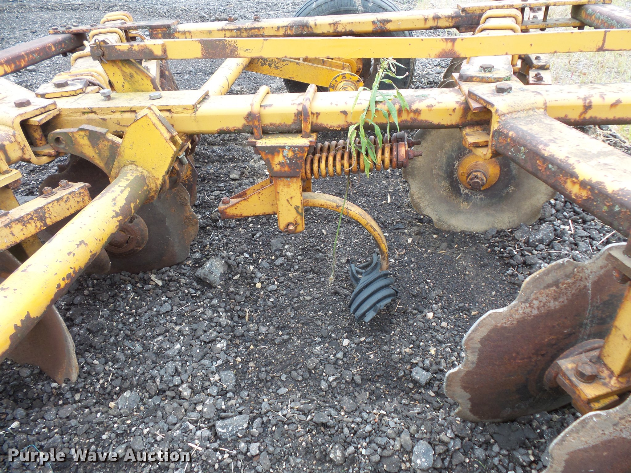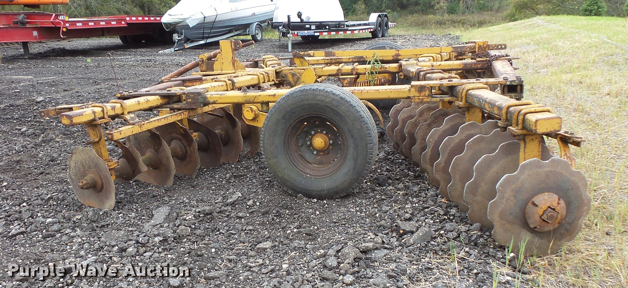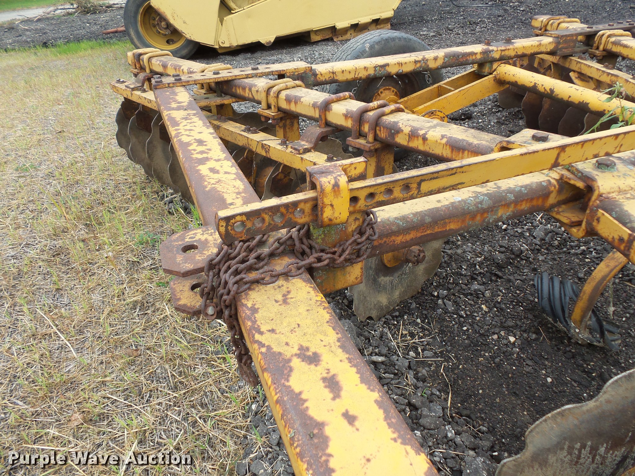 Purple Wave is selling a used Disk in Minnesota. This item is a Tandem disk with the following: 15'8" overall width, 22" diameter blades, 9" spacing, Hydraulic lift, Manual leveler, Rear hitch, Pin hitch, 10.00-15 tires, No hydraulic cylinder