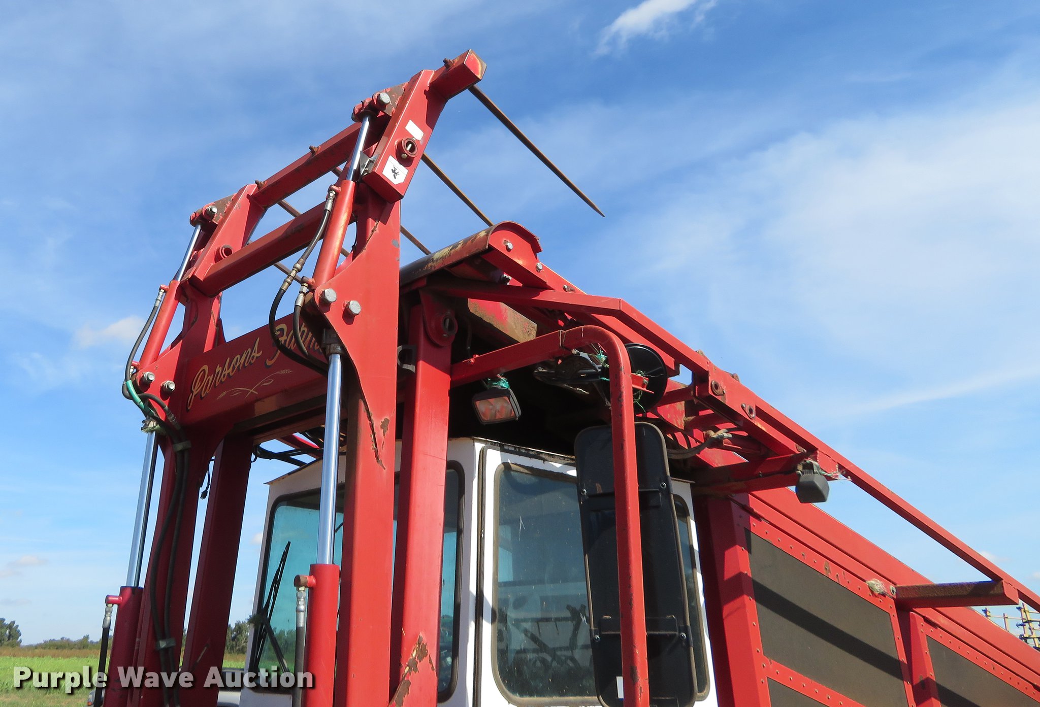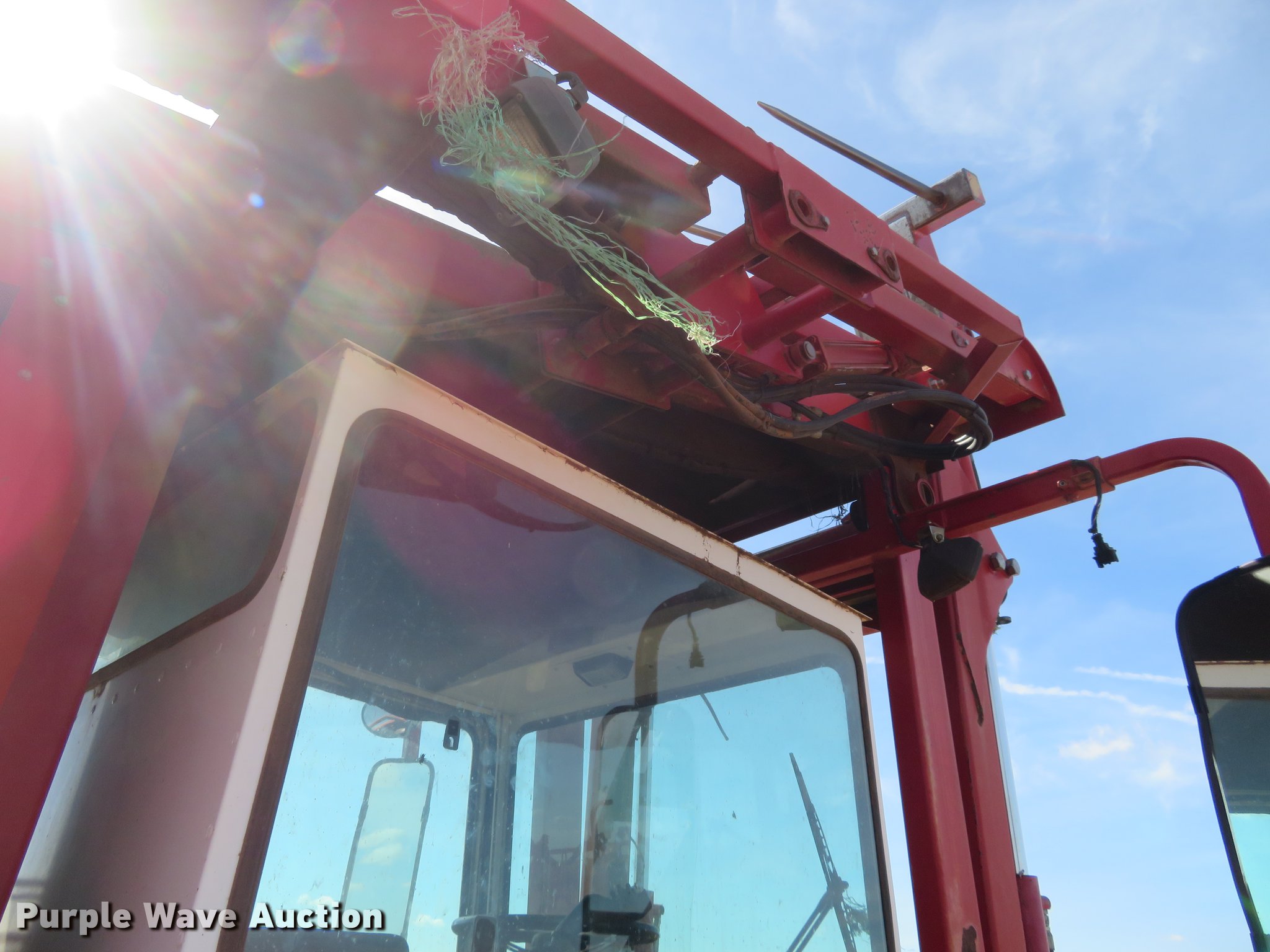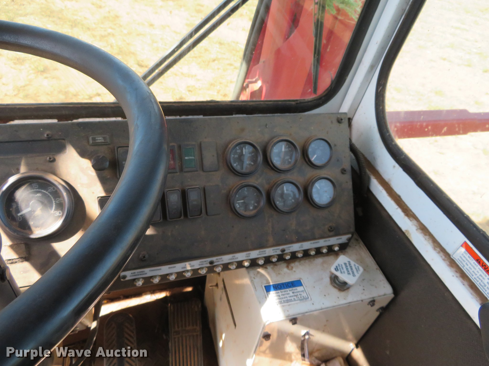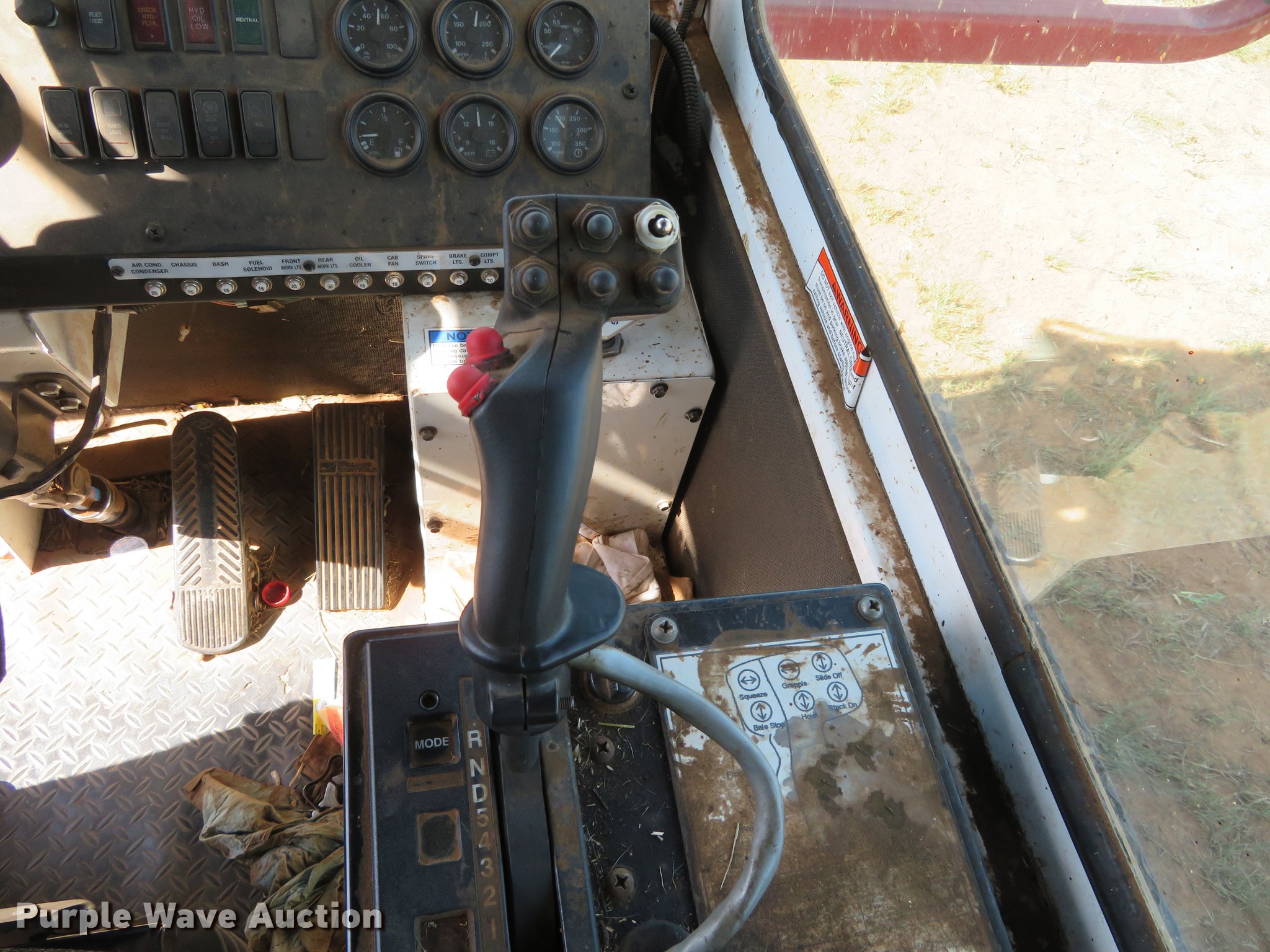 Stinger 6500 hay bale stacker. 85,032 miles on odometer, Six cylinder diesel engine, Allison automatic transmission, AC and heat, AM/FM, Air suspension seat, Work lights, Hydraulic operation, Spring suspension, Air brakes, 445/65R22.5 front tires, 700/50-22.5 rear tires, Unknown operating condition, Repossessed asset; no condition history available. Item may be missing components that may effect operating condition. Bidders are encouraged to physically inspect prior to placing bids., Serial 378. Anthony, KS 67003
