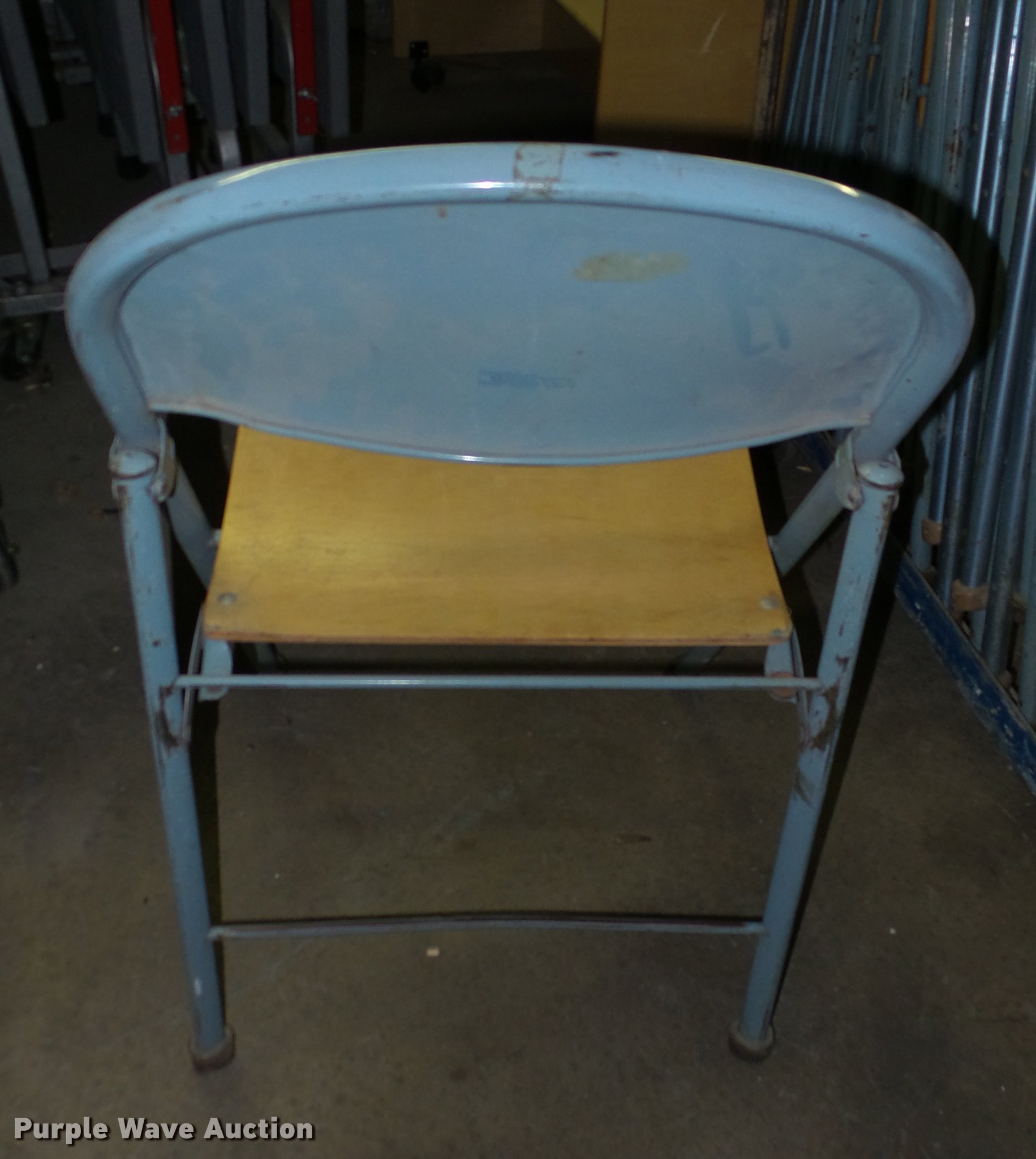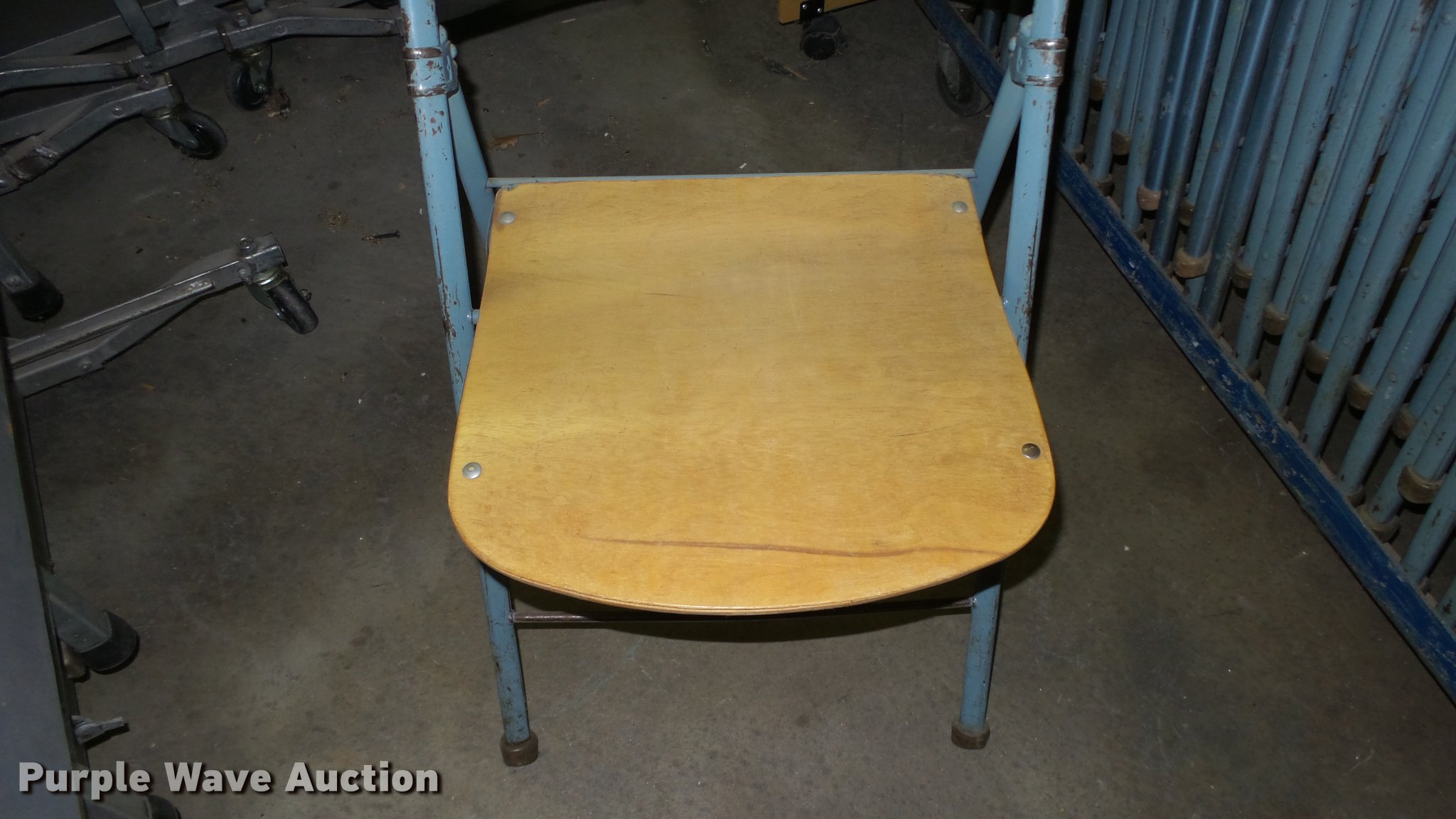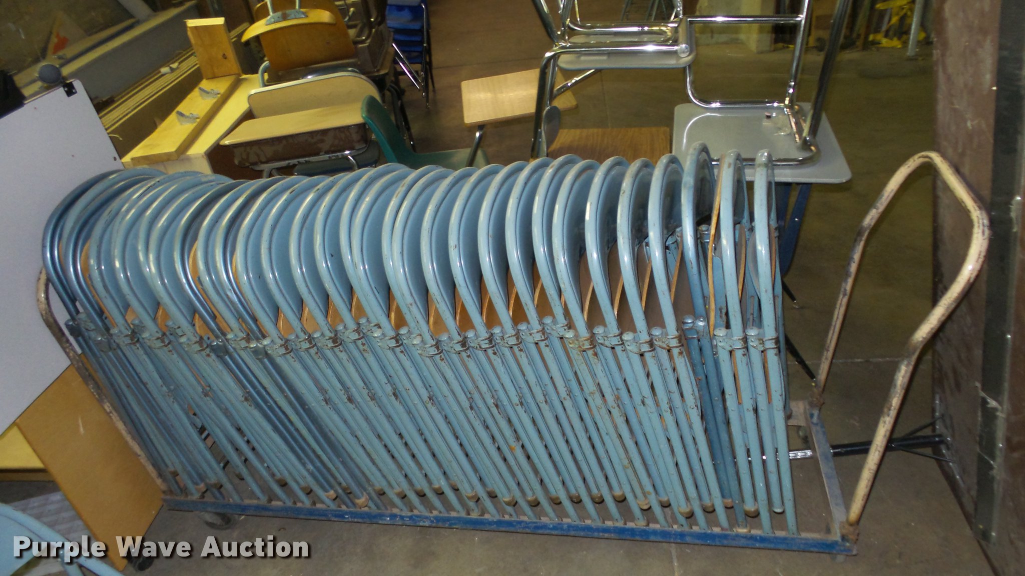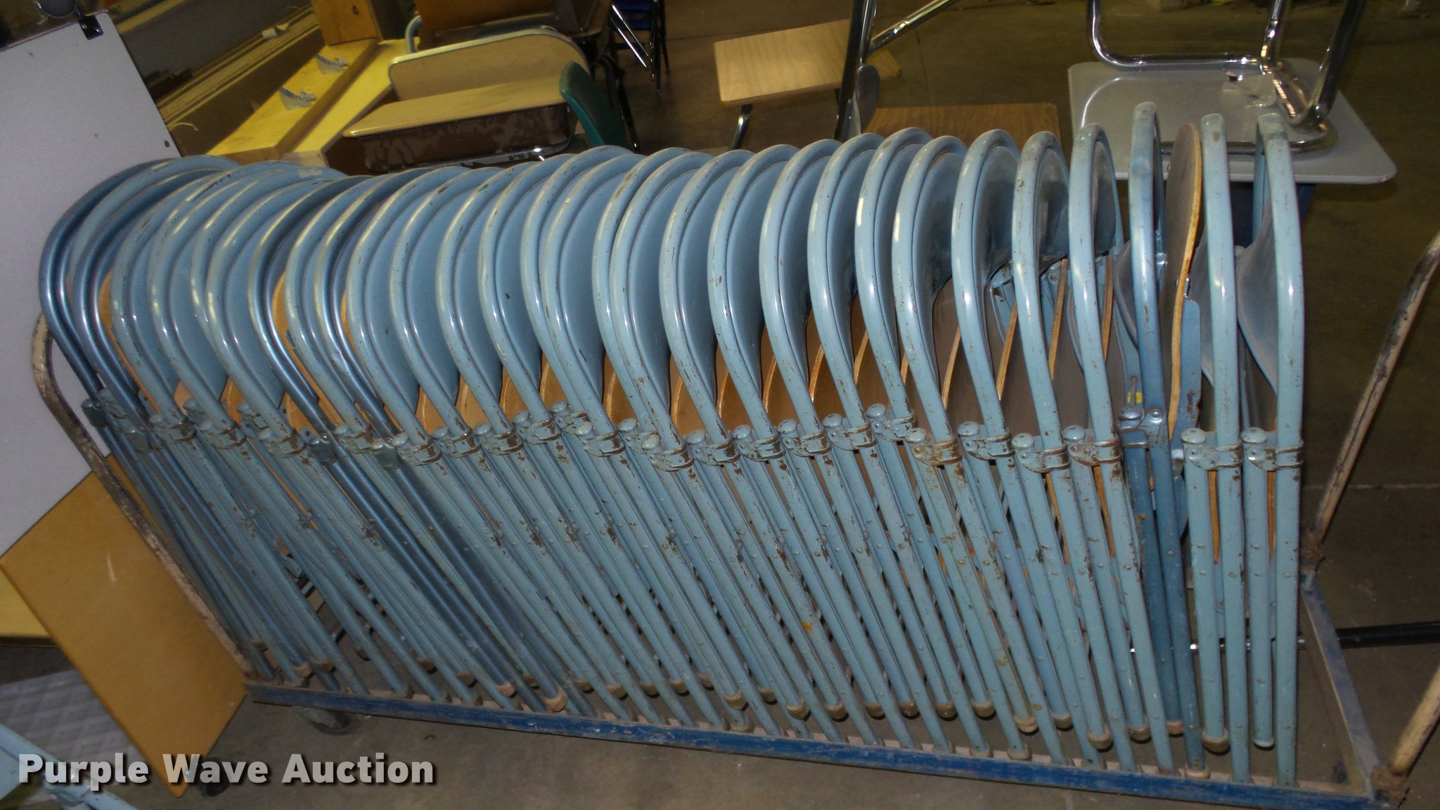 Purple Wave is selling a used Furniture in Kansas. This item is a Approximately 32 folding chairs with the following: Wood seat, Metal legs and back, Cart