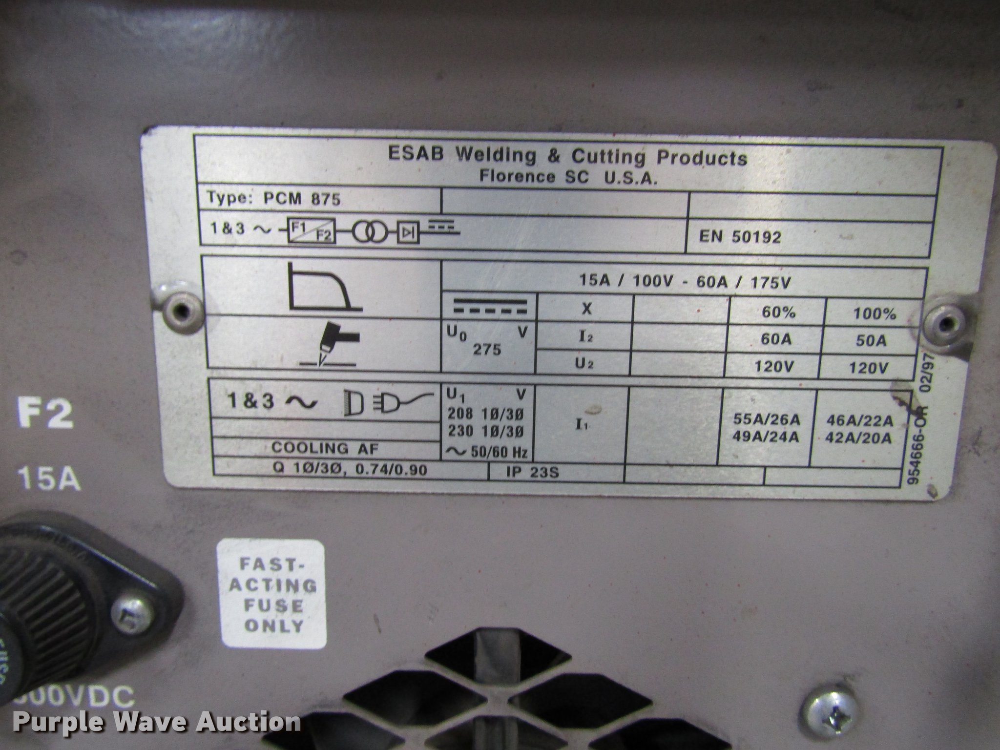 Esab PCM-875 plasma cutter has sold in Washington, Kansas for $907.50. Item DD3698 sold on November 6th, 2018.