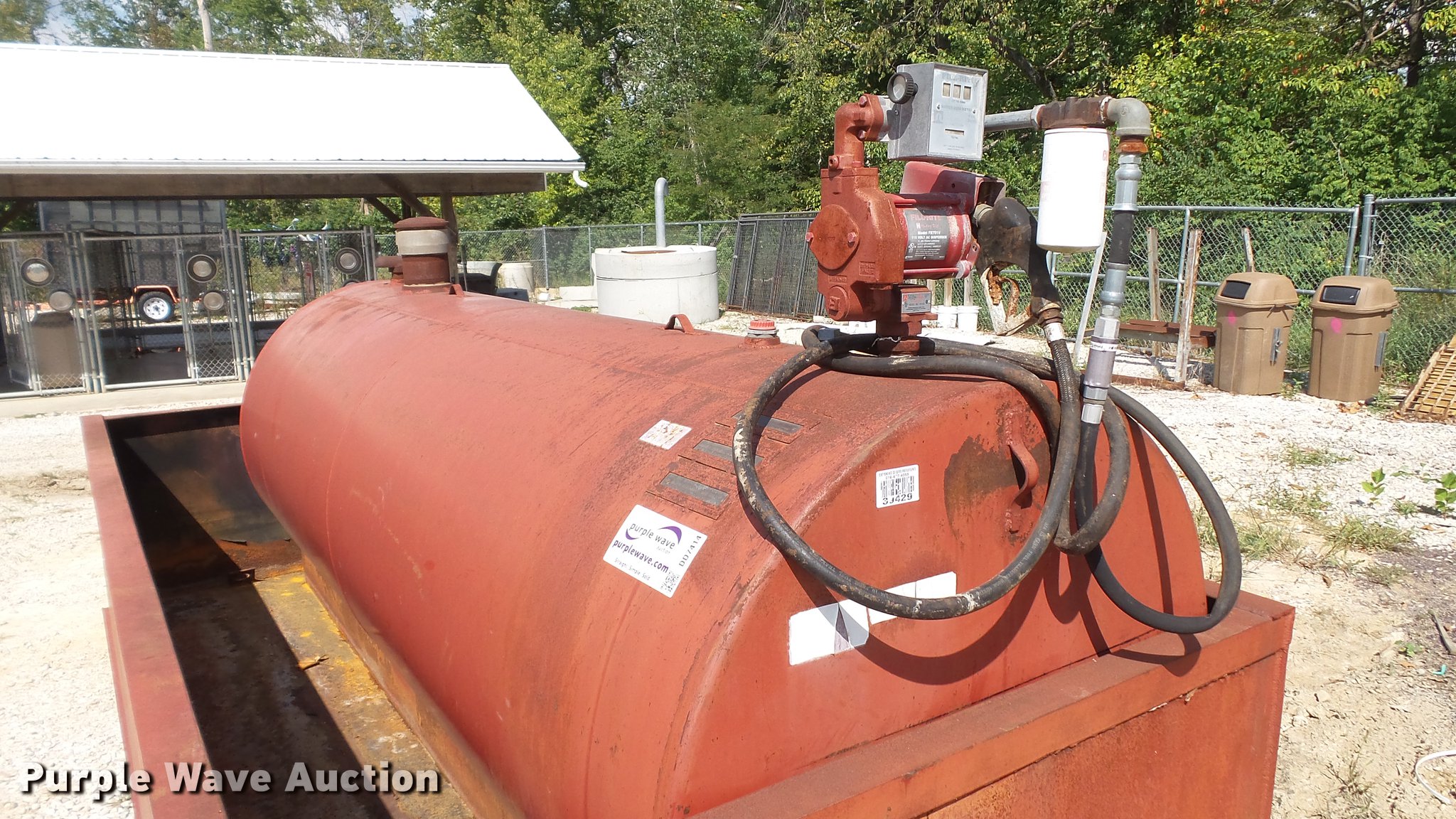 Purple Wave is selling a used Fuel and Lube in Missouri. This item is a Fuel tank with the following: 1,000 gallon capacity, 115V fuel pump, Nozzle, hose, and counter, Containment box, 143"L x 72"W x 30"H