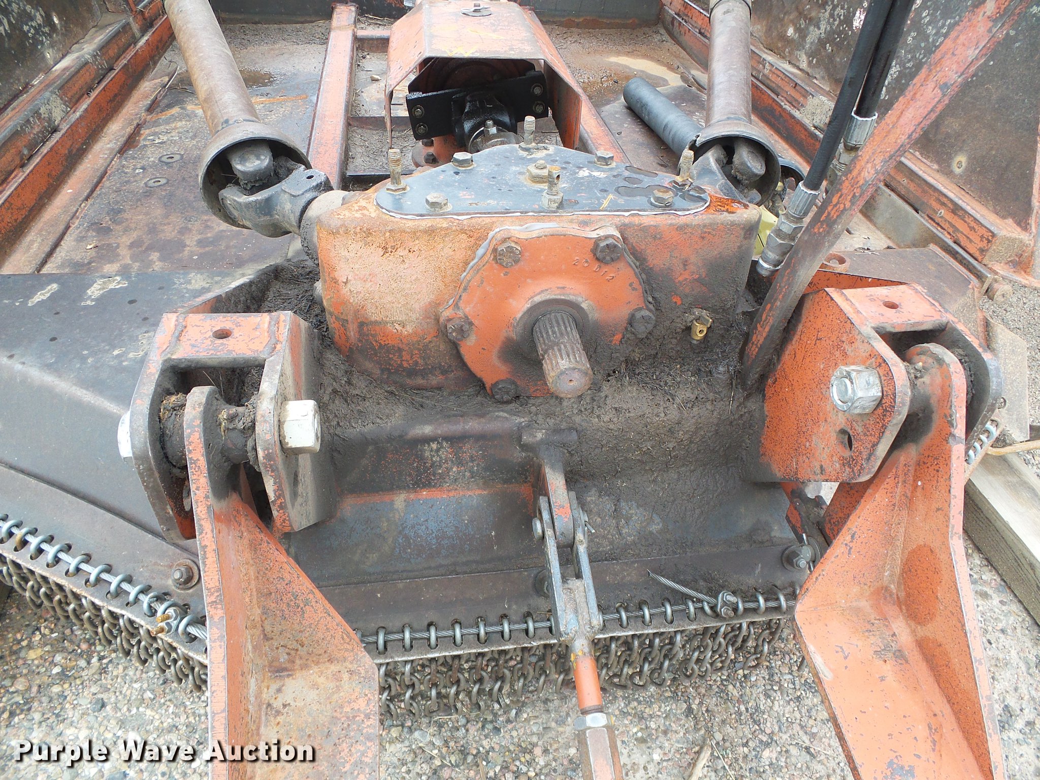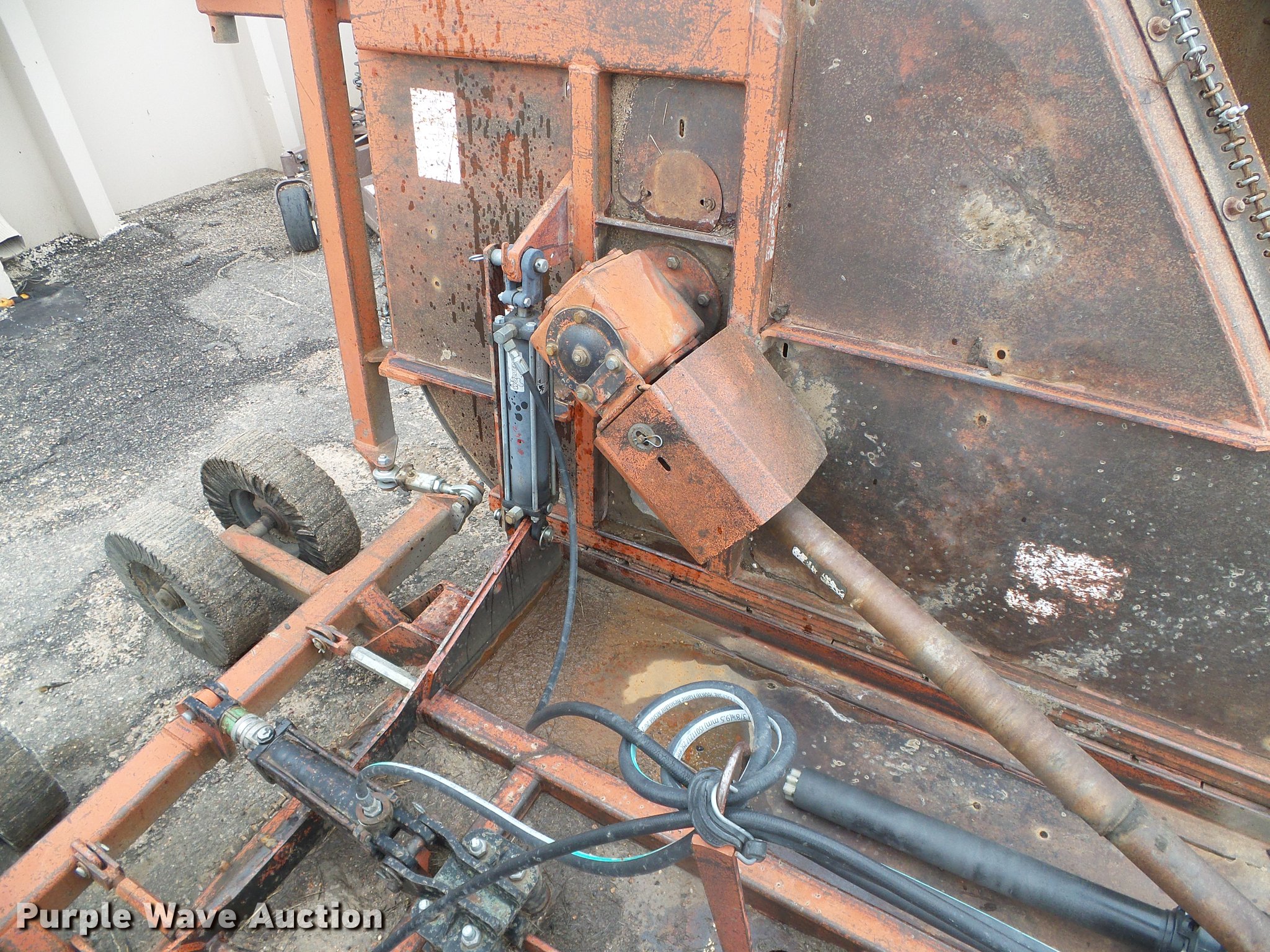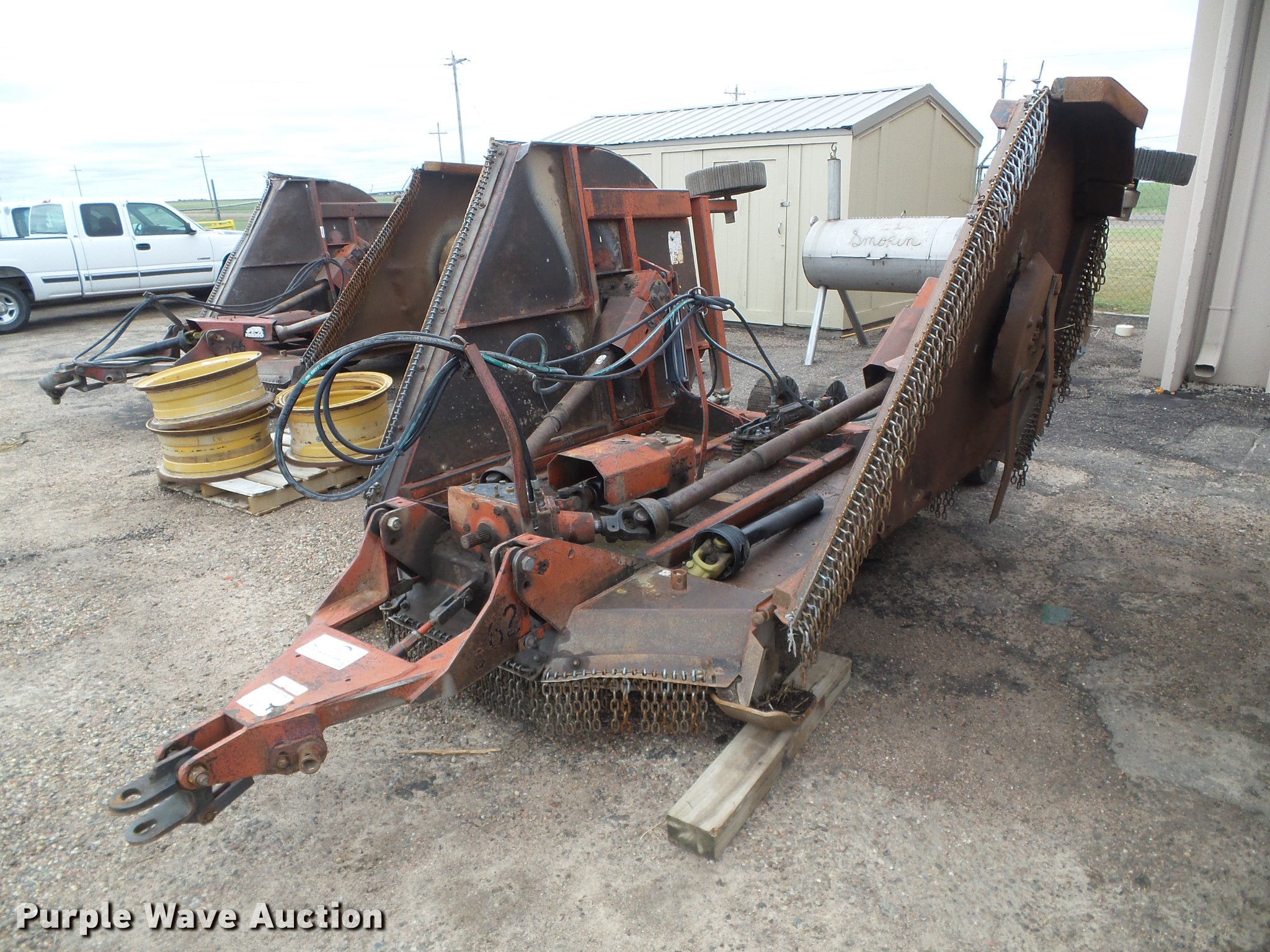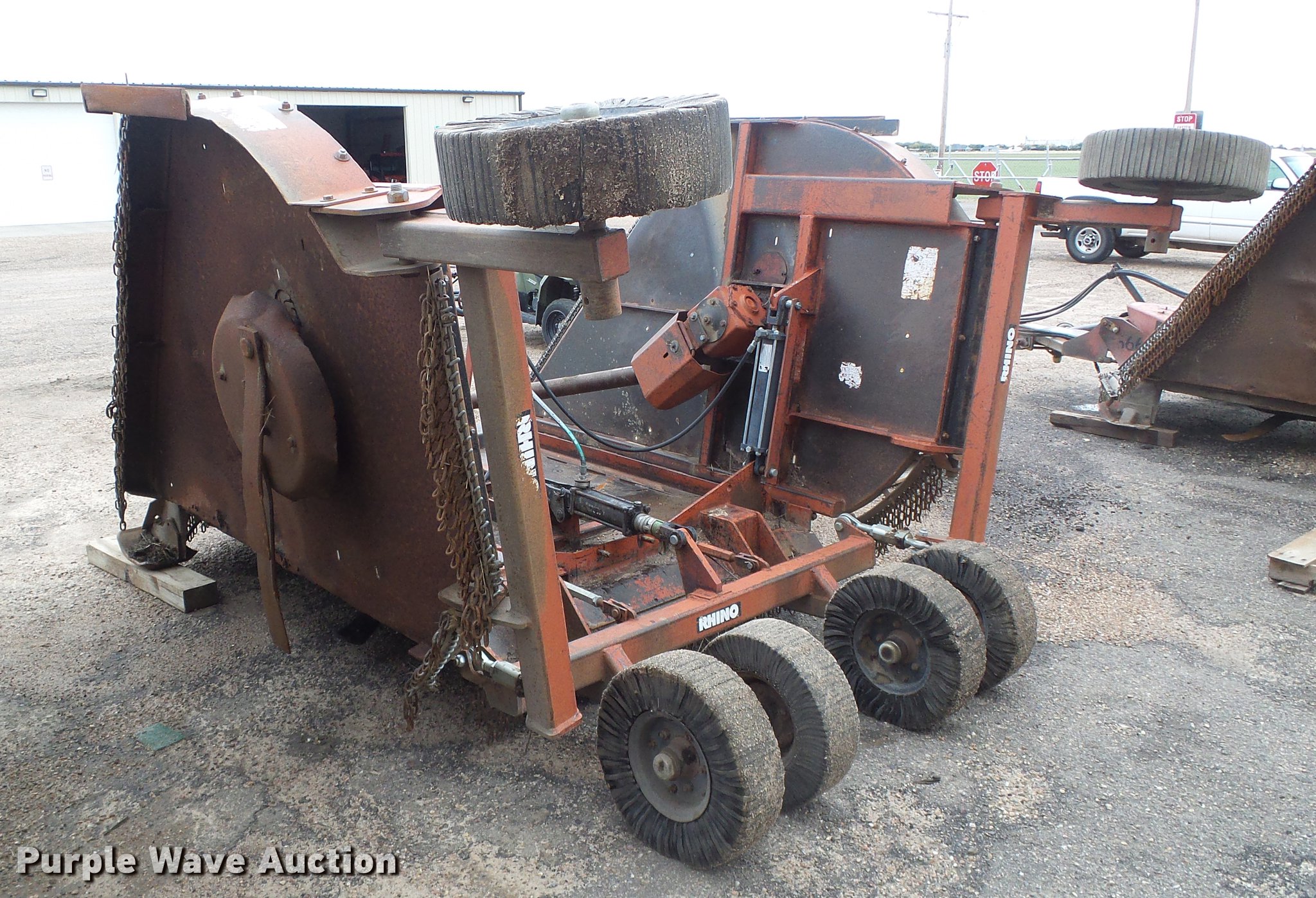 Purple Wave is selling a used Mower, Cutter, Shredder in Kansas. This item is a 2000 Rhino FM15 batwing rotary mower with the following: 15'W, Rock guards, Hydraulic lift and fold, 1000 PTO, Pin hitch, Leg stands, Solid trailing wheels, Hydraulic cylinder leaks, Driveline bearing needs replaced, Serial 15503, Unit# 362