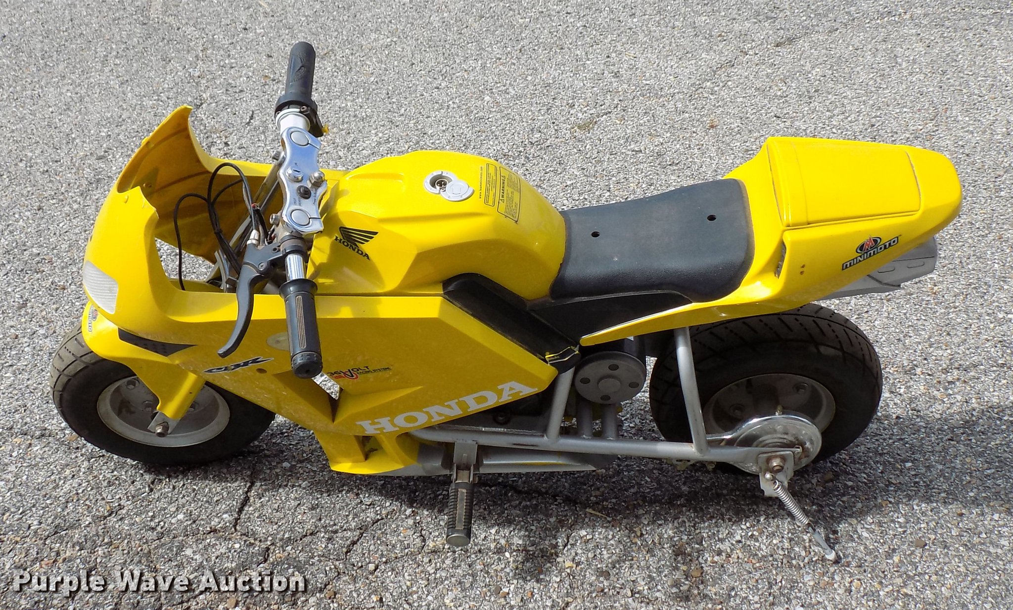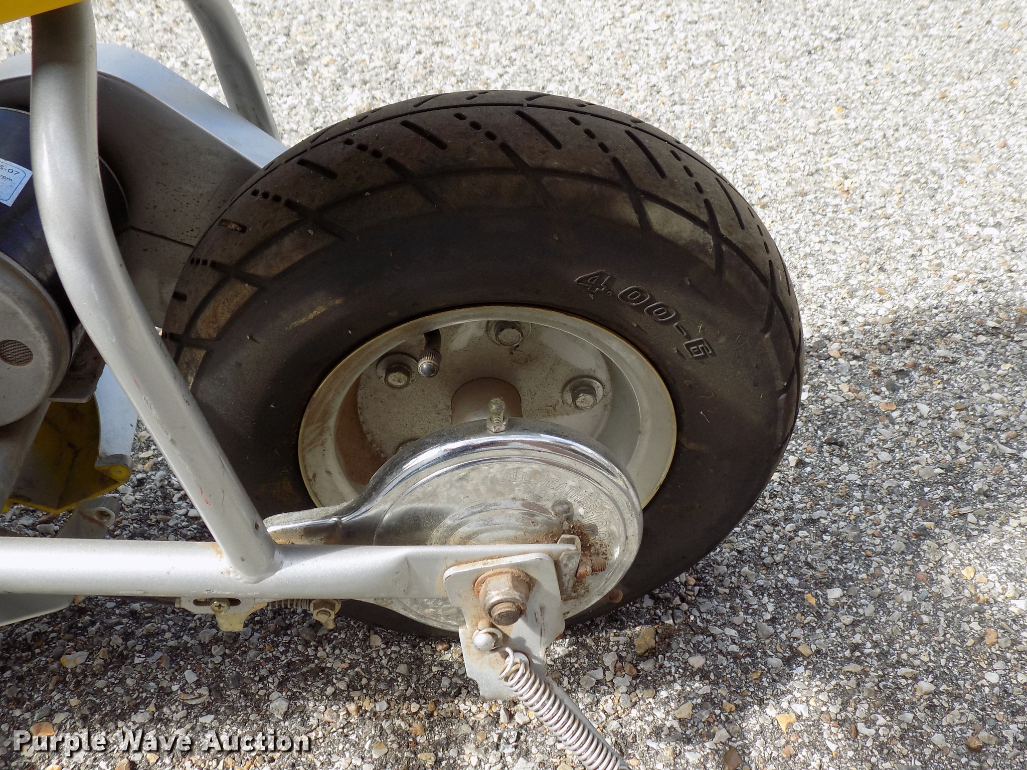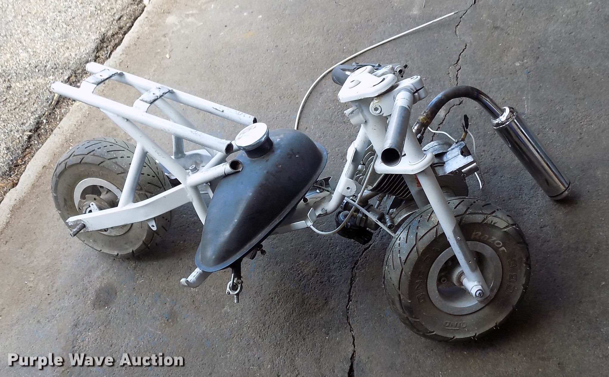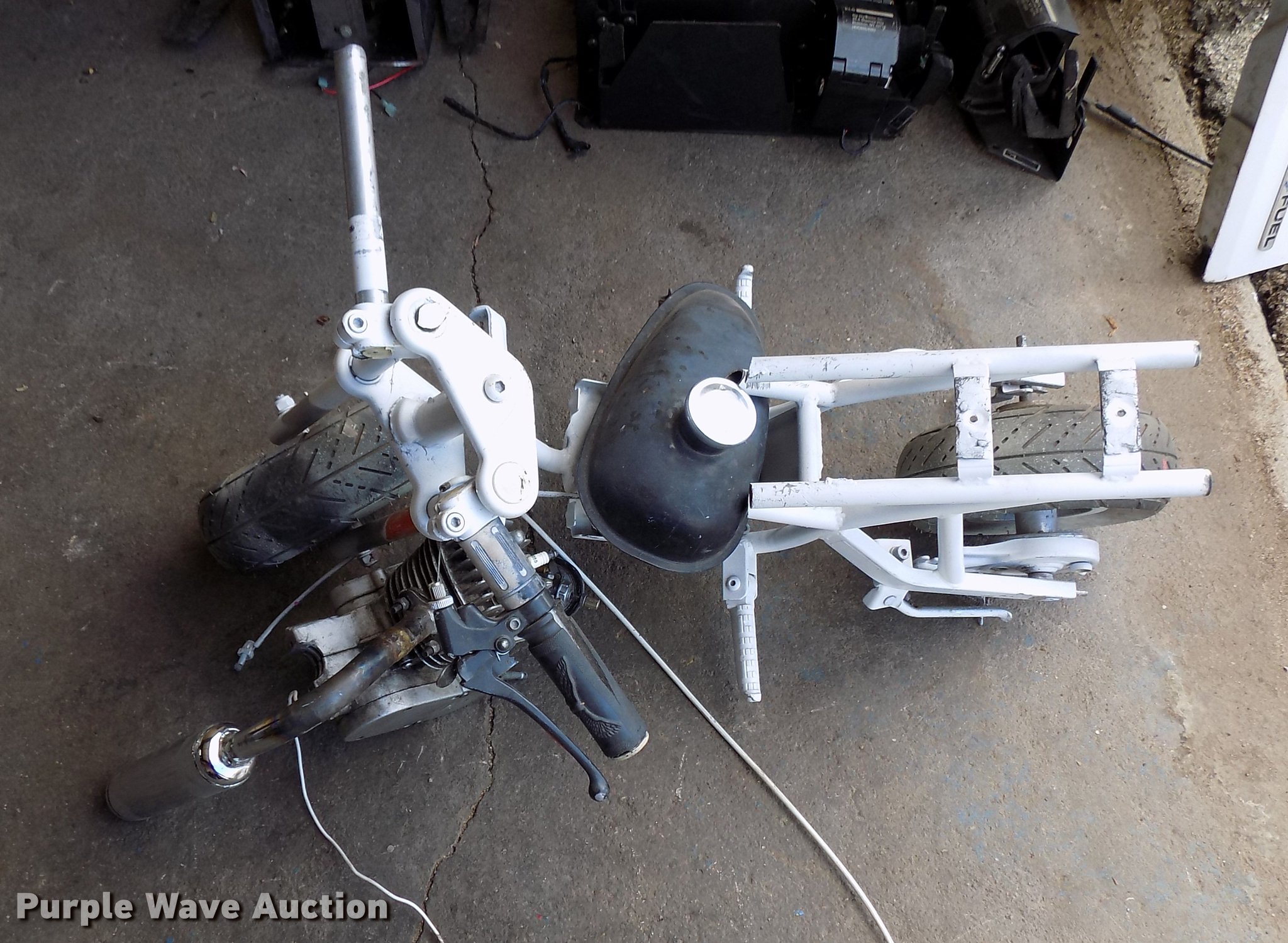 Purple Wave is selling a used Sporting Goods in Kansas. This item is a USA TRF gas powered bicycle with the following: Honda Mini Moto mini bike 36V electrical system, Unknown operating condition, Wizard lawn mower, 20"W cutting capacity, Briggs & Stratton gas engine, Unknown operating conditions