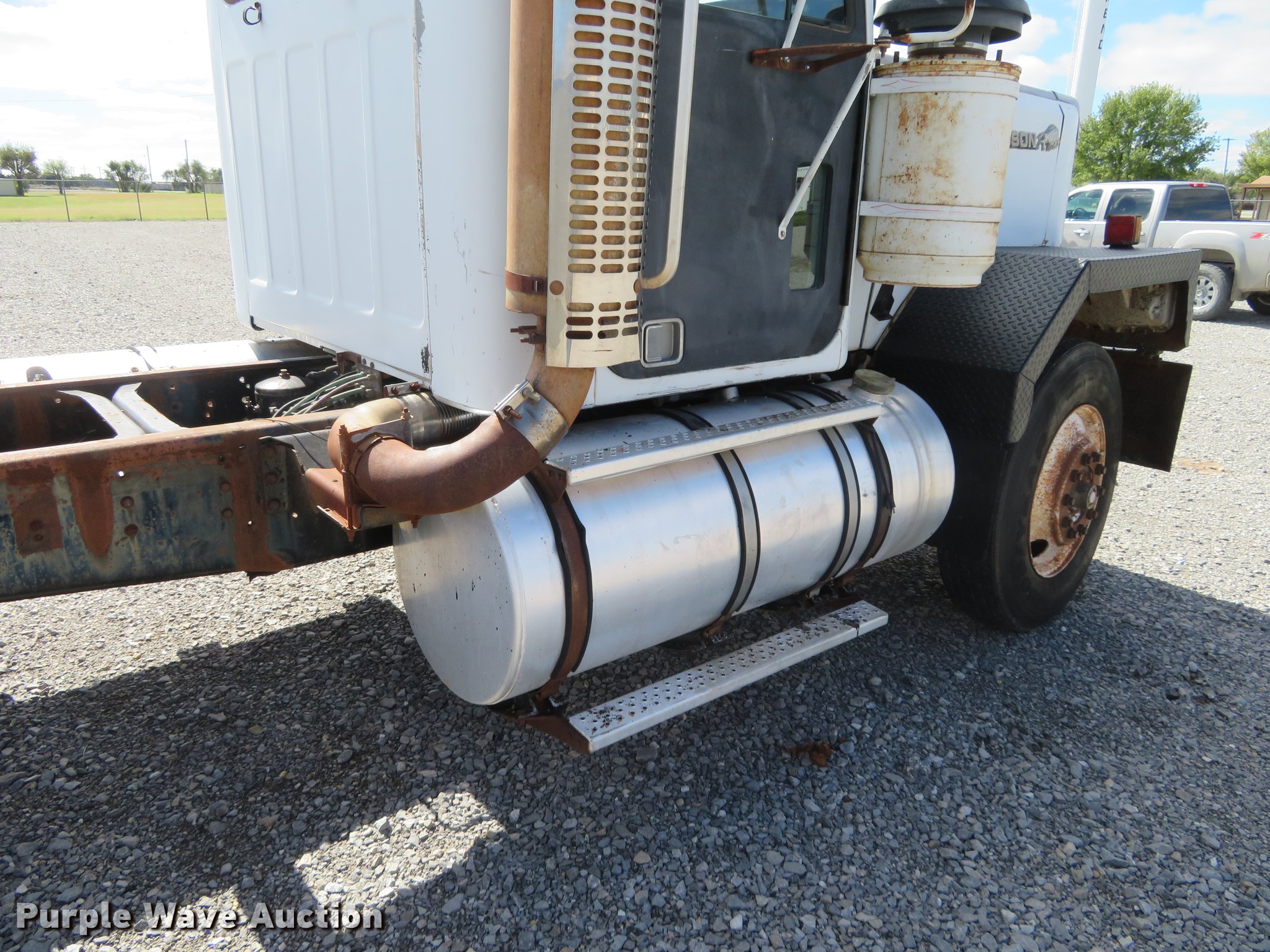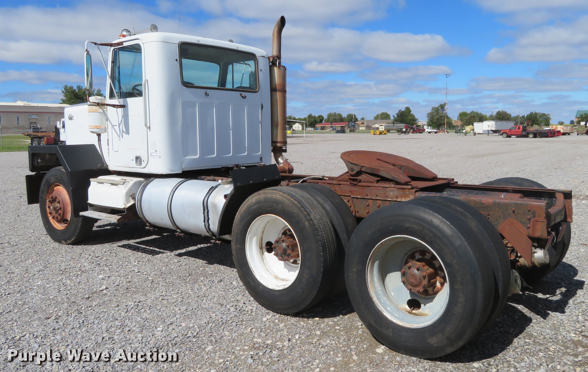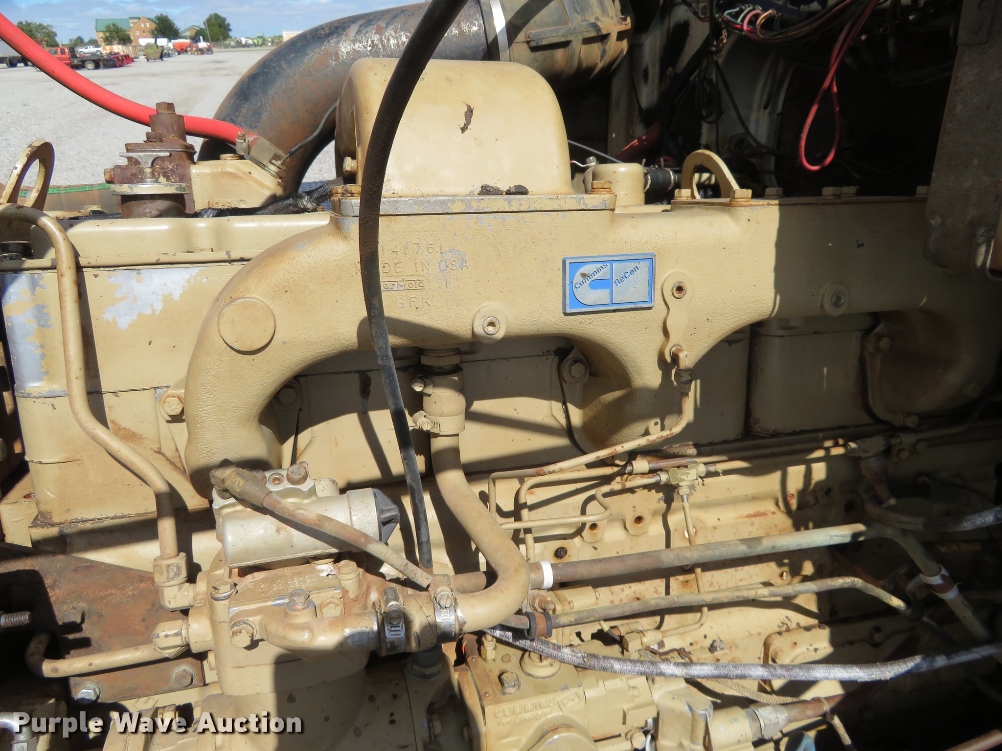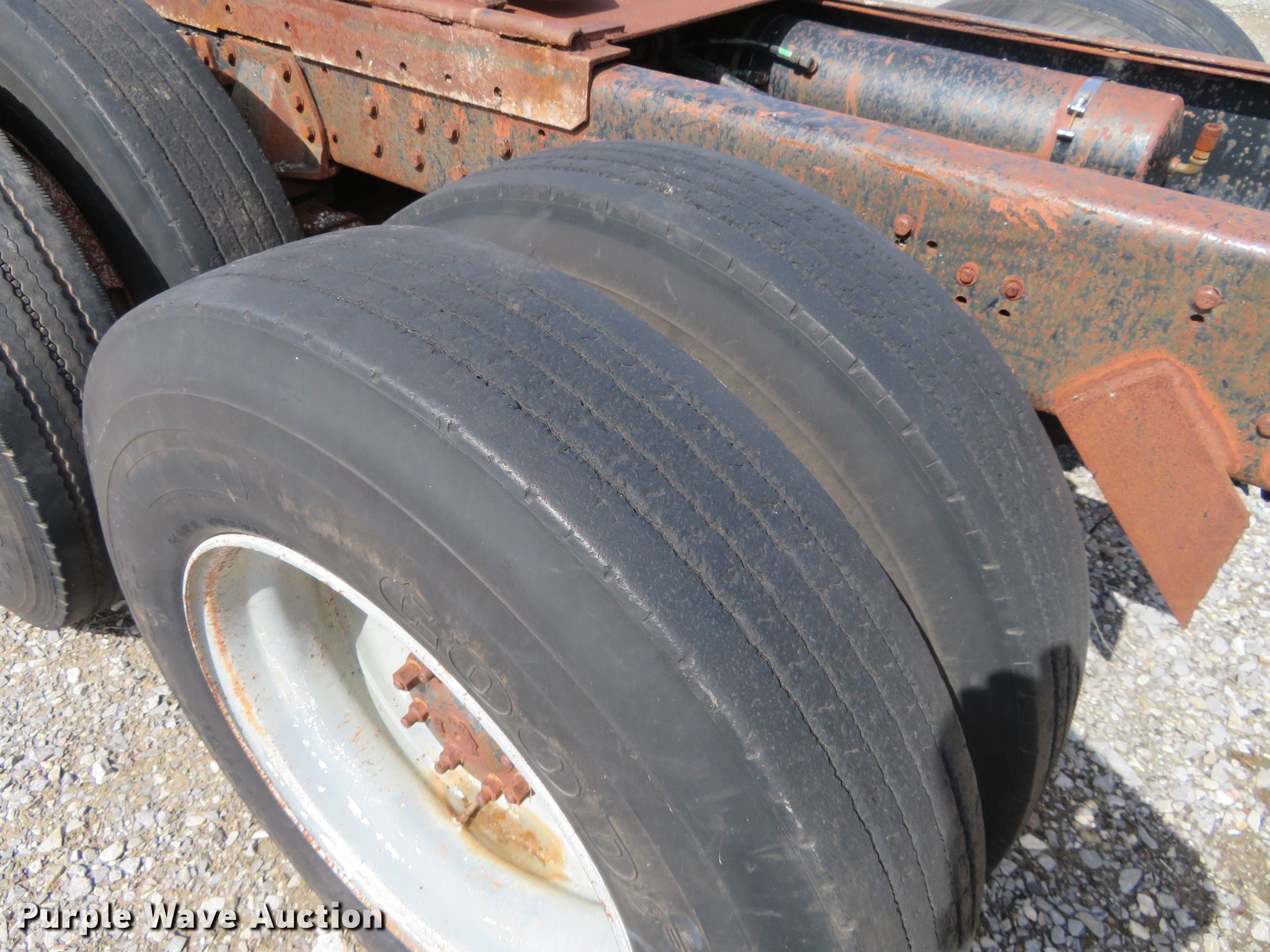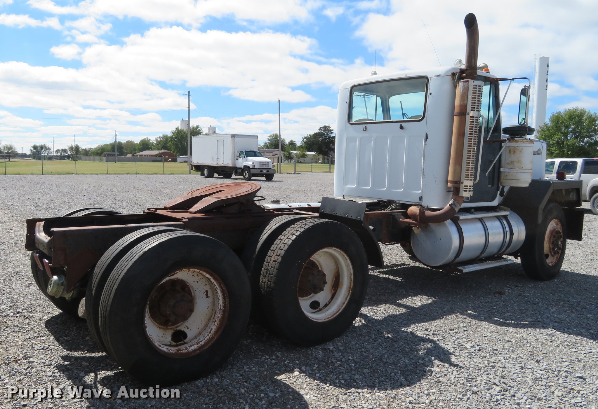 Purple Wave is selling a used Truck Tractor in Oklahoma. This item is a 1980 Chevrolet Bison semi truck with the following: 283,584 miles on odometer, 6,552 hours on meter, Cummins six cylinder diesel engine, 10 speed manual transmission, Tandem axle, Heat, Sliding fifth wheel plate, Air brakes, Spring suspension, 11R24.5 tires, GVWR 50,000 lbs, FAWR 12,000 lbs, RAWR 38,000 lbs, Engine block cracked