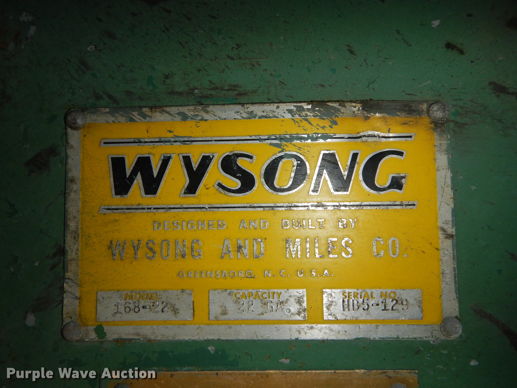 Wysong 168-22 metal brake has sold in Kansas City, Kansas for $2145. Item DF1890 sold on November 7th, 2018.