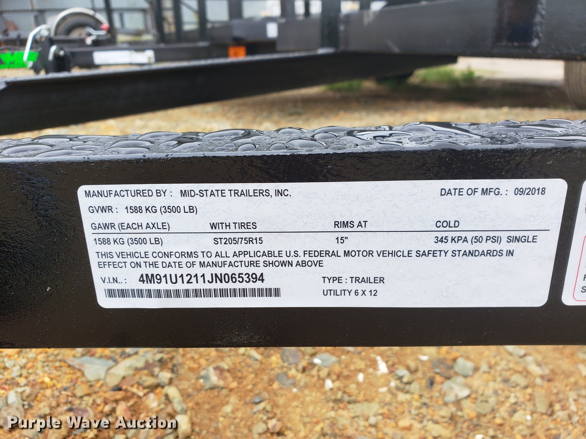 Purple Wave is selling a used Car or Utility Trailer in North Carolina. This item is a 2018 MST 6X12 utility trailer with the following: 16'L x 91"W overall, 10'L x 72"W wood deck, 2'L dovetail, 3'L ramps, 2" ball hitch, Single leg landing gear, Spring suspension, Electric brakes, Aluminum wheels, 205/75R15 tires, GVWR 3,500 lbs