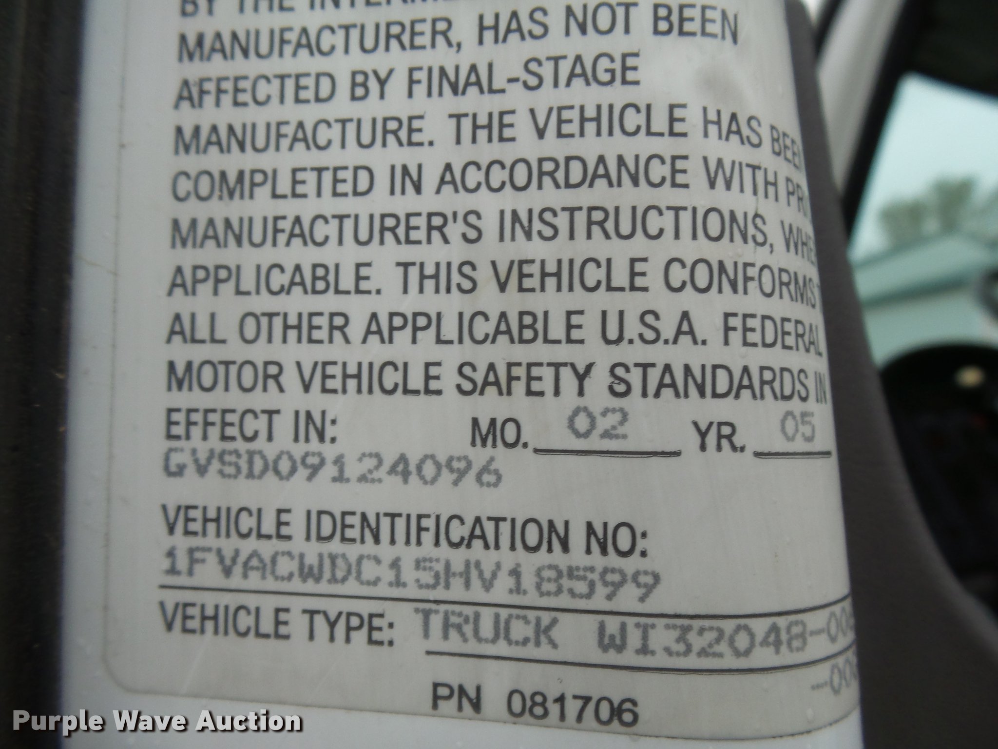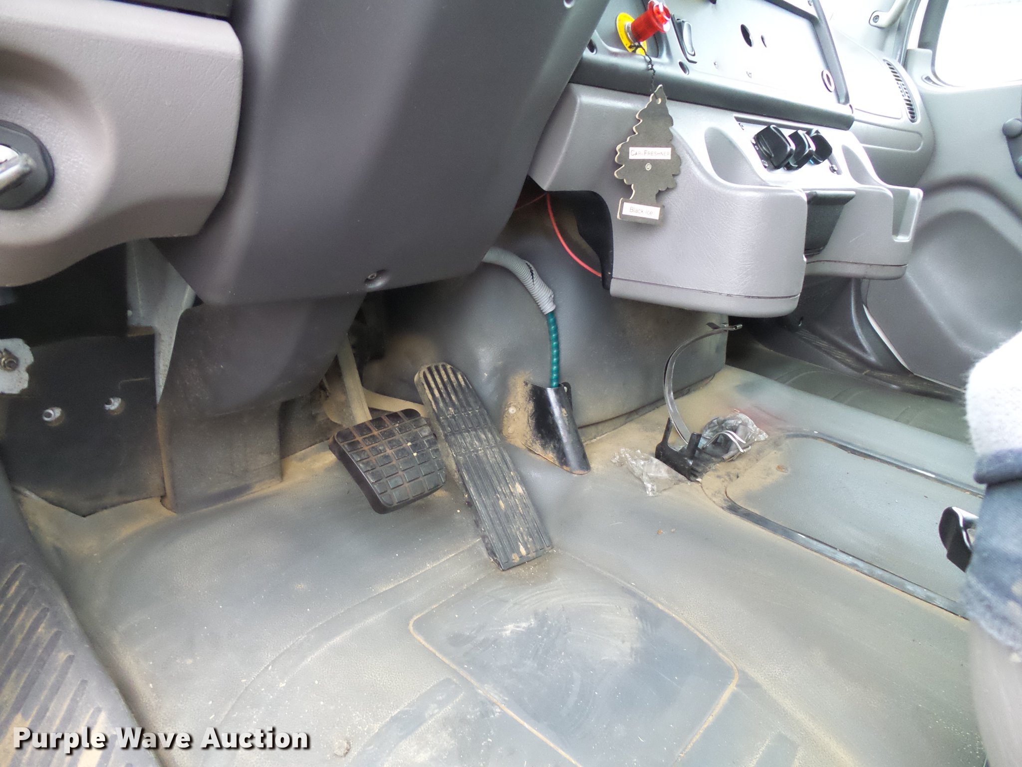 2005 Freightliner Business Class M2 truck cab and chassis. 240,798 miles on odometer, 8,291 hours on meter, Caterpillar C7 7.2L L6 turbo diesel engine, Automatic transmission, Single axle, Heat, AM/FM, Air suspension seat, Block heater, Single fuel tank, Air suspension, Air brakes, 11R22.5 tires, GVWR 26,000 lbs. North Dakota title. 1FVACWDC15HV18599. Lenco Construction. 11911 135th Ave SE. Sawyer, ND 58781