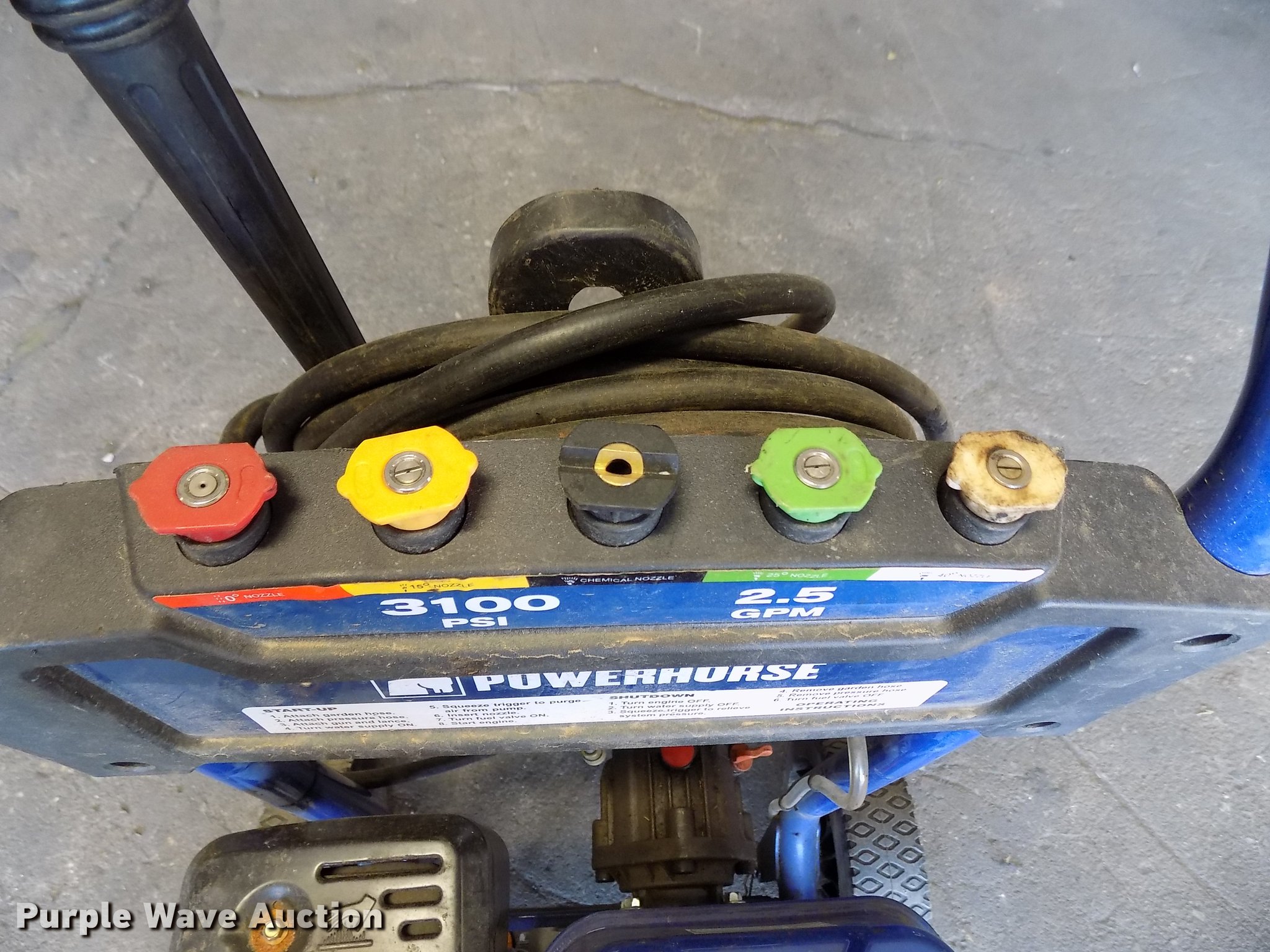 Purple Wave is selling a used Pressure Washer in Oklahoma. This item is a Powerhorse 7501143A pressure washer with the following: 212cc gas engine, 2.5 gpm, 3,100 psi max, Hose wand, (5) nozzles, Serial 05163186