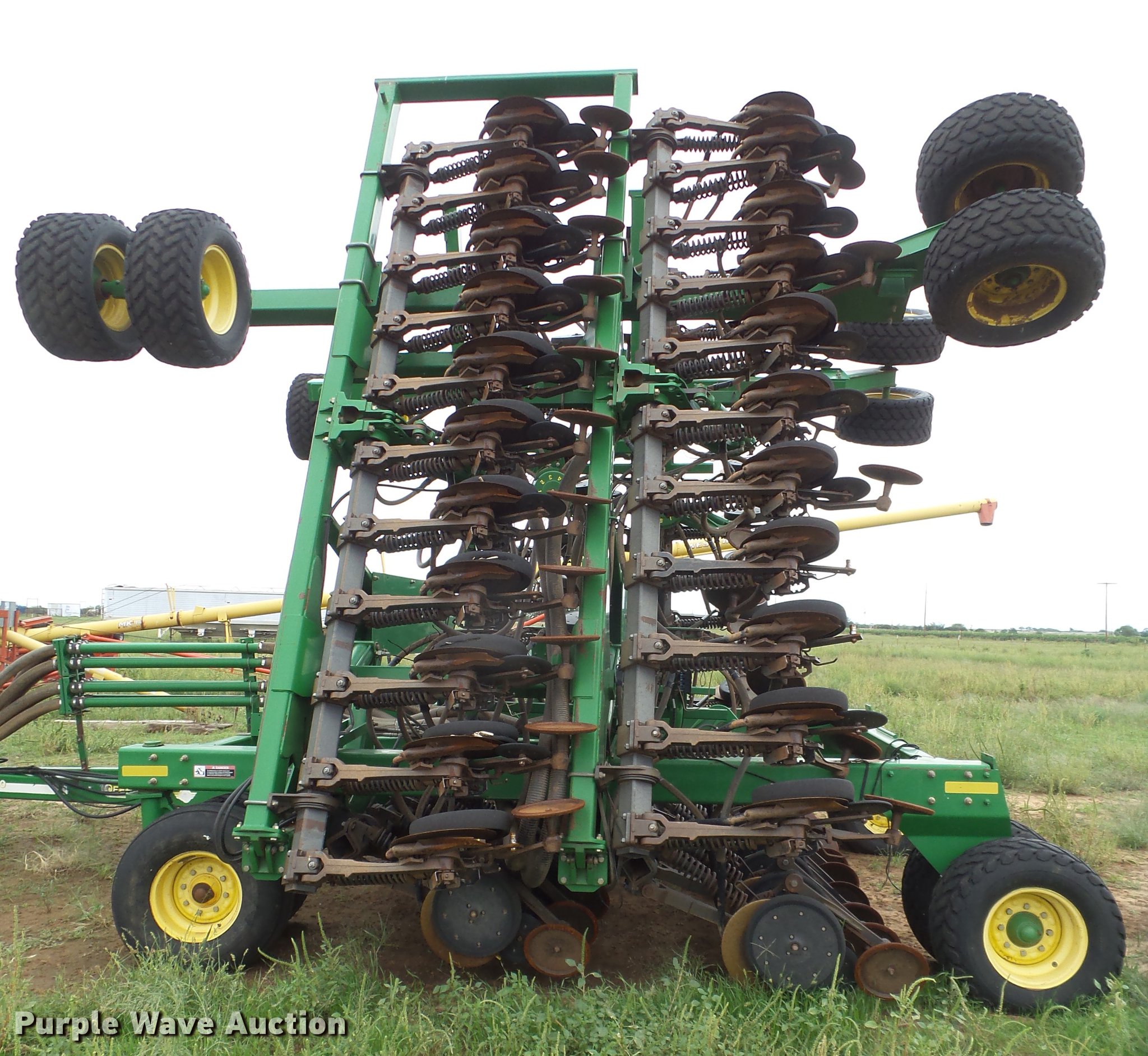 Purple Wave is selling a used Air Seeder in Texas. This item is a 2008 John Deere 1890 air seeder with the following: 42'W, 66 row units, 7.5" row spacing, Hydraulic wing fold, Bulk fill system, 270 bushel capacity, Air delivery, John Deere 1910 air commodity cart, (2) compartments, 270 bushel total capacity, 120 and 150 bushel seed hoppers, 28L-26 tires, Serial A01910T725144, Vacuum metering, HD spring down pressure, Single disk openers, Single gauge wheels, Single rubber closing system, (16) 31x13.5-15 transport tires, Serial A01890X725147