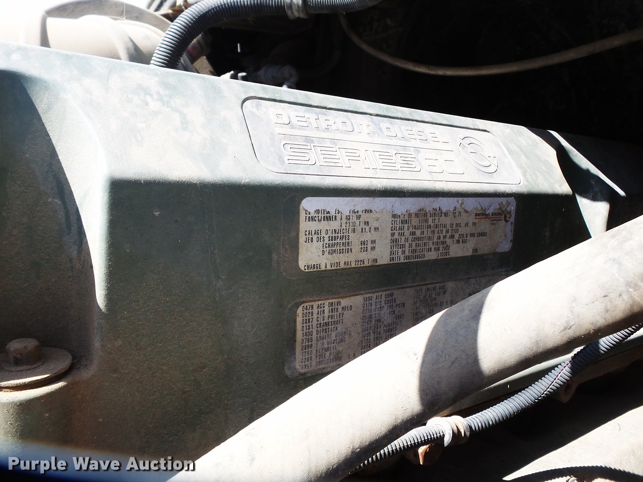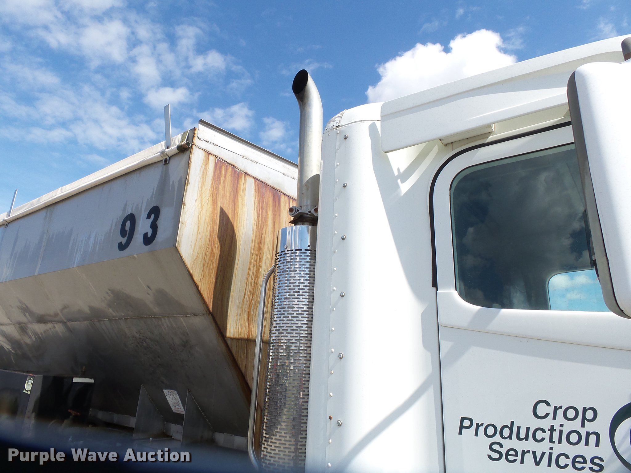 Purple Wave is selling a used Fertilizer or Feed Delivery Truck in Arkansas. This item is a 2001 Freightliner Century Class fertilizer tender truck with the following: 993,080 miles on odometer, Detroit Diesel Series 60 12.7L L6 turbo diesel engine, 470 HP, Eaton Fuller 10 speed manual transmission, Tandem axle, Inter-axle differential lock, AC and heat, Cruise, Power windows and mirrors, Air suspension seat, Air ride cab, Adams fertilizer tender bed, 17'L, (2) compartments, 20'L x 9" diameter side discharge auger, Hydraulic lift, Roll tarp, Air suspension, Air brakes, 219" wheelbase, 295/75R22.5 tires, Unit# 28069