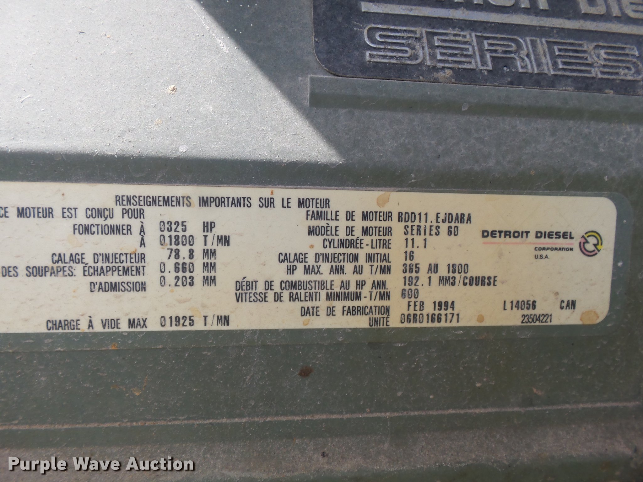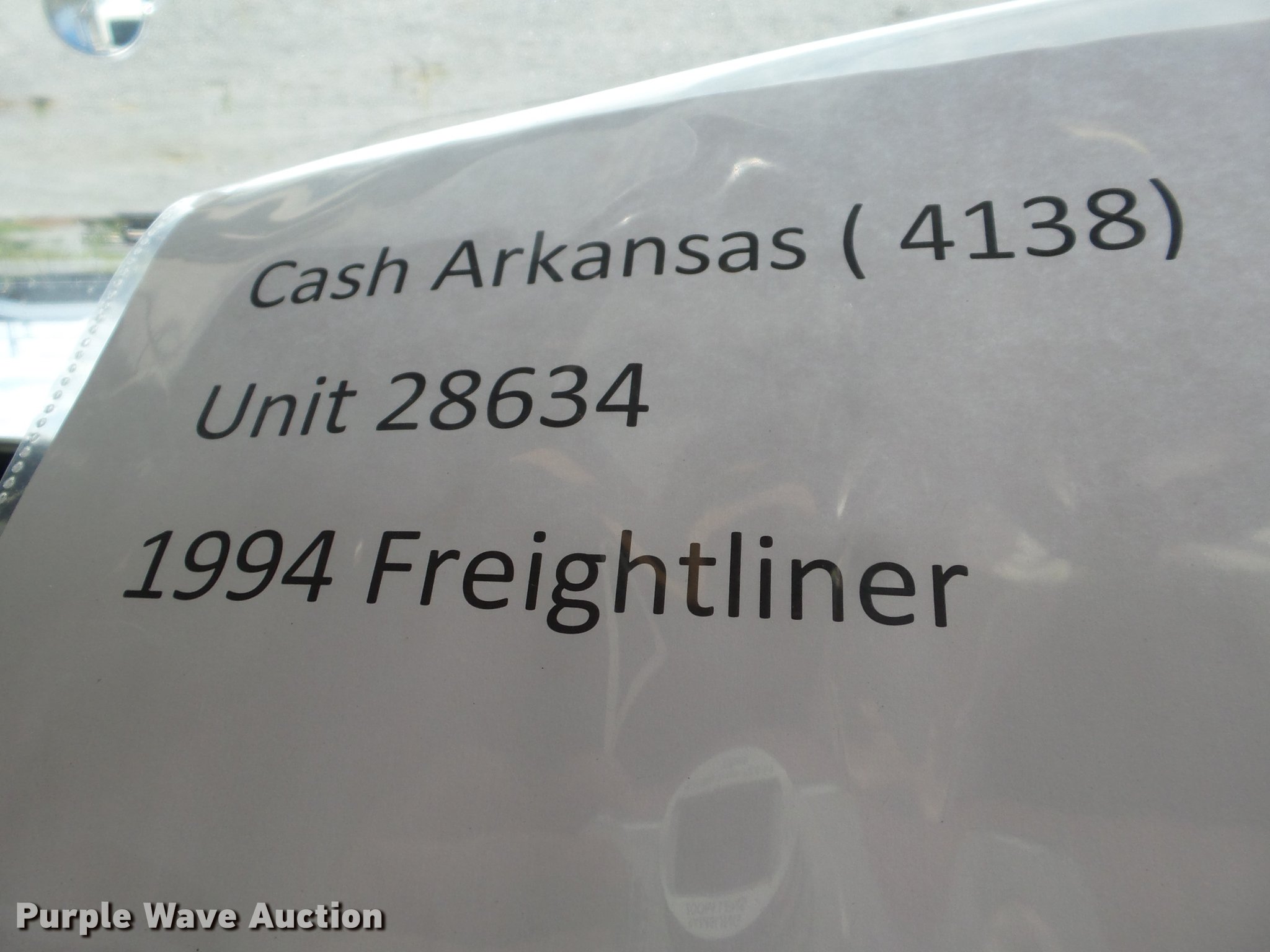 Purple Wave is selling a used Fertilizer or Feed Delivery Truck in Arkansas. This item is a 1994 Freightliner FLD fertilizer tender truck with the following: 321,480 miles on odometer, Detroit Diesel Series 60 11.1L L6 turbo diesel engine, 365 HP, Eaton Fuller nine speed manual transmission, Tandem axle, Inter-axle differential lock, AC and heat, Air suspension seat, Adams fertilizer tender bed, 17'L, (2) compartments, 15'L x 10" diameter side discharge auger, Hydraulic lift, Rear/ground controls, Roll tarp, Spring suspension, Air brakes, 234" wheelbase, 11R22.5 tires, GVWR 48,000 lbs, FAWR 12,000 lbs, IAWR 18,000 lbs, RAWR 18,000 lbs, Unit# 28634