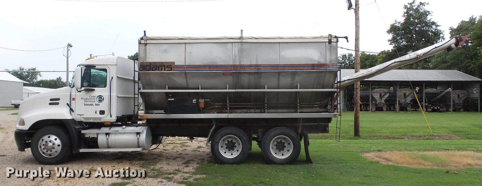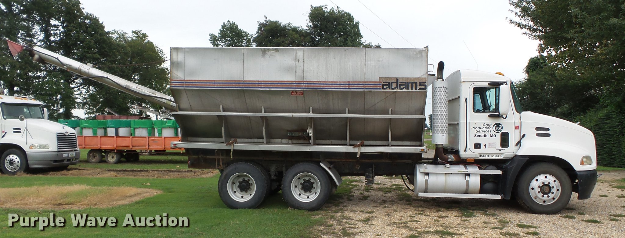 2001 Mack CX613 fertilizer tender truck. 3,289 miles on odometer Actual miles unknown, 25,442 hours on meter, Mack E7-330/350 12.0L L6 turbo diesel engine Serial 0J2275, Eaton Fuller 10 speed manual transmission, Tandem axle, Inter-axle differential lock, AC and heat, Tilt, Cruise, AM/FM, Power windows and locks, Air suspension seat, Block heater, Adams fertilizer tender bed 17'L, (2) compartments, 12.5'L x 9" diameter rear discharge auger Hydraulic lift, Rear/ground controls, Vibrator, Roll tarp, Air suspension, Air brakes, 210" wheelbase, 11R22.5 front tires, 295/75R22.5 rear tires. Iowa title. Title distribution may be delayed up to 30 days from verification of funds and title assignment. 1M1AE05Y21W005736. Nutrien Ag Solutions. 500 N Main St. Senath, MO 63876