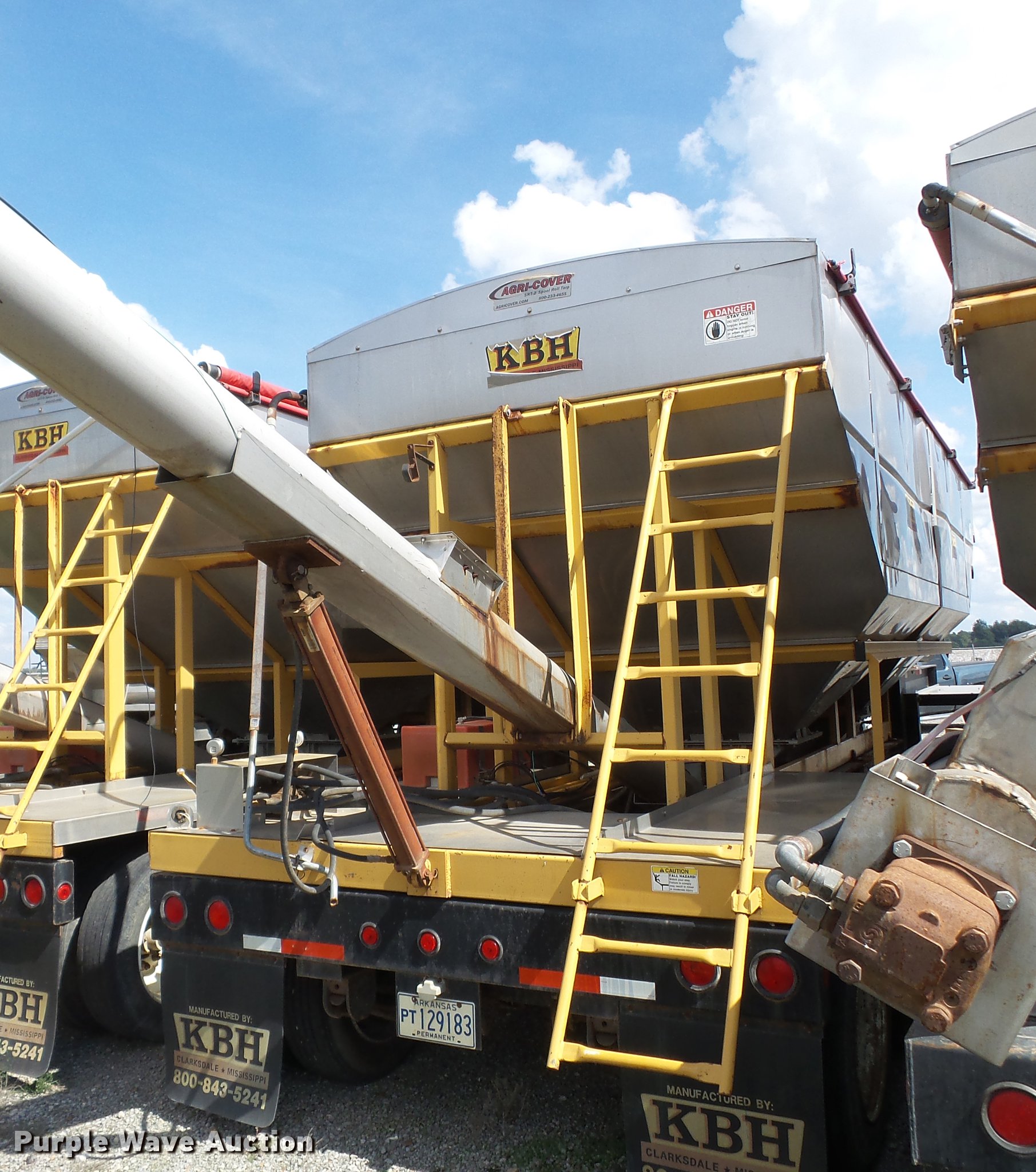 Purple Wave is selling a used Fertilizer or Feed Delivery Trailer in Arkansas. This item is a 2012 KBH fertilizer tender trailer with the following: Deutz three cylinder diesel engine, 32'L tender bed, Stainless steel hoppers, 24 ton capacity, 10" diameter discharge auger, Roll tarp, Hydraulic shut-off gate, Dual bed vibrators, Taillights, Fifth wheel plate, Air brakes, Tandem axle, 255/70R22.5 tires, Dead battery, Tarp ripped, Unit# 76790