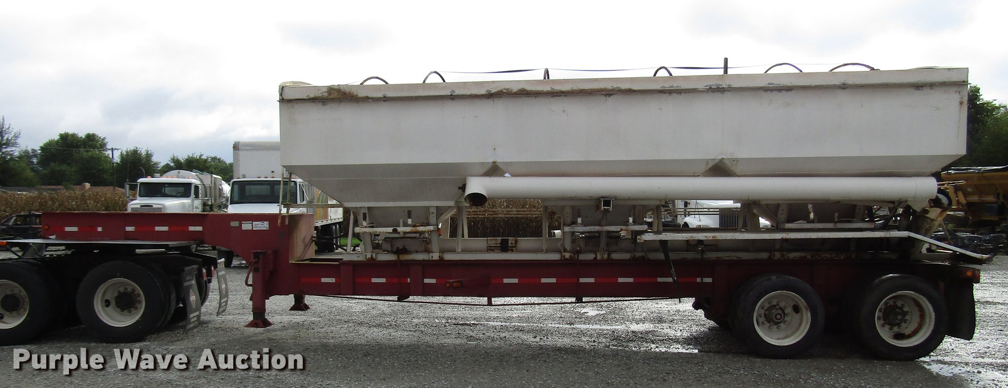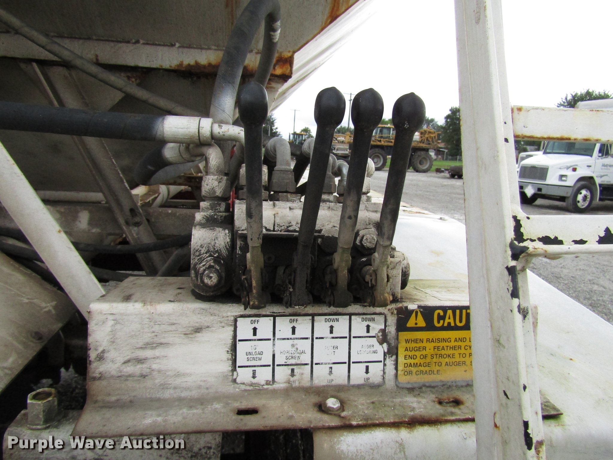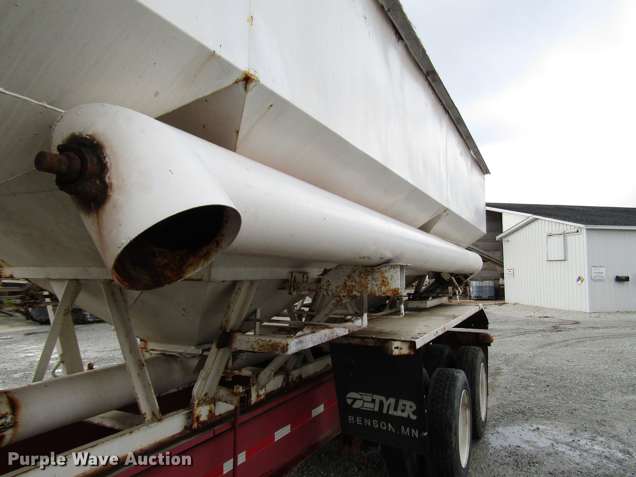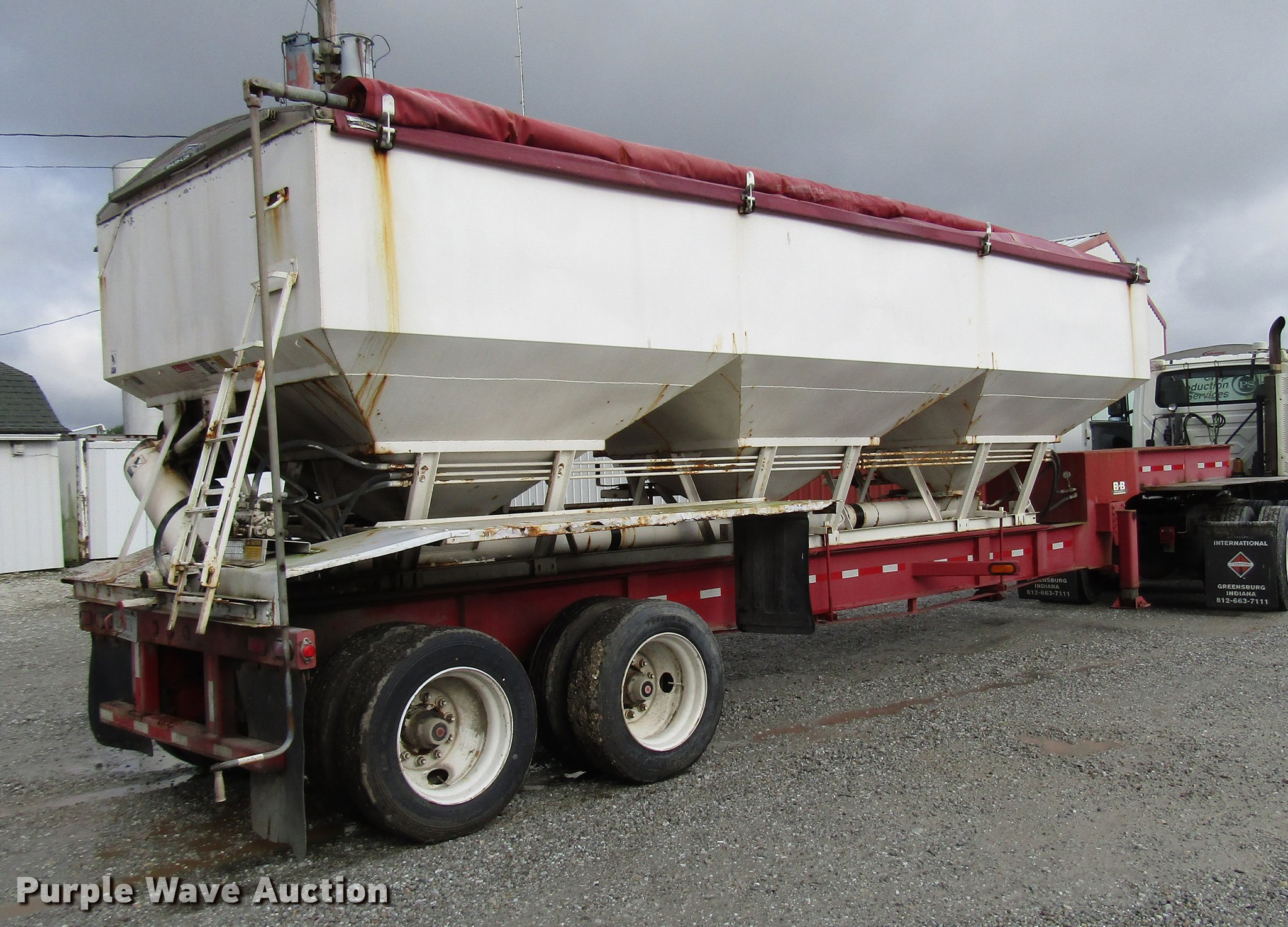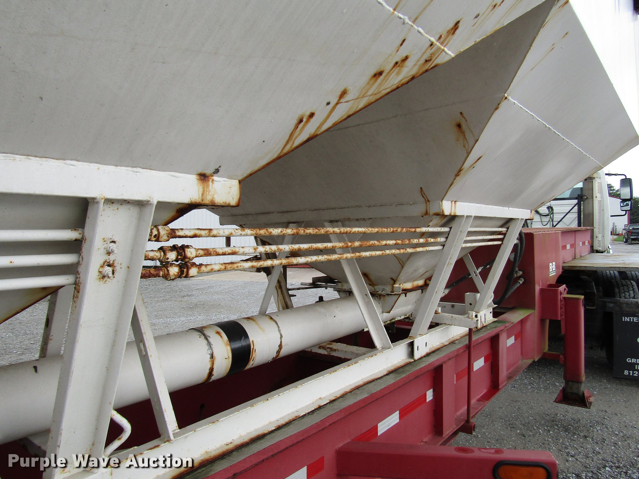 Purple Wave is selling a used Fertilizer or Feed Delivery Trailer in Indiana. This item is a 2005 B-B tender trailer with the following: 36'L, 25'L tender bed, (3) compartments, 24 ton capacity, 20'L x 10" diameter discharge auger, Hand controls, Roll tarp, Steel construction, Fifth wheel plate, Dual leg two speed landing gear, Spring suspension, Air brakes, Tandem axle, Steel wheels, 255/70R22.5 tires