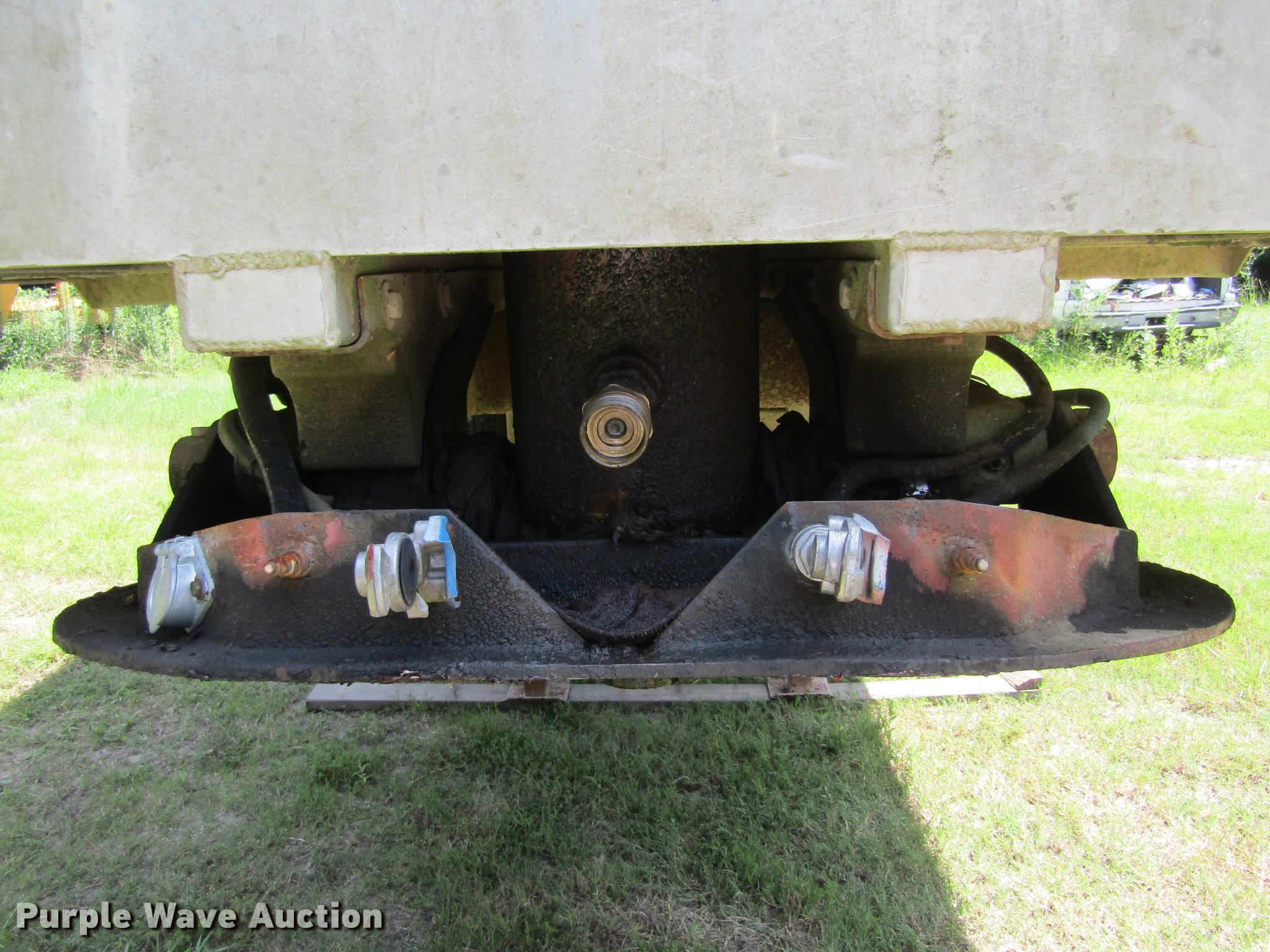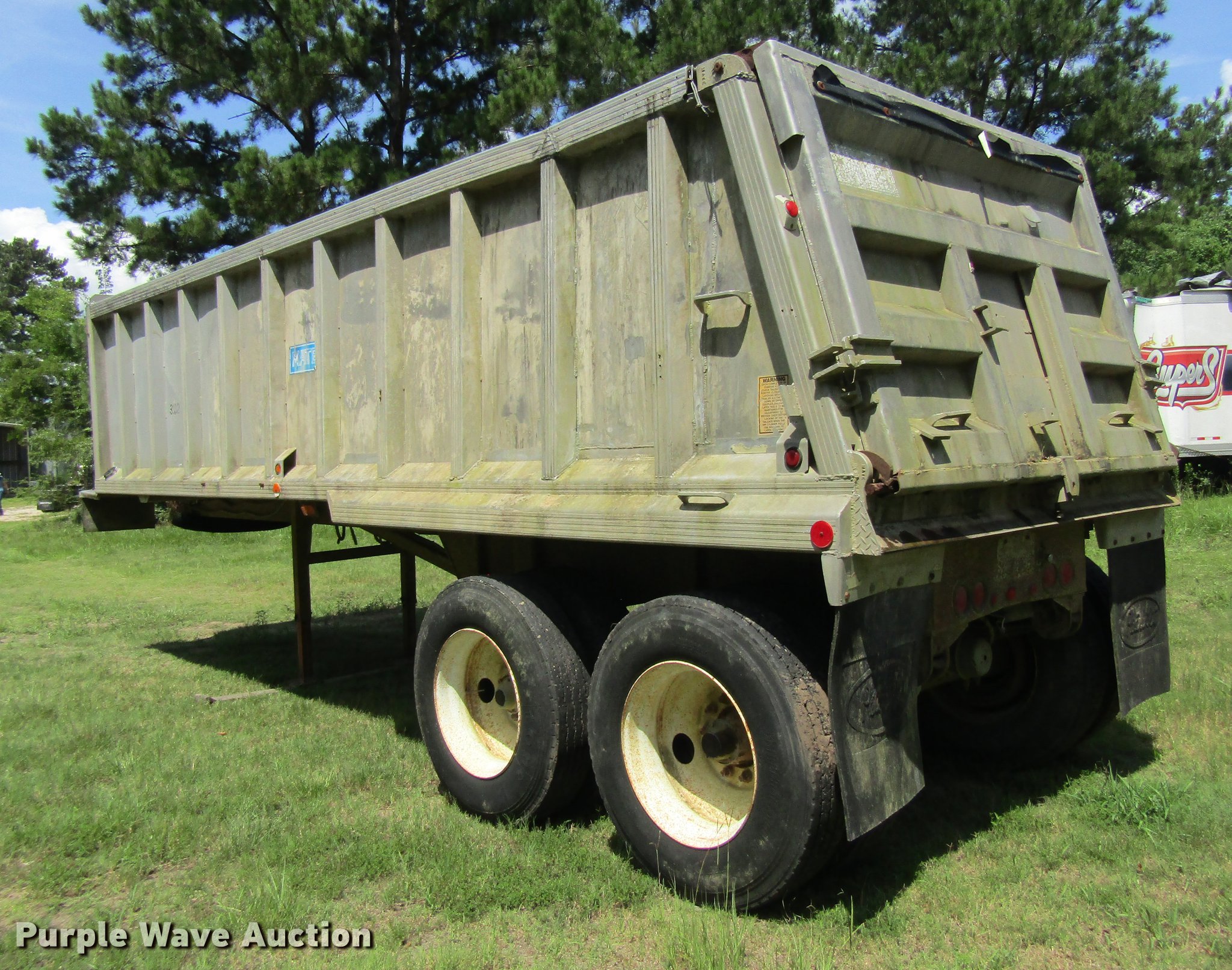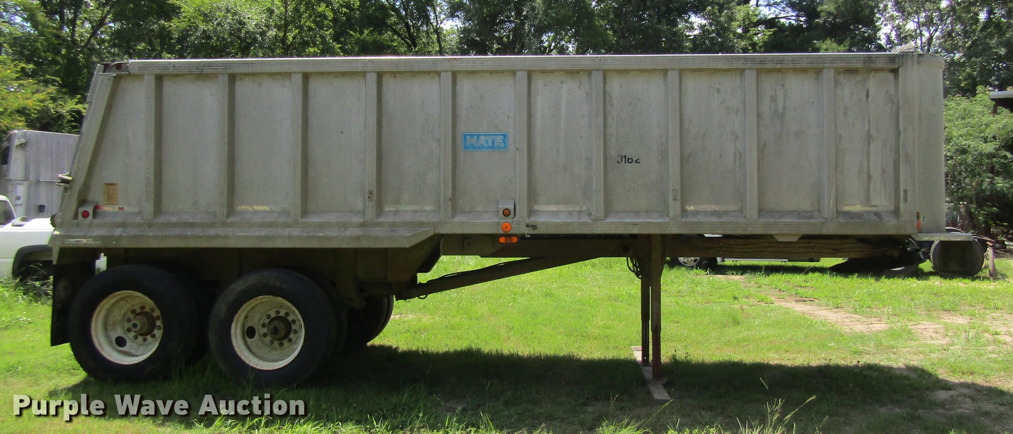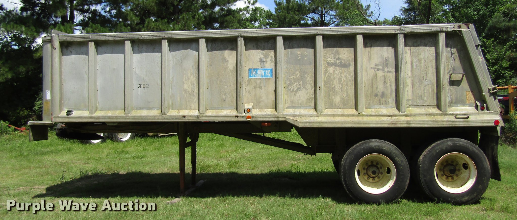 Purple Wave is selling a used End Dump Rock Trailer in Texas. This item is a 1998 Mate 26 end dump trailer with the following: 27.5'L overall, 26'L body, 60" side height, Single hydraulic cylinder, End gate, Aluminum construction, Fifth wheel plate, Dual leg landing gear, Spring suspension, Air brakes, Tandem axle, Steel wheels, 11R24.5 tires, GVWR 34,000 lbs