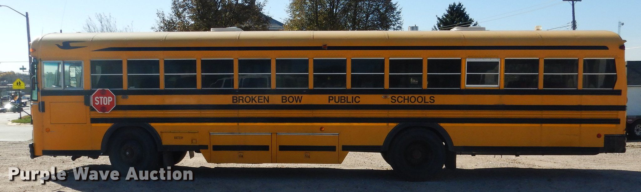 1996 Blue Bird TC2000 school bus. 150,619 miles on odometer, 35 hours on meter Miles and hours may vary, still in use, Cummins 5.9L L6 turbo diesel engine Serial 45241113, Automatic transmission, Single axle, Heat, Tilt, AM/FM, Heated mirrors, Air suspension seat, Motorola Max Track 100 two-way radio, Overhead storage, 71 passenger capacity, (24) adult seats, Ceiling, front, rear, and side emergency exits, Lighted stop sign, Underside luggage storage, Block heater, 4:44 gear ratio, Spring suspension, Air brakes, Michelin 11R22.5 tires, GVWR 27,800 lbs, FAWR 12,000 lbs, RAWR 19,000 lbs, Contents not included. Nebraska title. 1BAAKCSA9TF067732. Broken Bow Public Schools. 323 N 7th Ave. Broken Bow, NE 68822