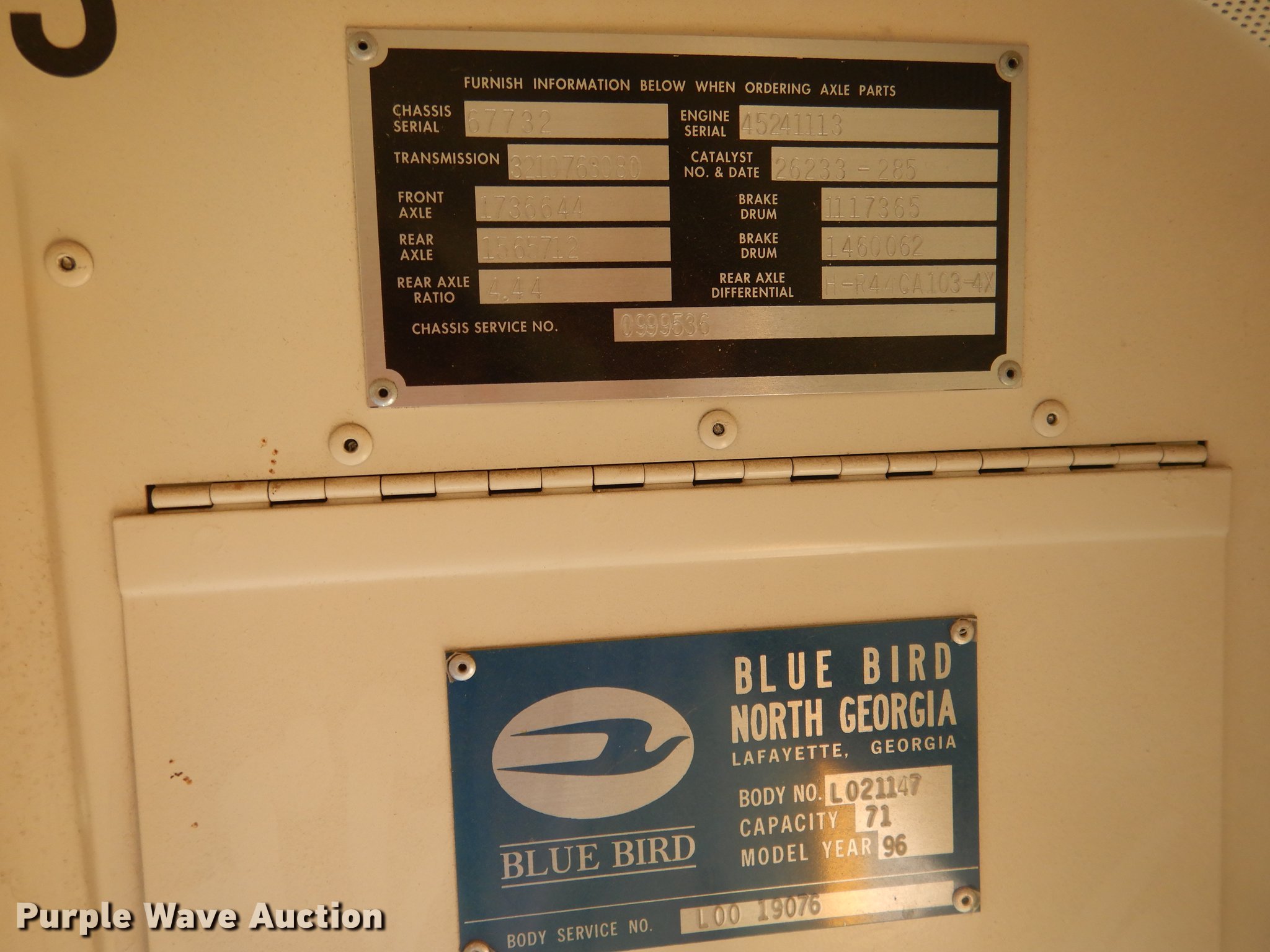Purple Wave is selling a used Bus in Nebraska. This item is a 1996 Blue Bird TC2000 school bus with the following: 150,619 miles on odometer, 35 hours on meter, Miles and hours may vary, still in use, Cummins 5.9L L6 turbo diesel engine, Serial 45241113, Automatic transmission, Single axle, Heat, Tilt, AM/FM, Heated mirrors, Air suspension seat, Motorola Max Track 100 two-way radio, Overhead storage, 71 passenger capacity, (24) adult seats, Ceiling, front, rear, and side emergency exits, Lighted stop sign, Underside luggage storage, Block heater, 4:44 gear ratio, Spring suspension, Air brakes, Michelin 11R22.5 tires, GVWR 27,800 lbs, FAWR 12,000 lbs, RAWR 19,000 lbs, Contents not included