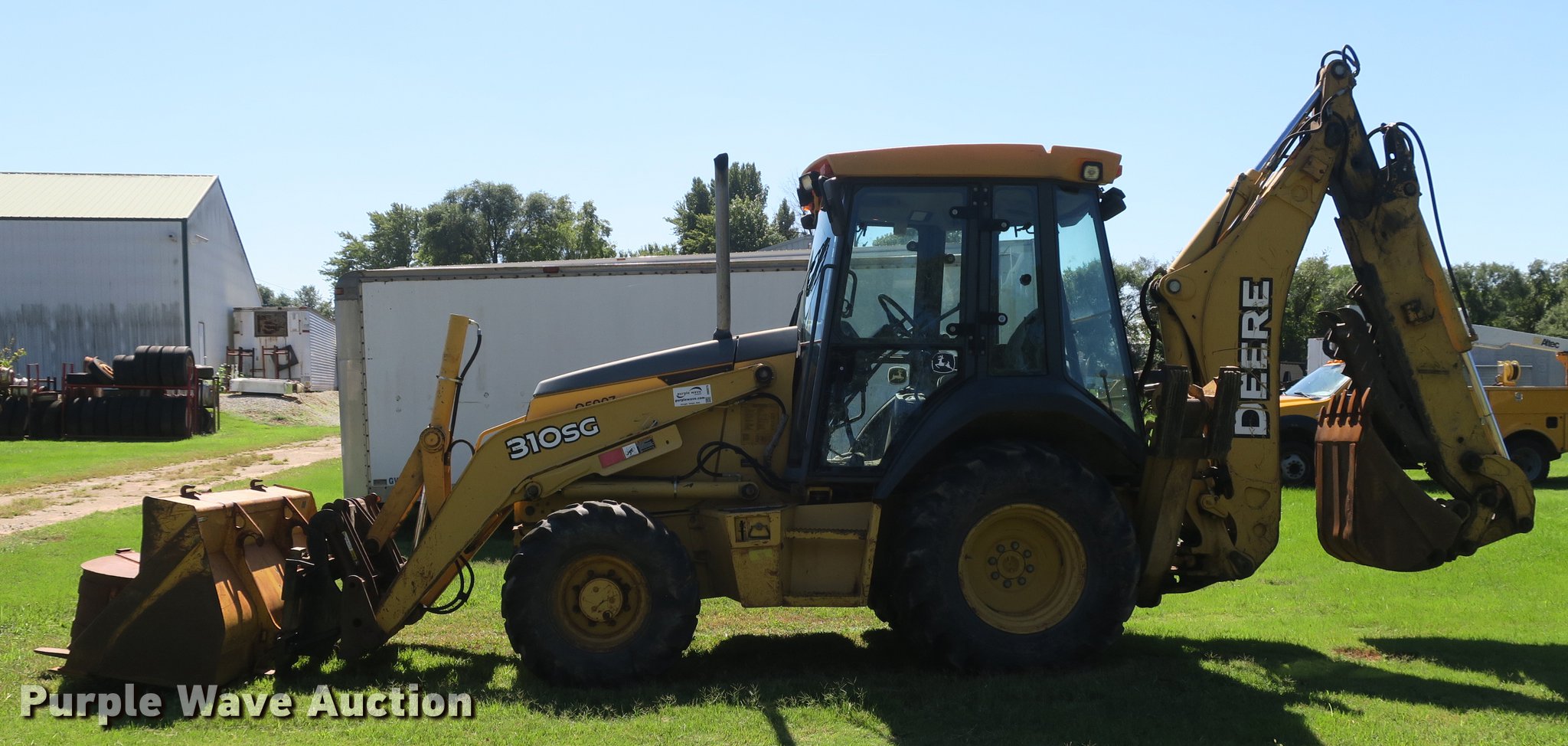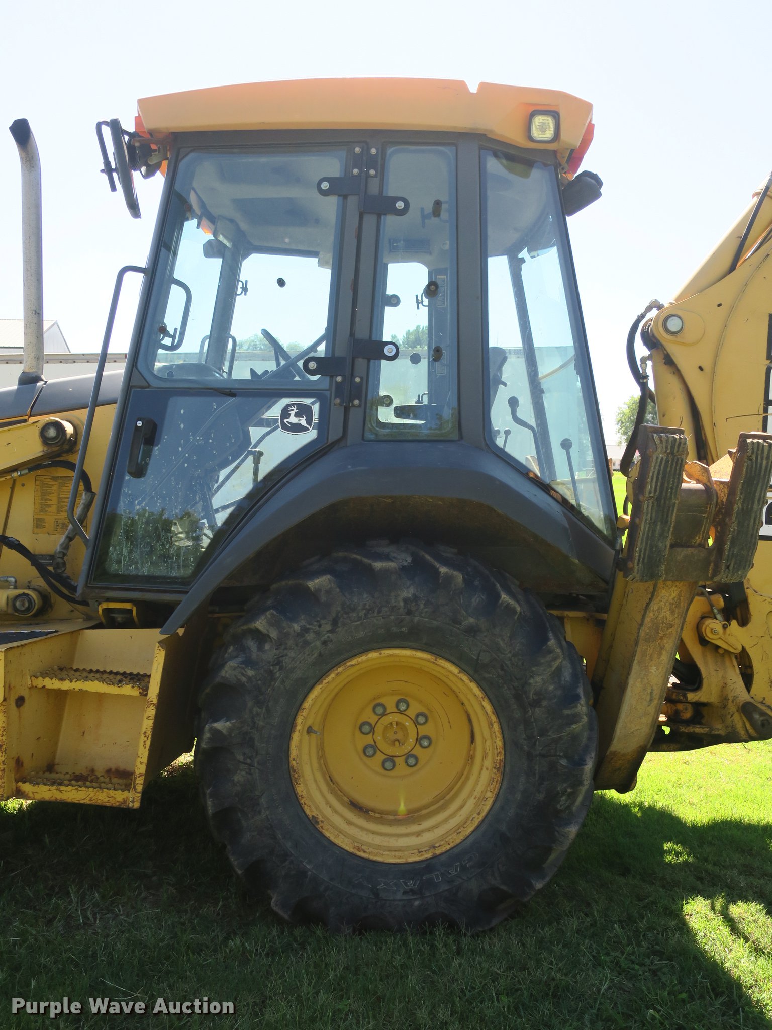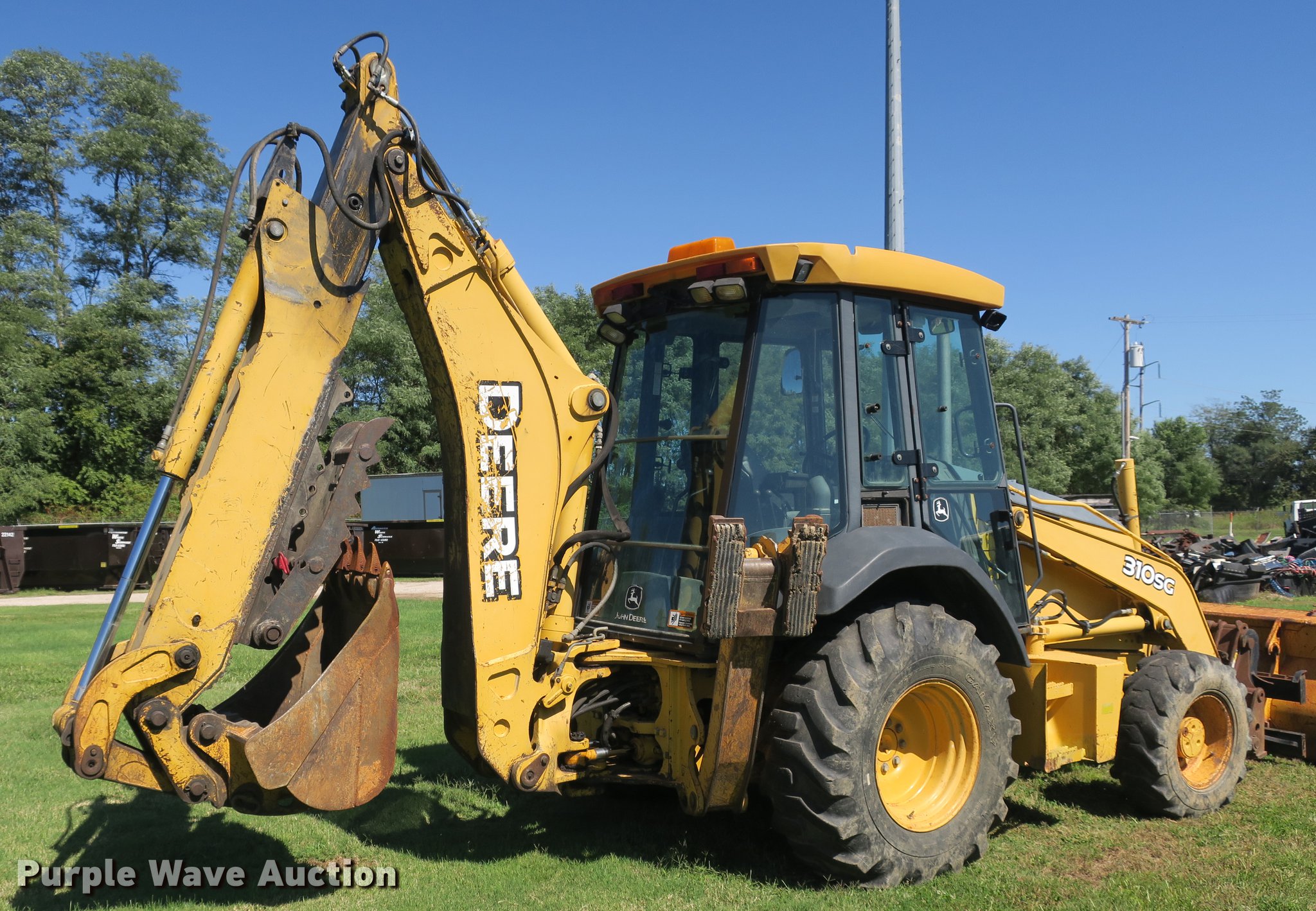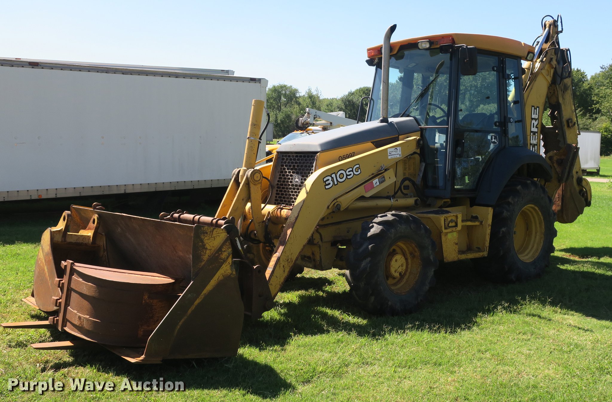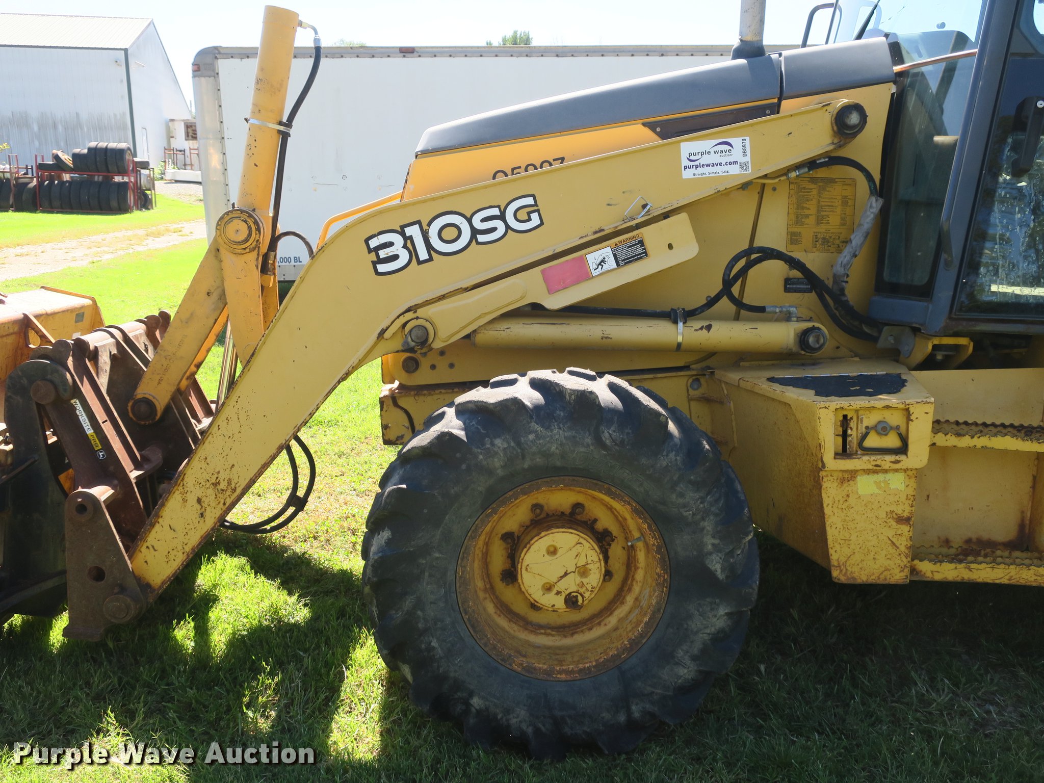 Purple Wave is selling a used Tractor Loader Backhoe in Missouri. This item is a 2005 John Deere 310SG backhoe with the following: 4,817 hours on meter, John Deere 4045TT089 4.5L four cylinder turbo diesel engine, 69 kW, Shuttle shift transmission, 4F-1R gears, Four wheel drive, Differential lock, EROPS, AM/FM, Wobble stick backhoe controls, Suspension seat, Front and rear work lights, Wipers, Manual quick coupler, Worksite Pro 90"W loader bucket, Bolt-on cutting edge, One cu. yd. capacity, Manual thumb, Extendable stick, (3) backhoe buckets, (2) 18"W, One tooth on each bucket missing, 24"W, One tooth missing,, 48"L forks, 12.5/80-18 front tires, 19.5x24 rear tires, One work light damaged, Serial T0310SG946893