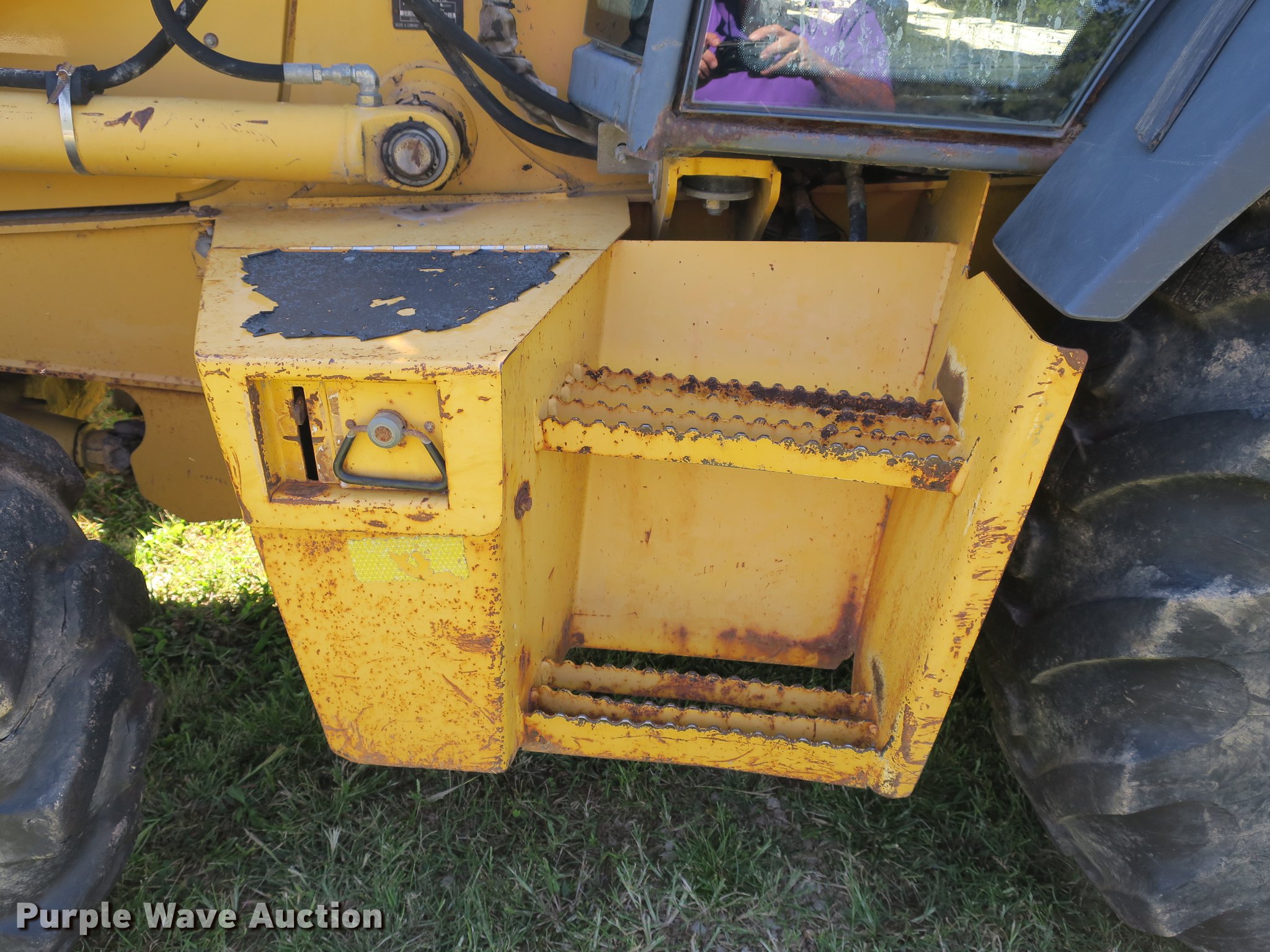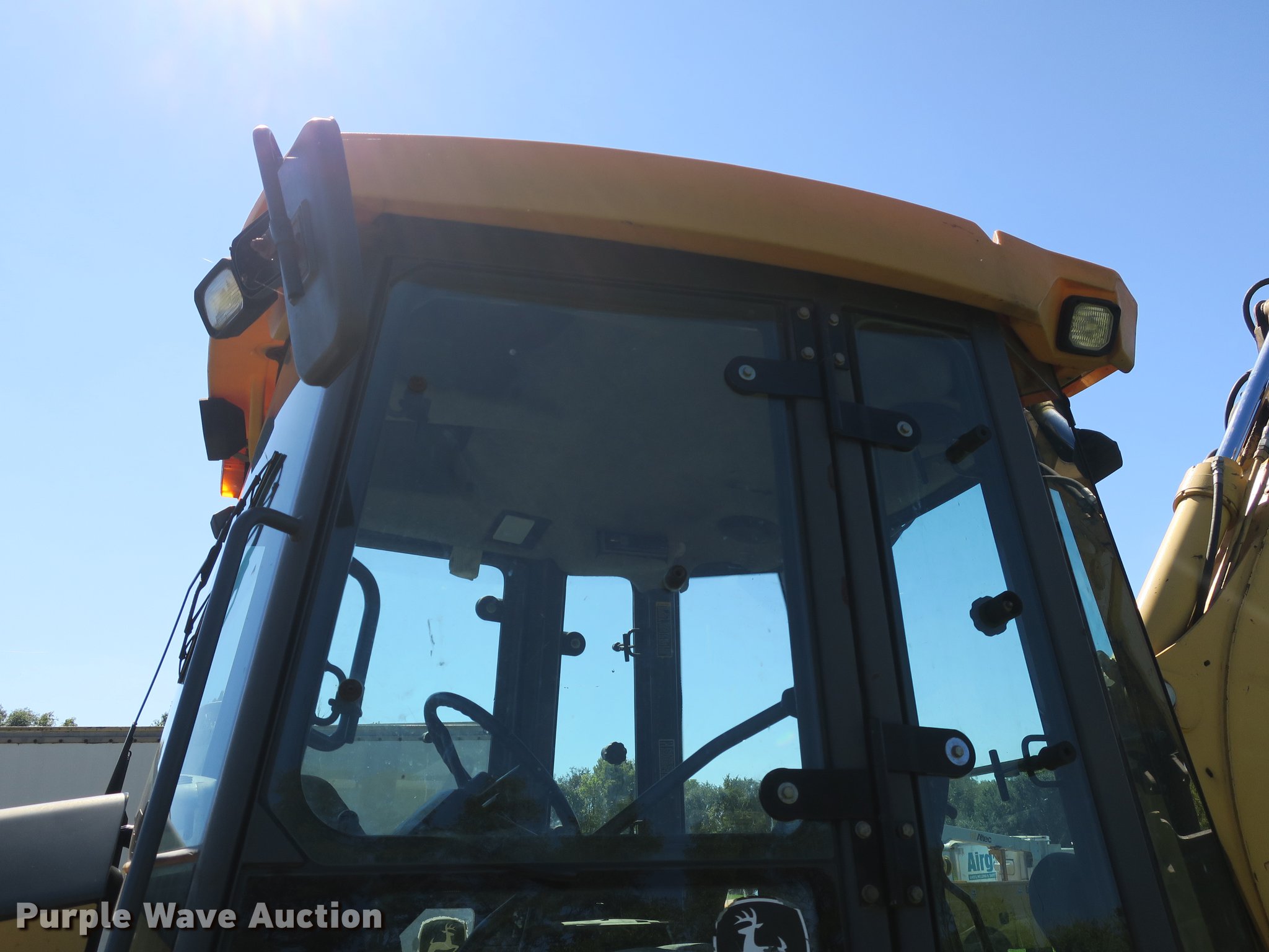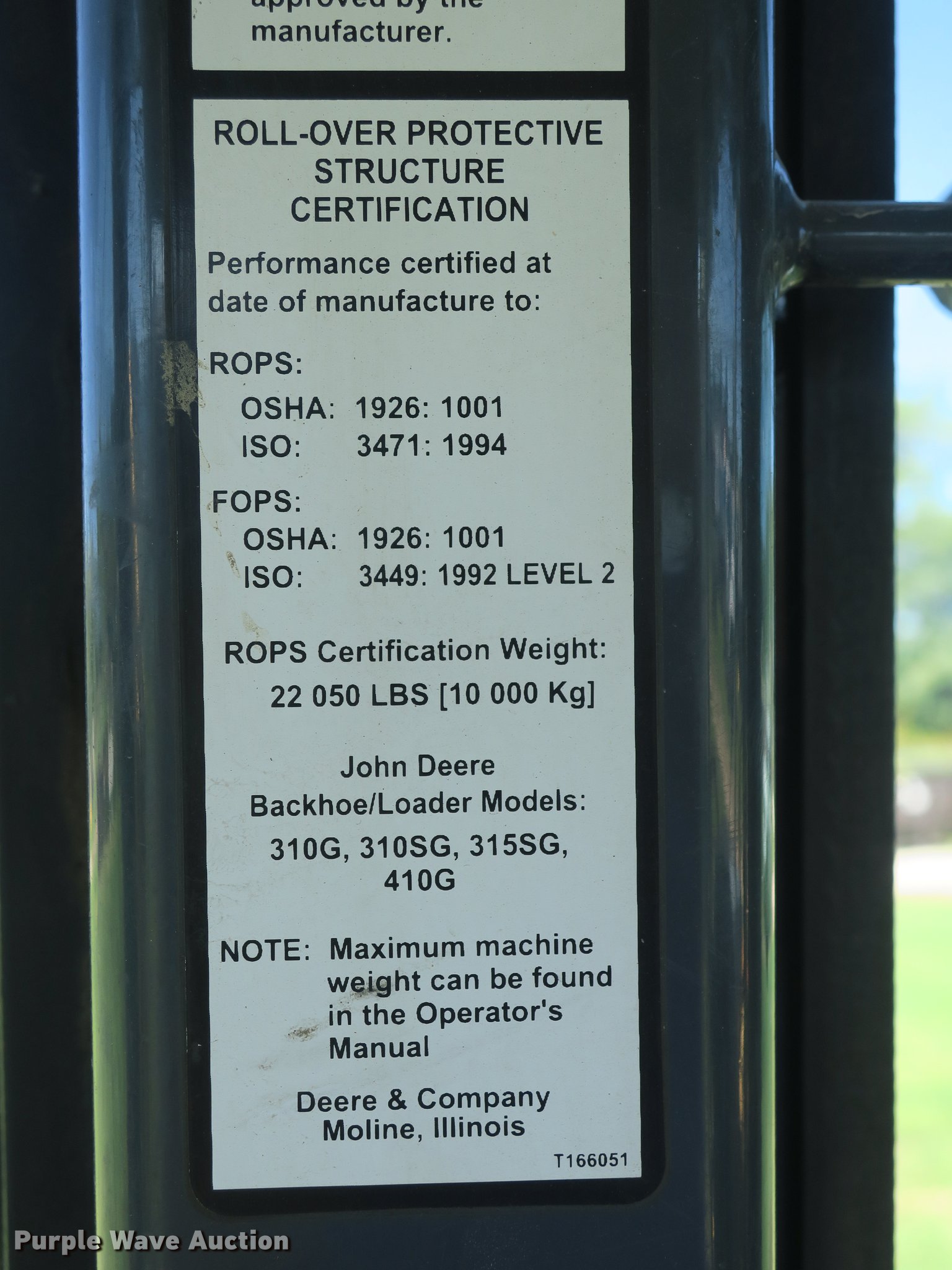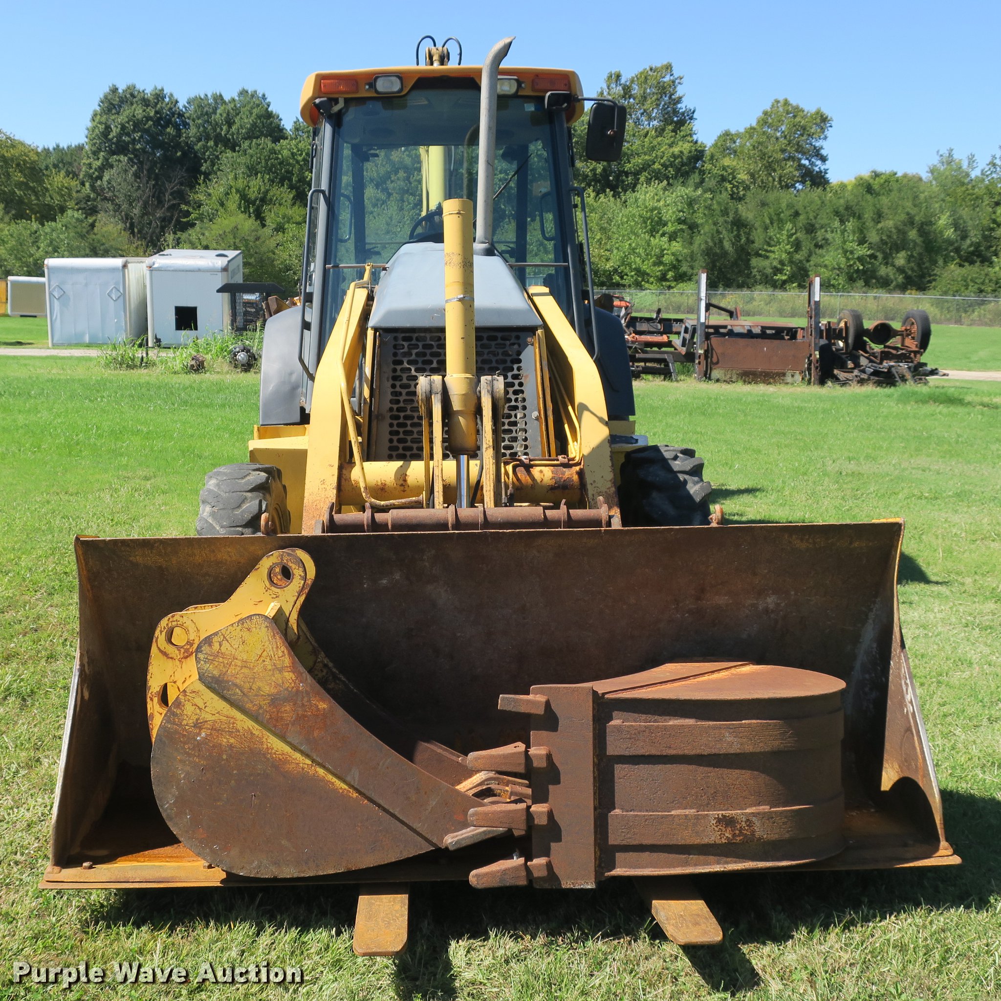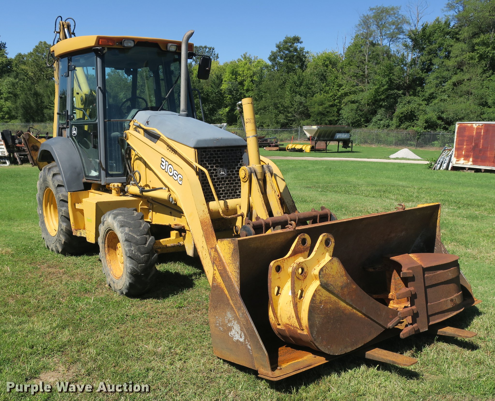 Purple Wave is selling a used Tractor Loader Backhoe in Missouri. This item is a 2005 John Deere 310SG backhoe with the following: 4,817 hours on meter, John Deere 4045TT089 4.5L four cylinder turbo diesel engine, 69 kW, Shuttle shift transmission, 4F-1R gears, Four wheel drive, Differential lock, EROPS, AM/FM, Wobble stick backhoe controls, Suspension seat, Front and rear work lights, Wipers, Manual quick coupler, Worksite Pro 90"W loader bucket, Bolt-on cutting edge, One cu. yd. capacity, Manual thumb, Extendable stick, (3) backhoe buckets, (2) 18"W, One tooth on each bucket missing, 24"W, One tooth missing,, 48"L forks, 12.5/80-18 front tires, 19.5x24 rear tires, One work light damaged, Serial T0310SG946893