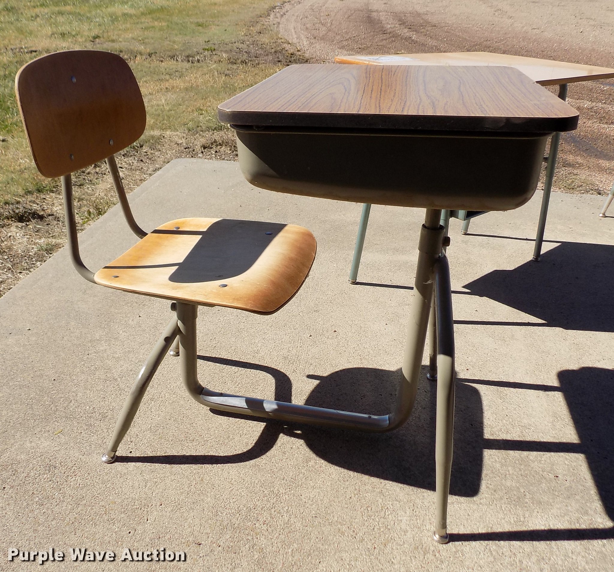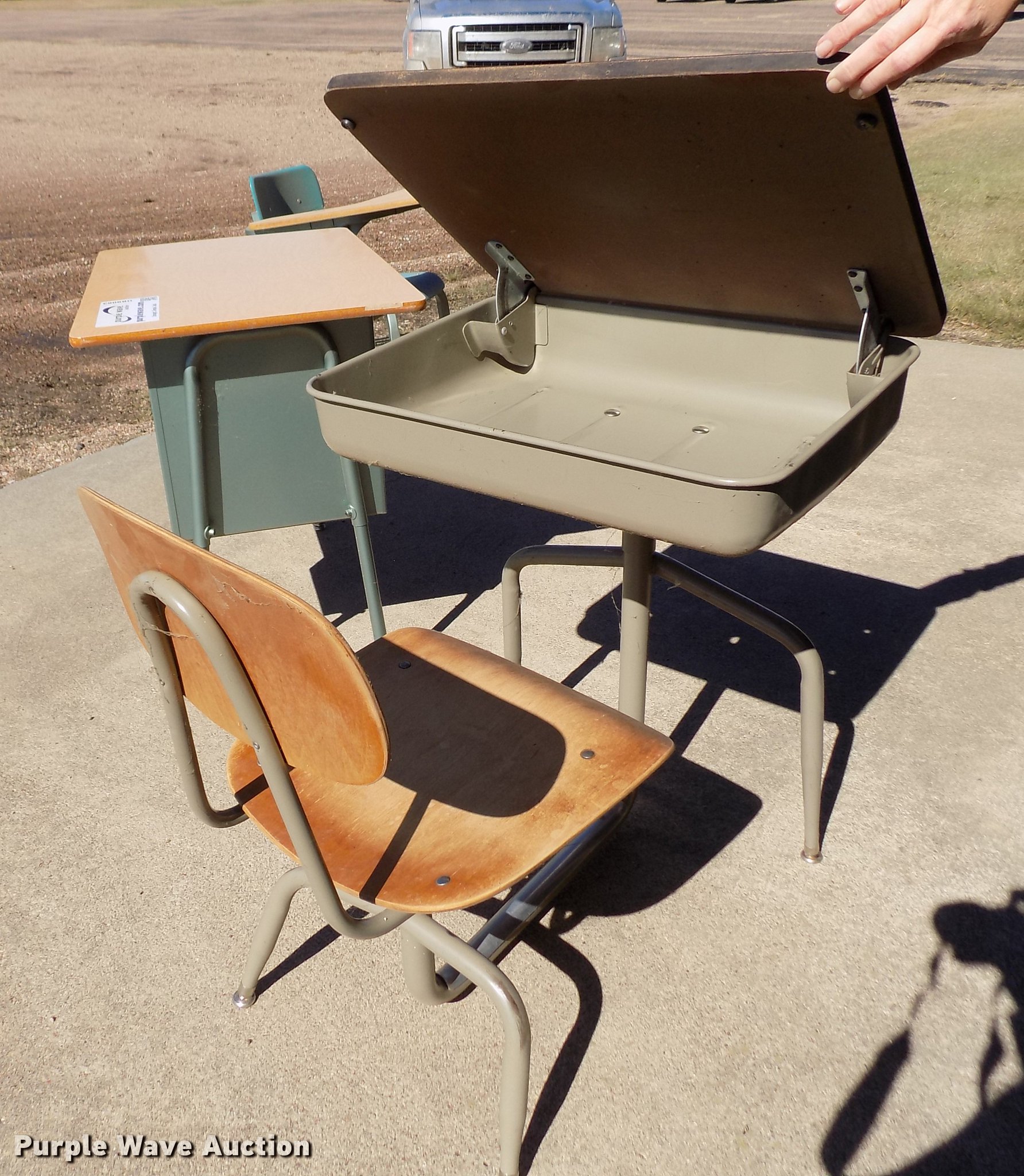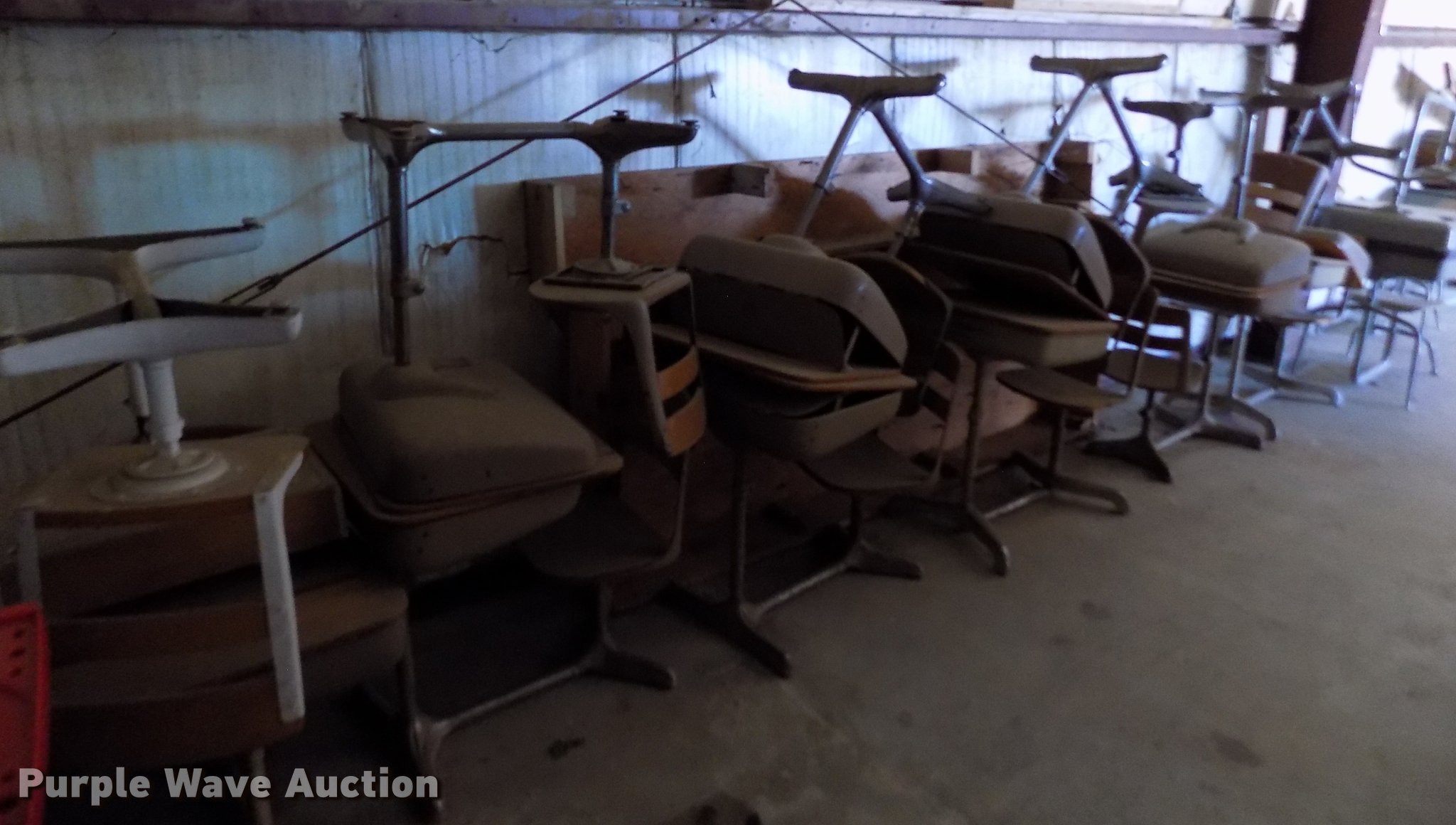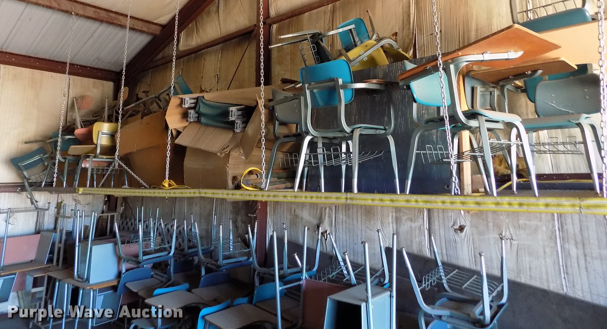 Purple Wave is selling a used Furniture in Kansas. This item is a (62) desks with the following: (18) clamshell desks, 18.5" x 24" desk tops, Seats, (13) desks, 34" x 22" desk tops, Cubbies, (15) desks, 19.5" x 14" desk tops, Seats, (16) parts desks, 19.5" x 14" desk tops, Seats, Parts or desk tops may be missing