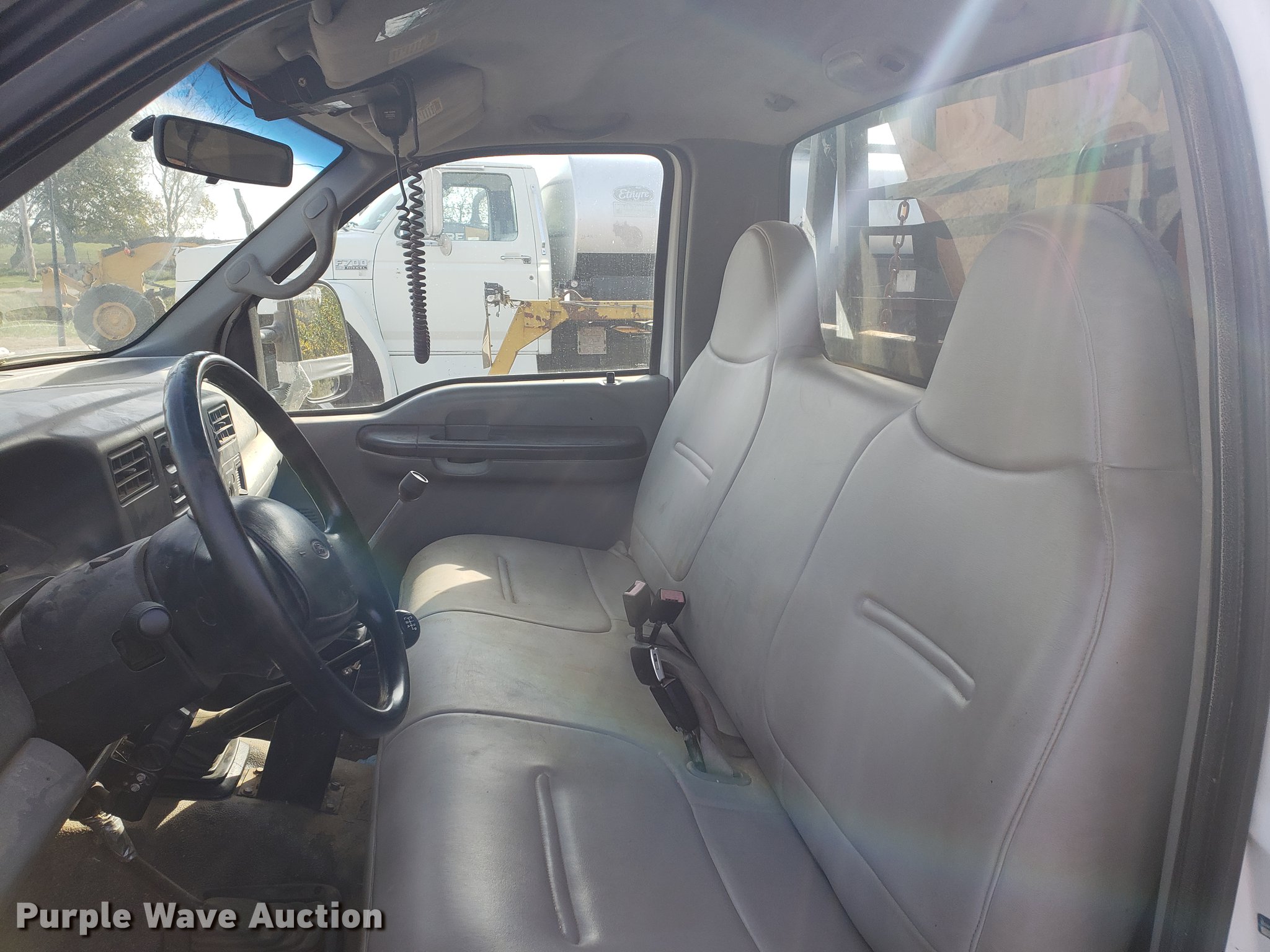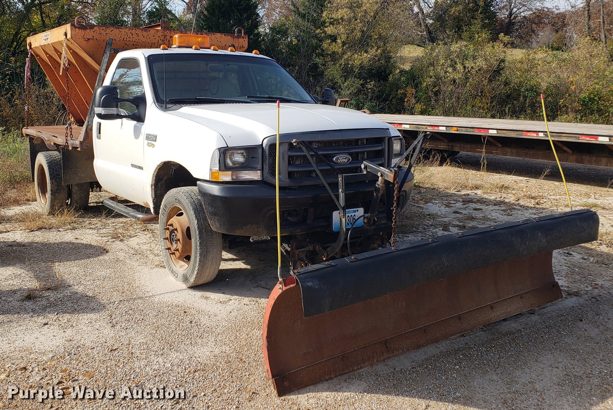 Purple Wave is selling a used Flat Bed Truck in Missouri. This item is a 2002 Ford F450 Super Duty flatbed truck with the following: Unknown miles on odometer, 7.3L V8 OHV 16V turbo diesel engine, Four wheel drive, AC and heat, AM/FM, Vinyl interior, 9'L x 8'W flatbed, Swenson spreader, 8'L x 80"W, 102"W snow plow, 225/70R22.5 tires, Engine issues, needs replaced
