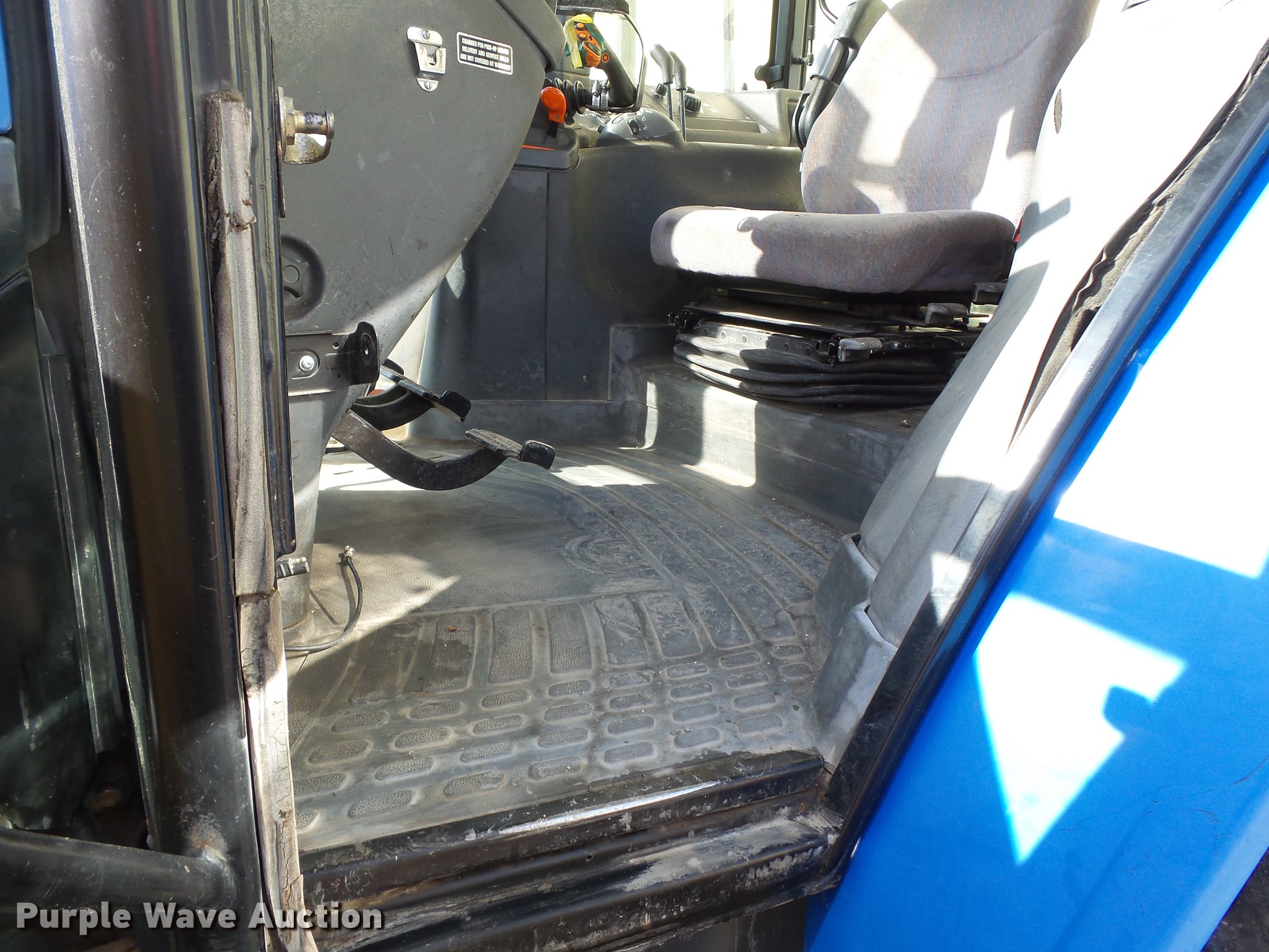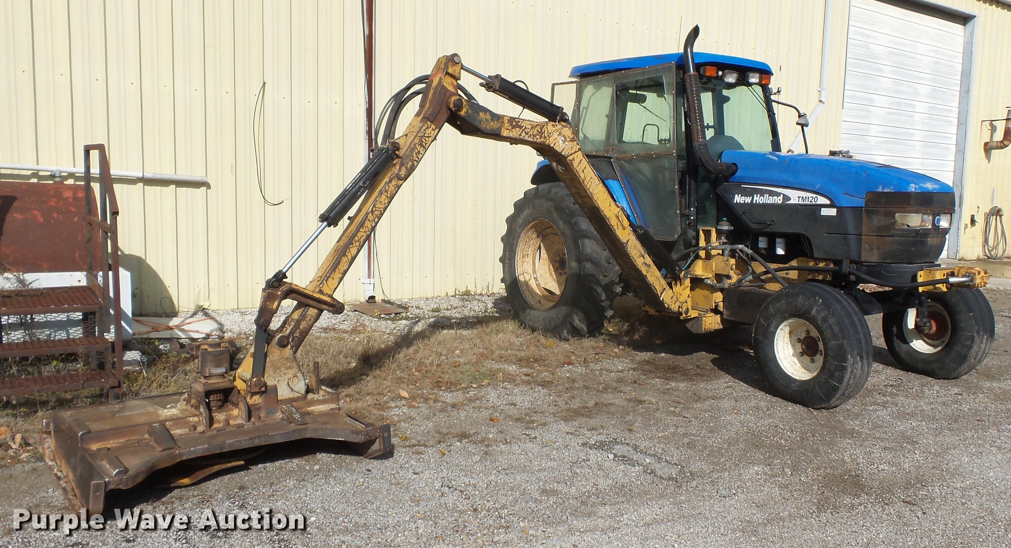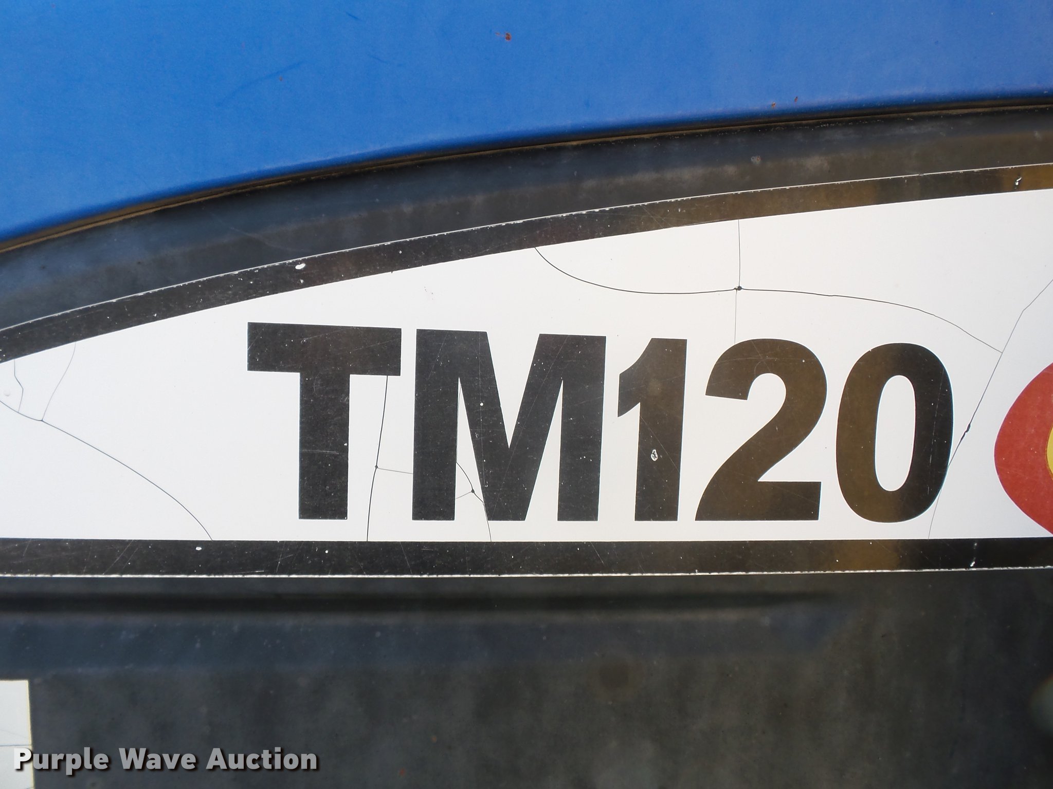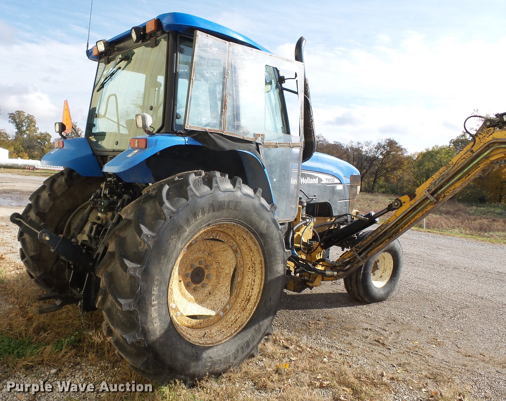 Purple Wave is selling a used Tractor in Missouri. This item is a 2004 New Holland TM120 tractor with the following: 12,185 hours on meter, New Holland 7.5L six cylinder turbo diesel engine, 120 HP, Powershift transmission, 17F-6R gears, Left-hand reverser, AC and heat, AM/FM, Three point, Seven pin outlet, 540 PTO, (2) rear hydraulic remote sets, Diamond rotary mower, 48"W, Wheel weights, 11.00-16 front tires, 460/85R34 rear tires, Cracked windshield, Serial ACM231194