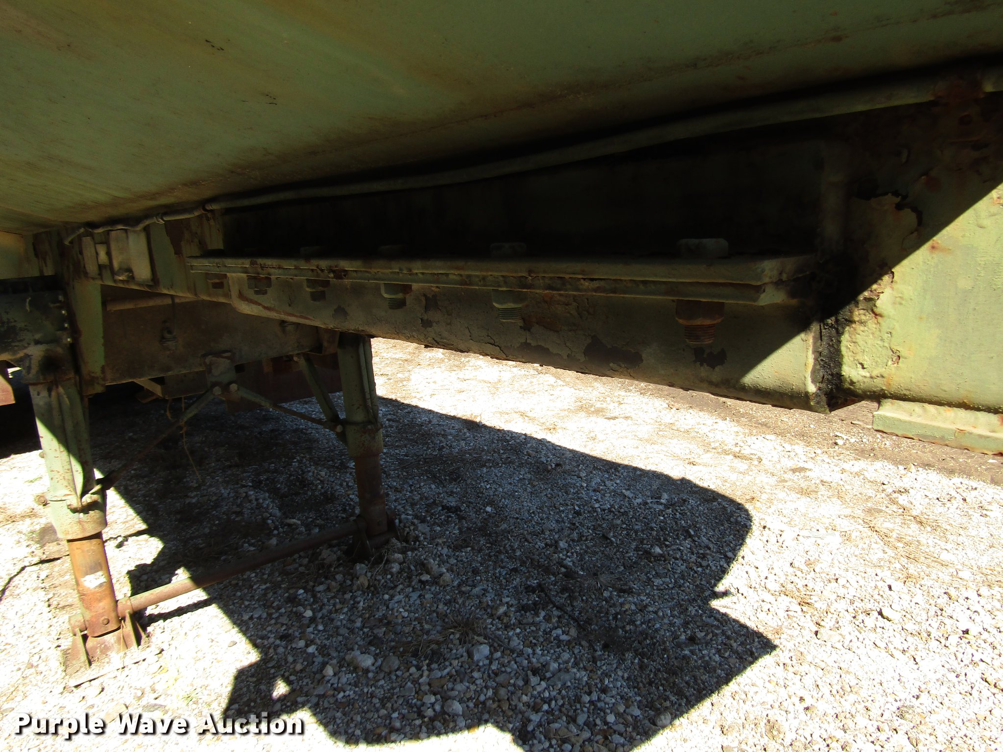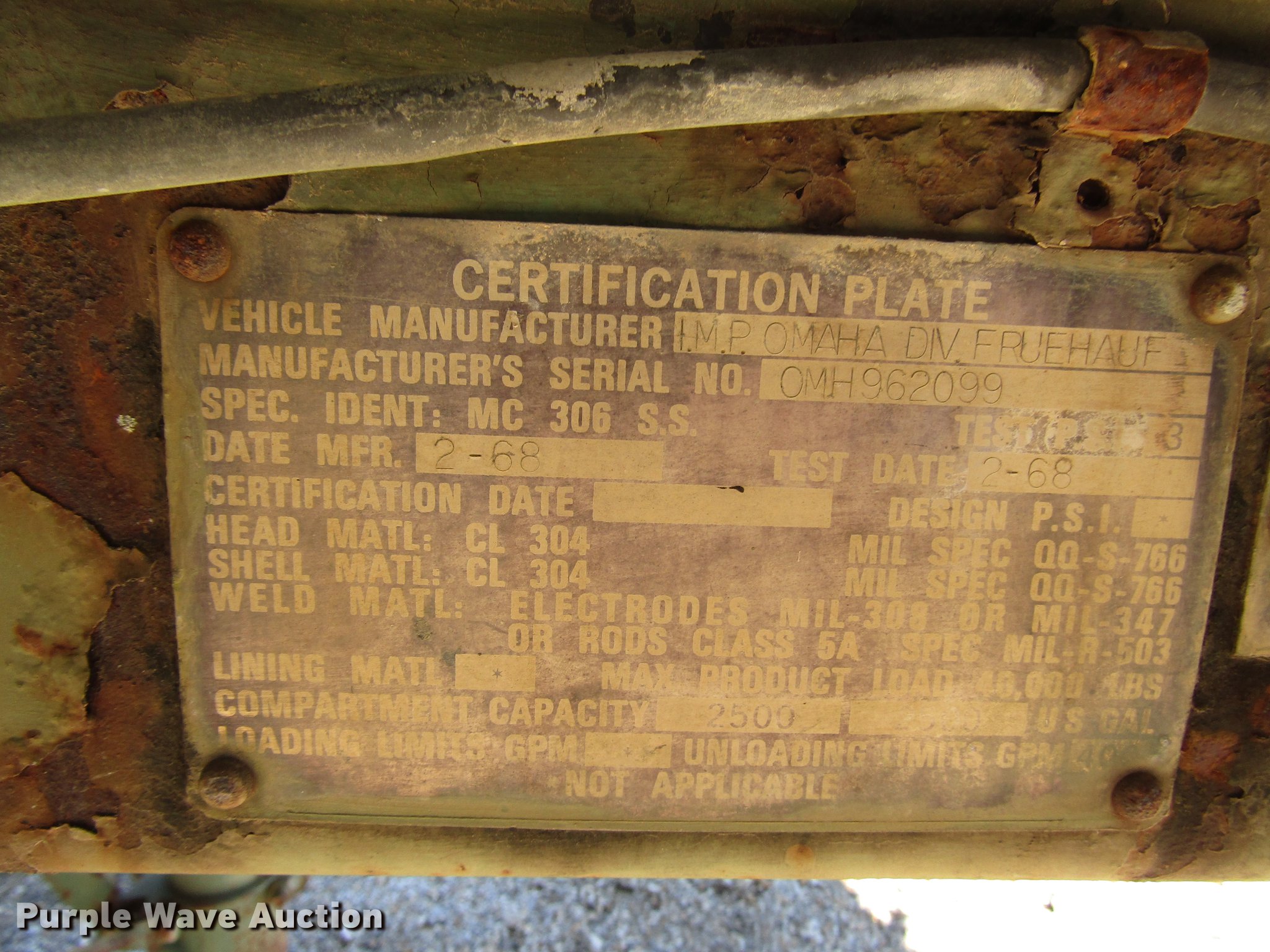 Purple Wave is selling a used Tank Trailer in Kansas. This item is a 1968 IMP Omaha tank trailer with the following: 30'L x 94"W, 5,000 gallon stainless steel tank, (2) compartments, (3) 2.5" outlet valves, (2) 10"W manways/manholes, Pump, 2.5" outlet, Full length walkway, Under-mounted toolbox, Fifth wheel plate, Dual leg landing gear, Spring suspension, Air brakes, Tandem axle, Steel wheels, 11.00-20 tires