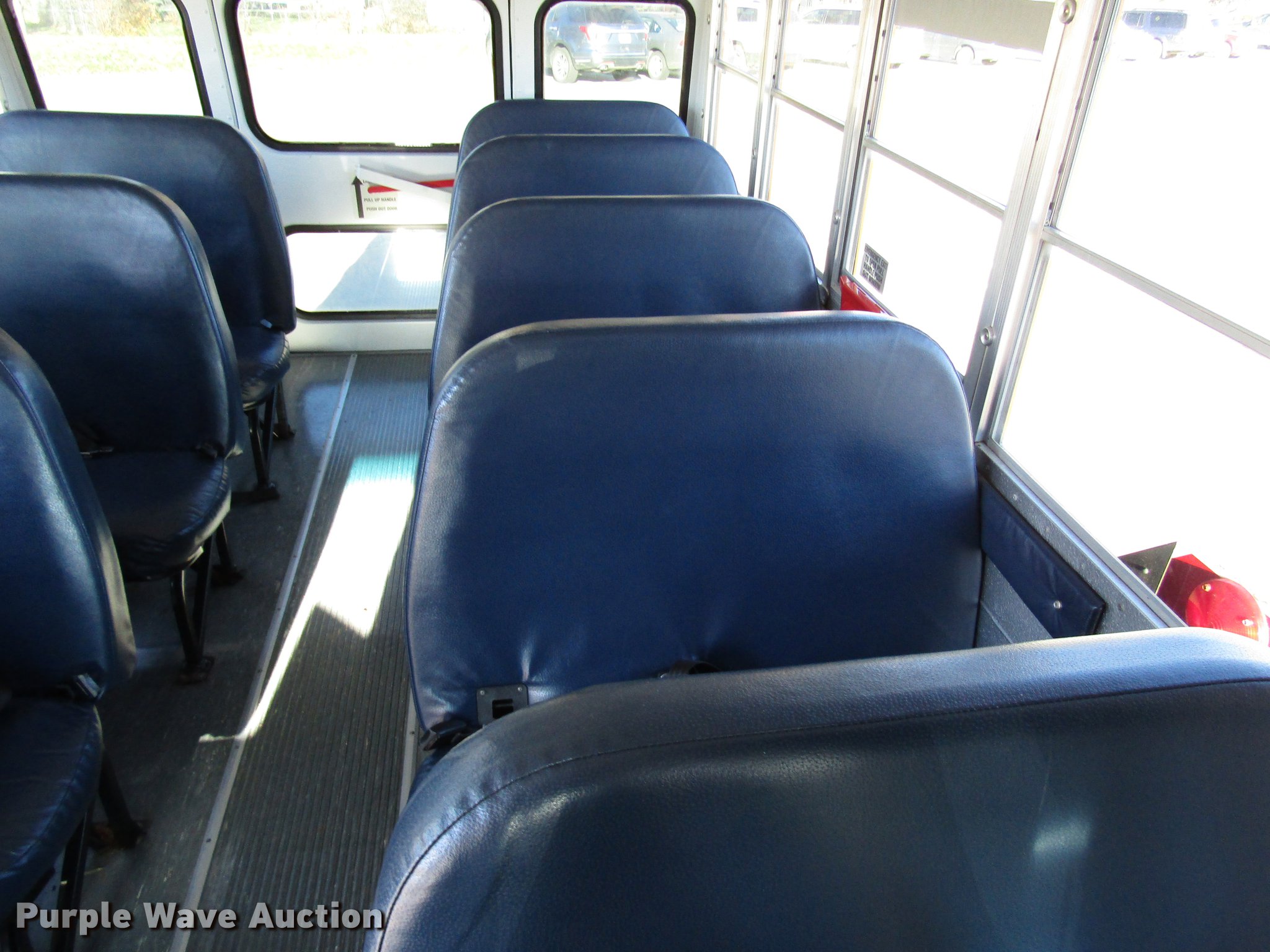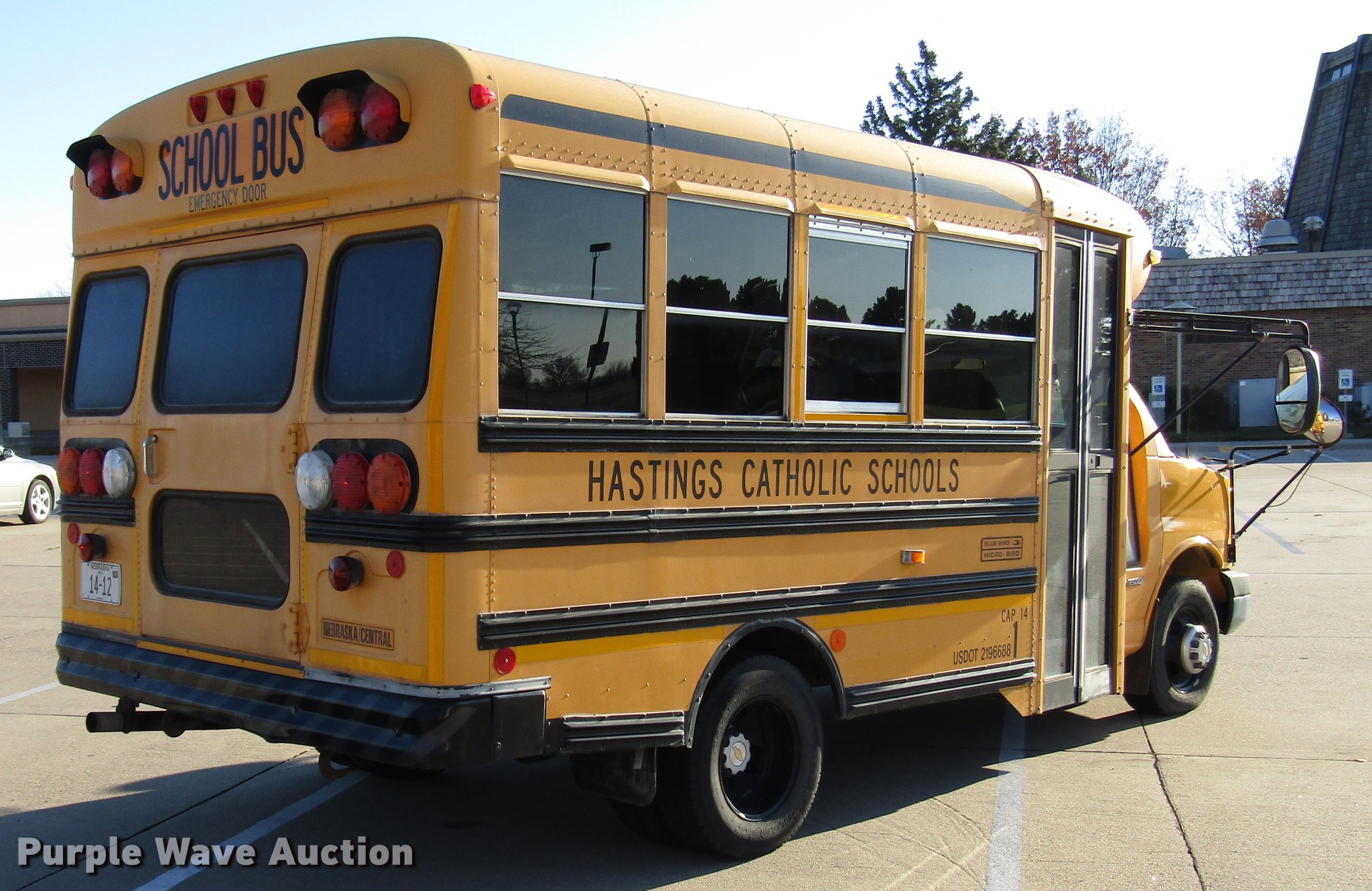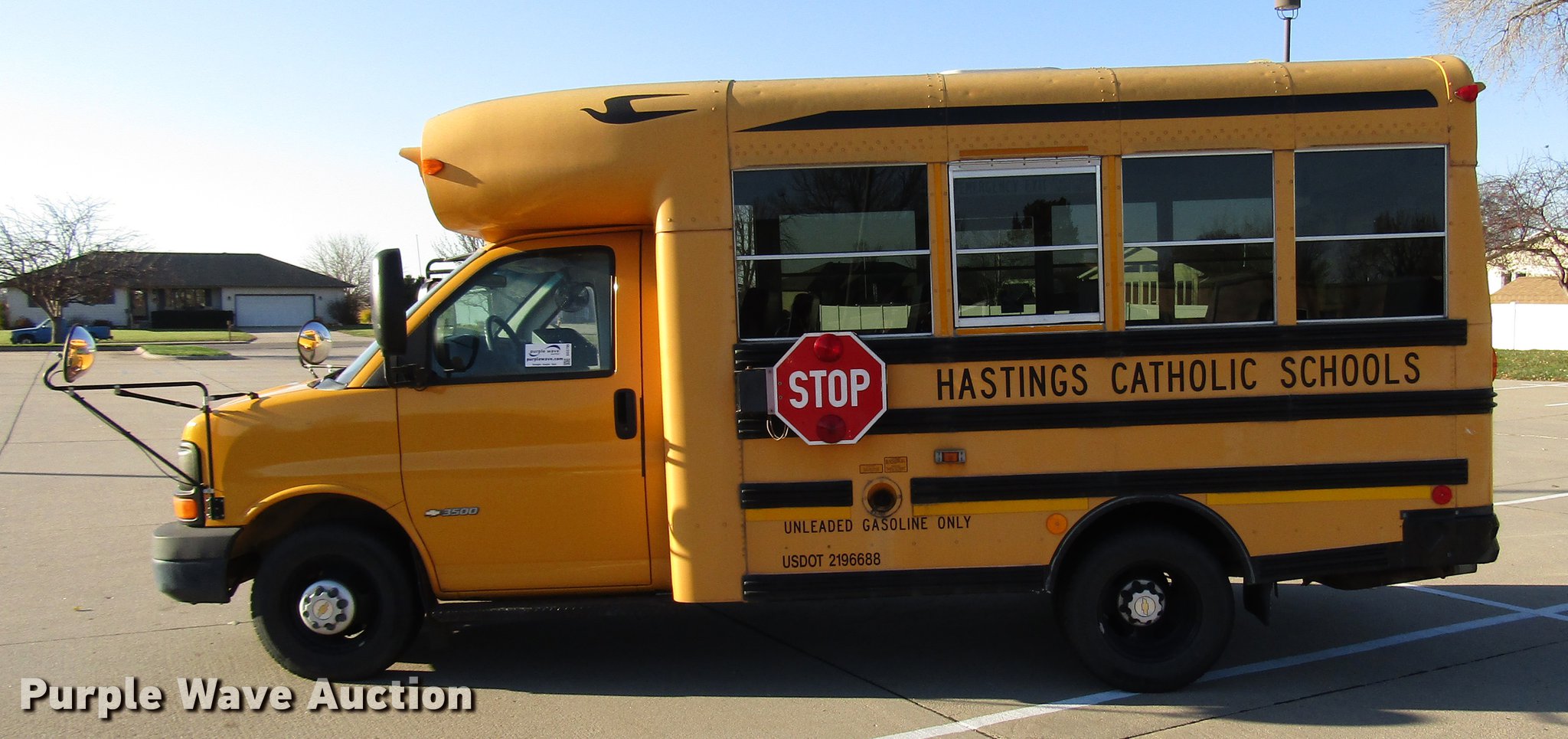 Purple Wave is selling a used Bus in Nebraska. This item is a 2003 Chevrolet Express 3500 school bus with the following: 8,928 miles on odometer, 6.0L V8 OHV 16V gas engine, Automatic transmission, Single axle, Heat, AM/FM/CD, Overhead storage, 14 passenger capacity, Ceiling, rear, and side emergency exits, Emergency door alarms, Lighted stop sign, Rear tow hooks, Hydraulic brakes, 139" wheelbase, 225/75R16 tires, GVWR 10,000 lbs, Hail damage