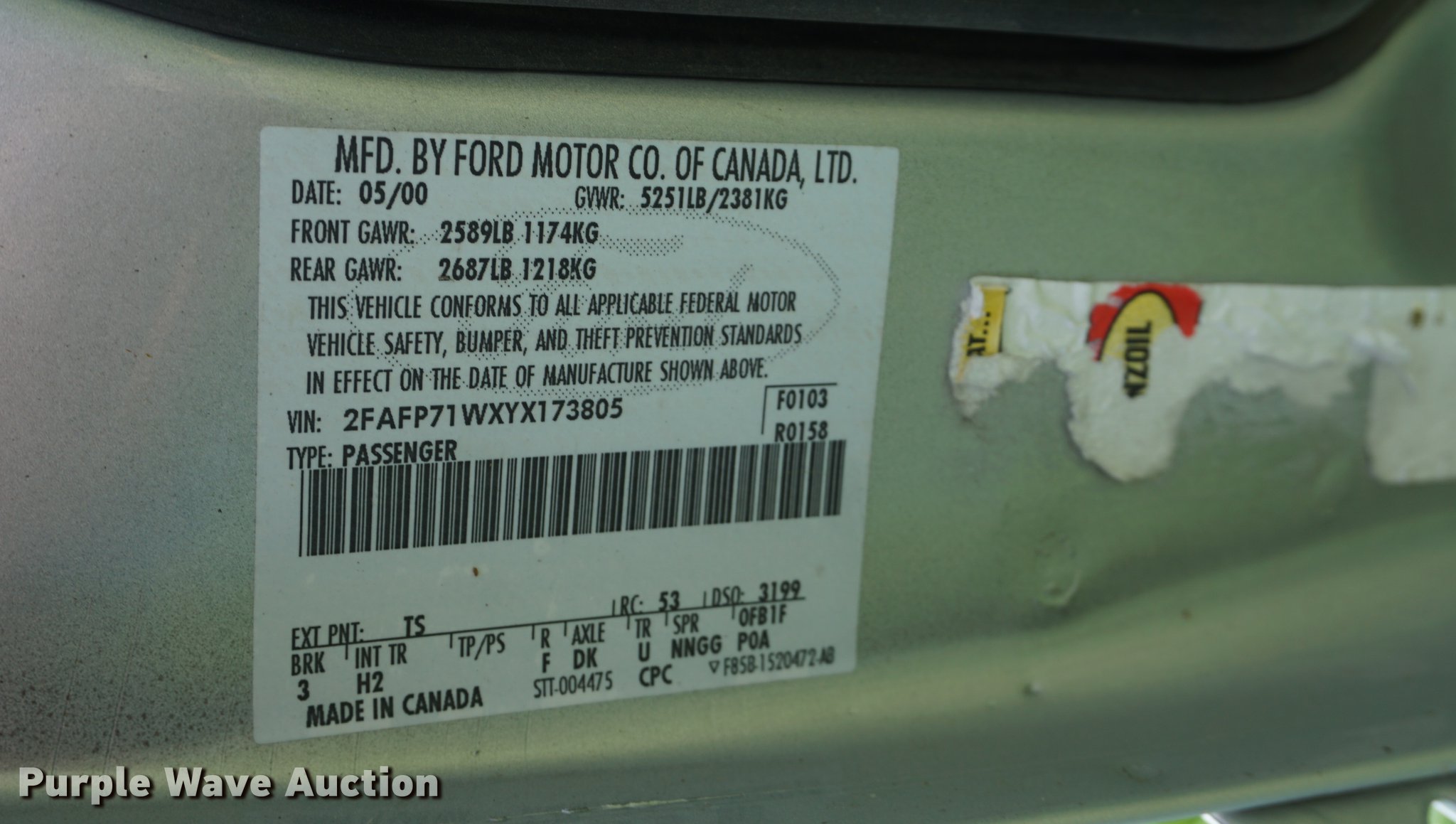 Purple Wave is selling a used Passenger Vehicle in Kansas. This item is a 2000 Ford Crown Victoria Police Interceptor with the following: 137,496 miles on odometer, 4.6L V8 SOHC 16V gas engine, Automatic transmission, AC and heat, Tilt, Cruise, AM/FM, Power windows, locks, mirrors, and seat, Cloth interior, 225/60R16 tires, Engine will not start, Transmission issues, Non-operational unit