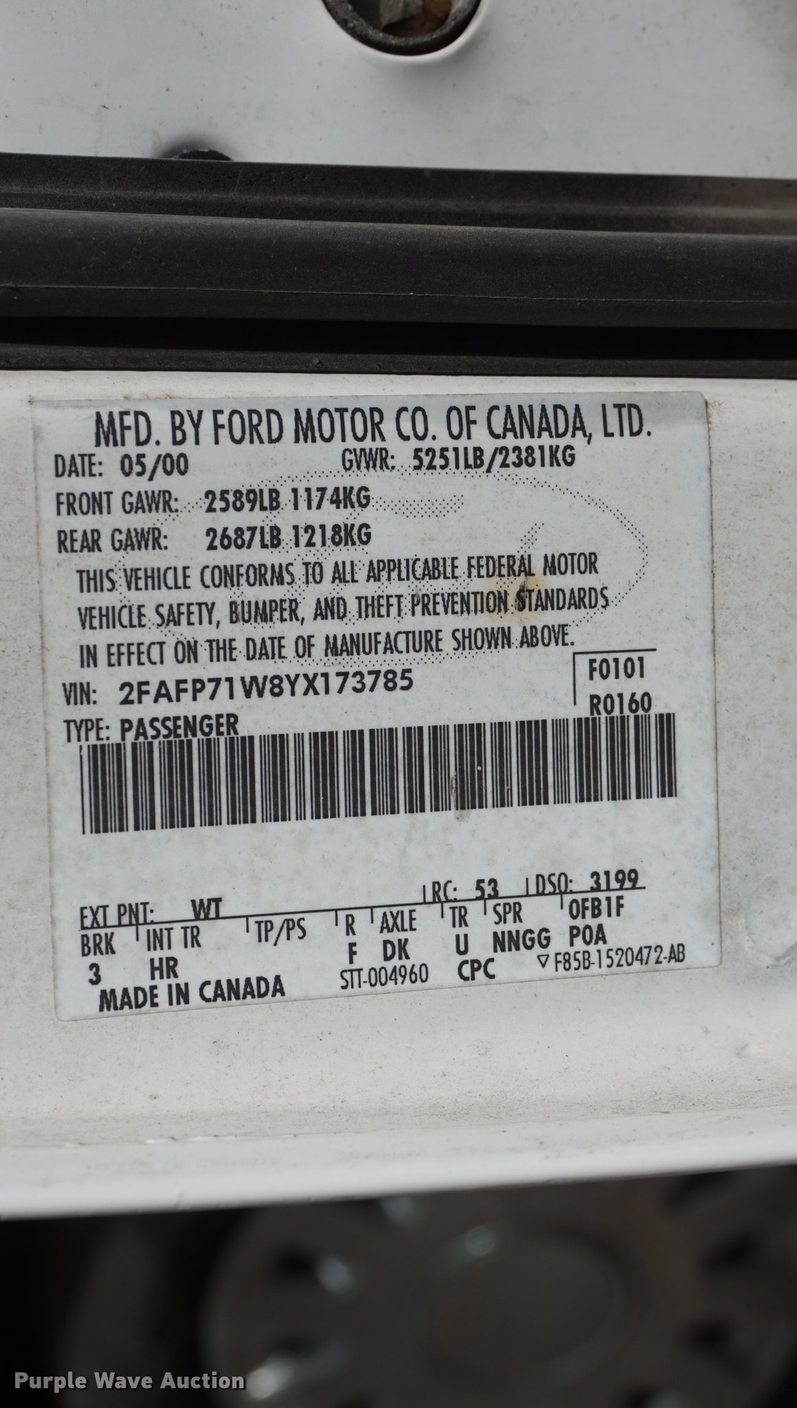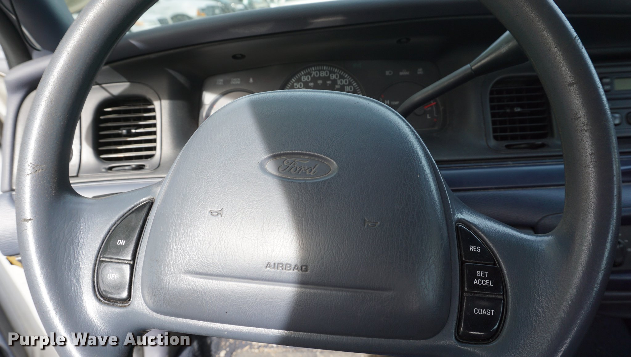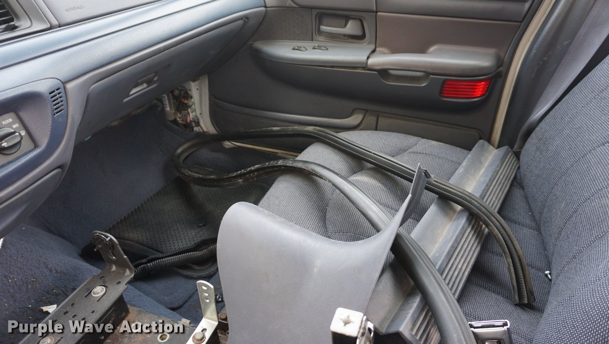 Purple Wave is selling a used Passenger Vehicle in Kansas. This item is a 2000 Ford Crown Victoria Police Interceptor with the following: 92,596 miles on odometer, 4.6L V8 SOHC 16V gas engine, Automatic transmission, AC and heat, Tilt, Cruise, AM/FM, Power windows, locks, mirrors, and seat, Cloth interior, Spot light, 225/60R16 tires, Battery dead, Rear window broken